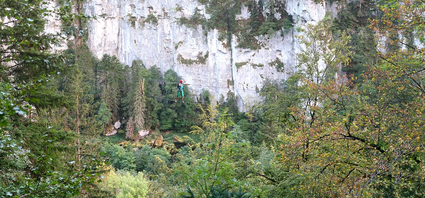 Eigene Seilrollen und Erfahrung mit Seilrutschen für die Tyrolienne nötig.