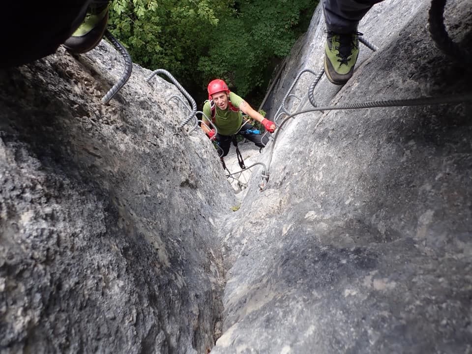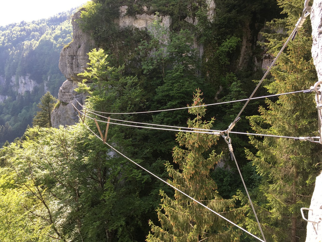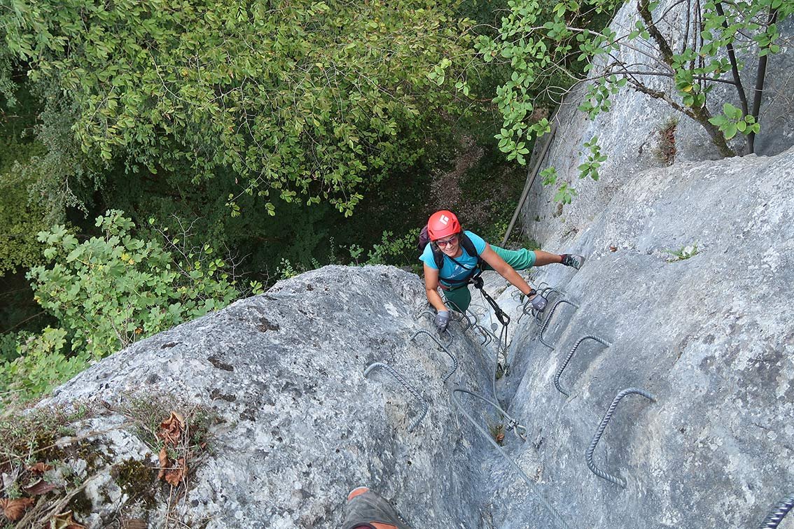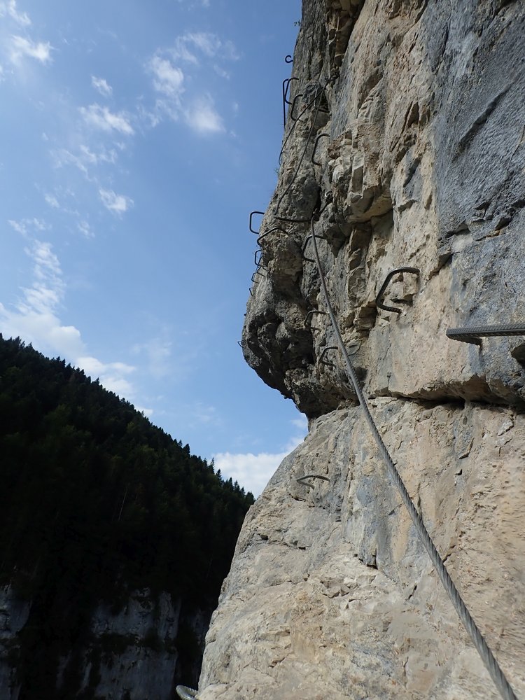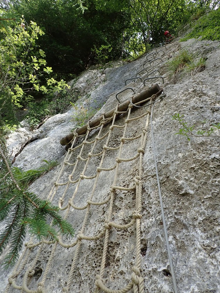 Gut gesichert in typisch französischer Bauart: Durchhängende Sicherungsseile, dafür jede Menge Tritthilfen und Halteklammern.