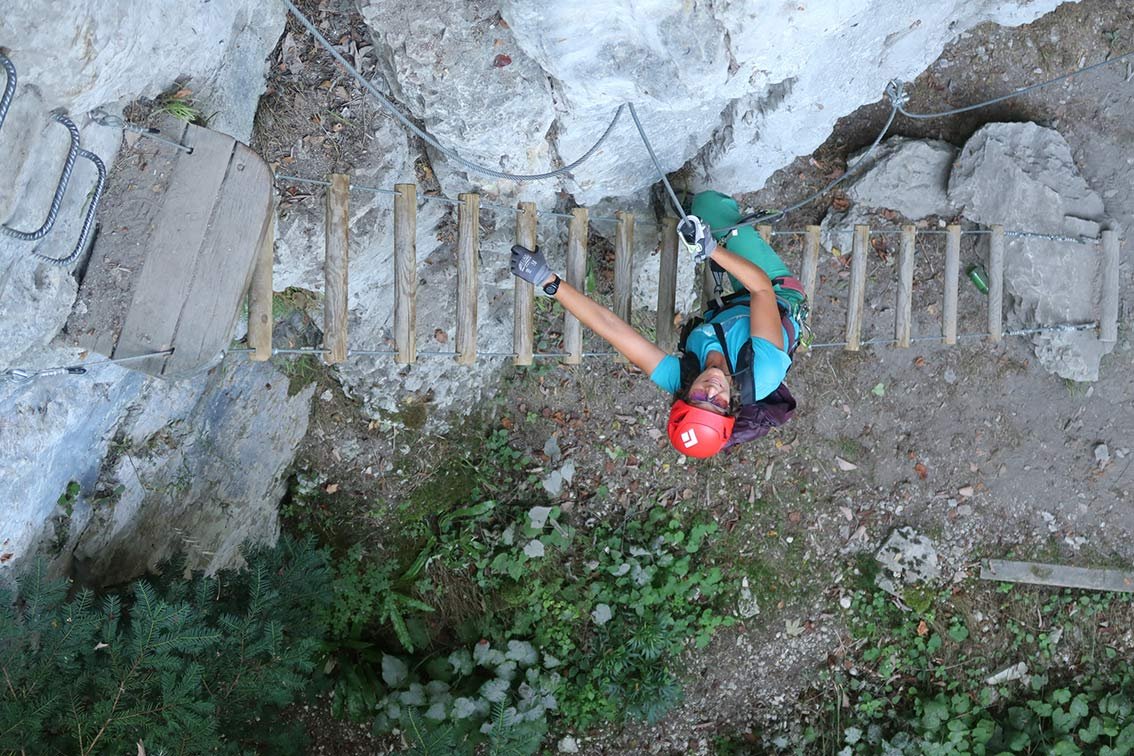 Für die lange Tyrolienne ist eine eigene Speed-Doppelseilrolle sowie Lederhandschuhe (zum eventuellen Bremsen) nötig.