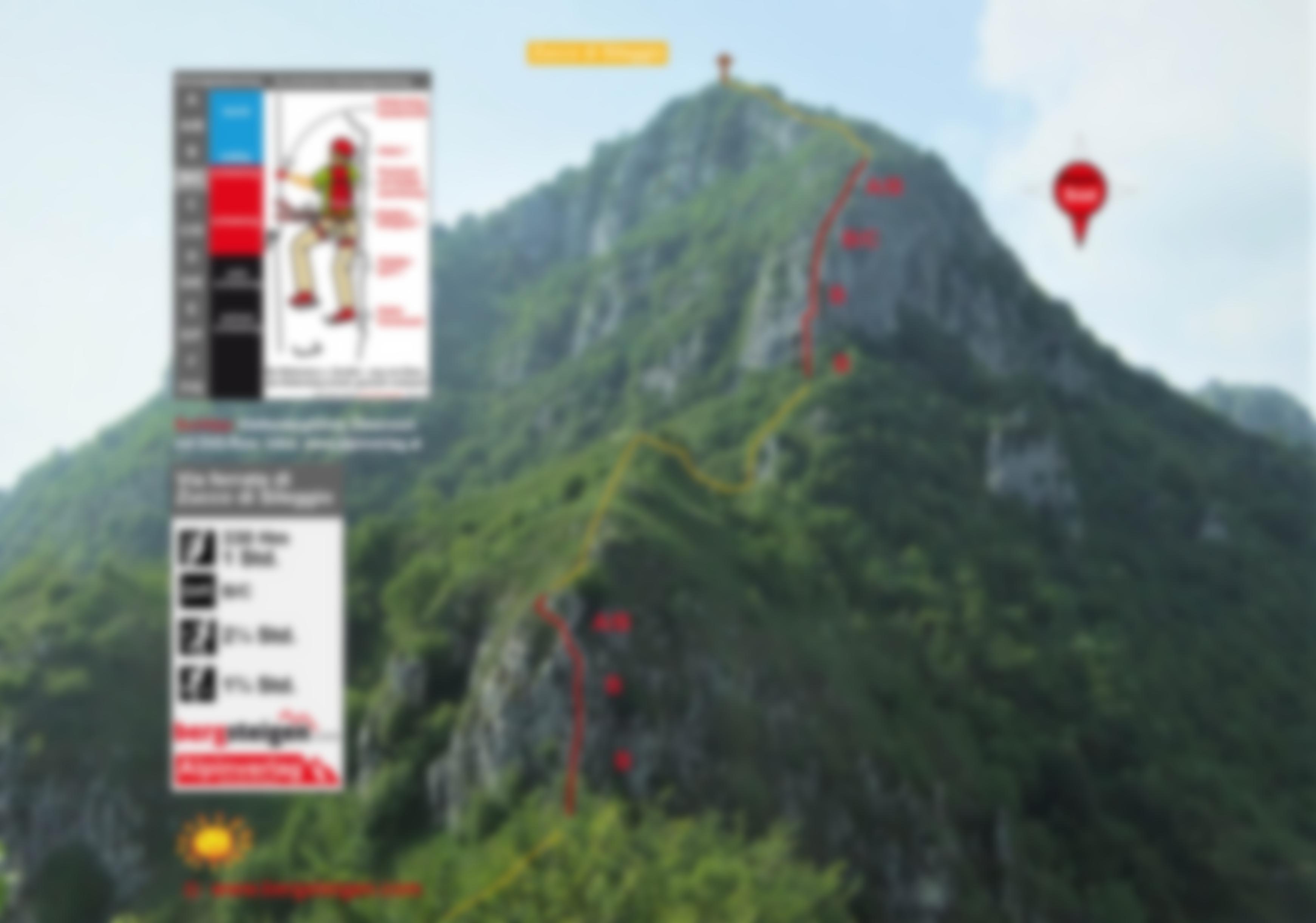 Nach dem Zucco di Tura beginnt der Steig mit einem kurzen steilen Felsgrat den man mit Kettenhilfe zu überklettert, dann folgt Gehgelände zum grasigen Bergsattel am Zucco di Miselo (1051 m) , wo der Weg Nr. 17 B rechts abzweigt (ERA Mandello). Man läuft jedoch den Pfad geradeaus zur Felswand, wo man schon die Leitergruppe sieht. Nach der Leiternpassage gelangt man mit Hilfe von Ketten auf sich zurücklehnendem Felsgelände direkt zum Gipfel.