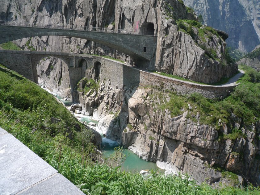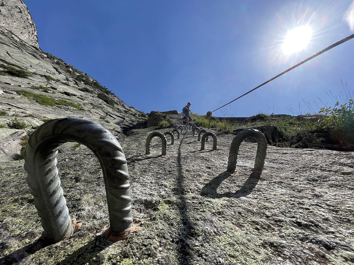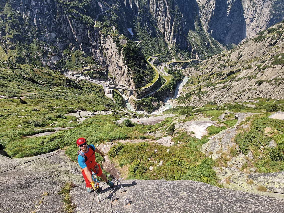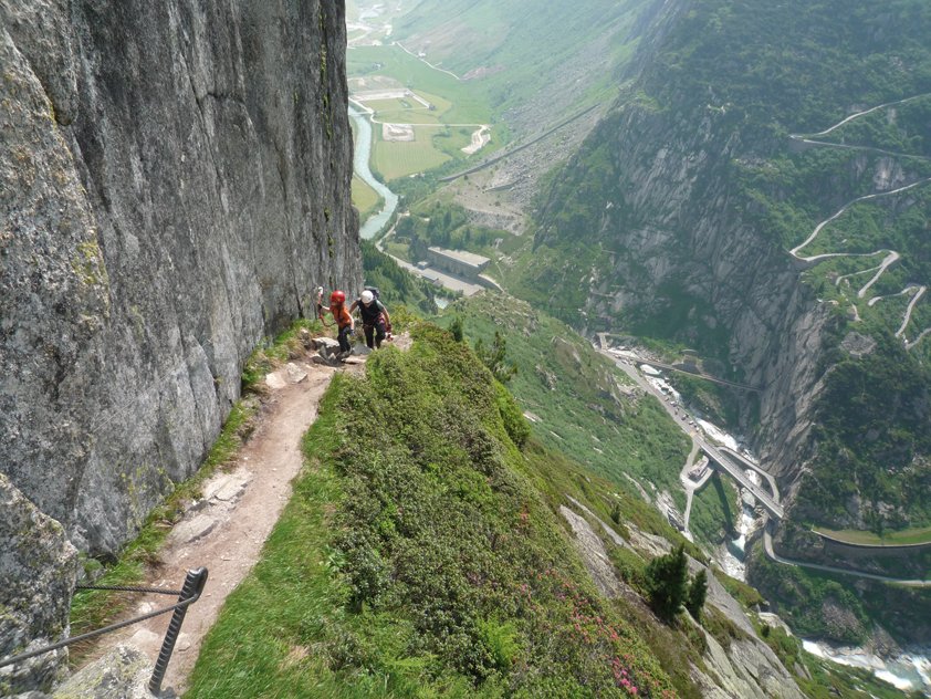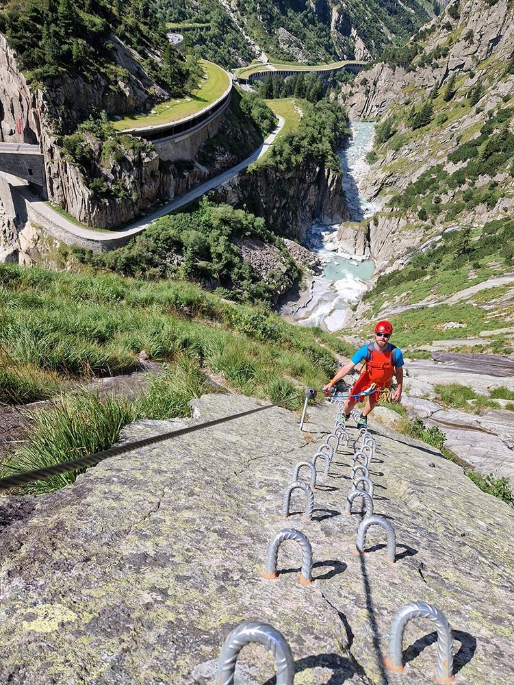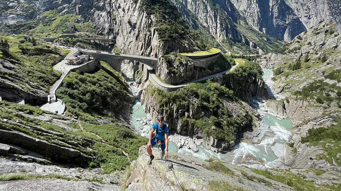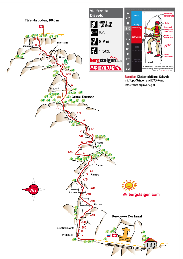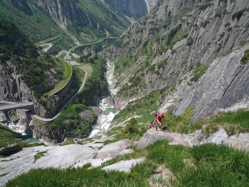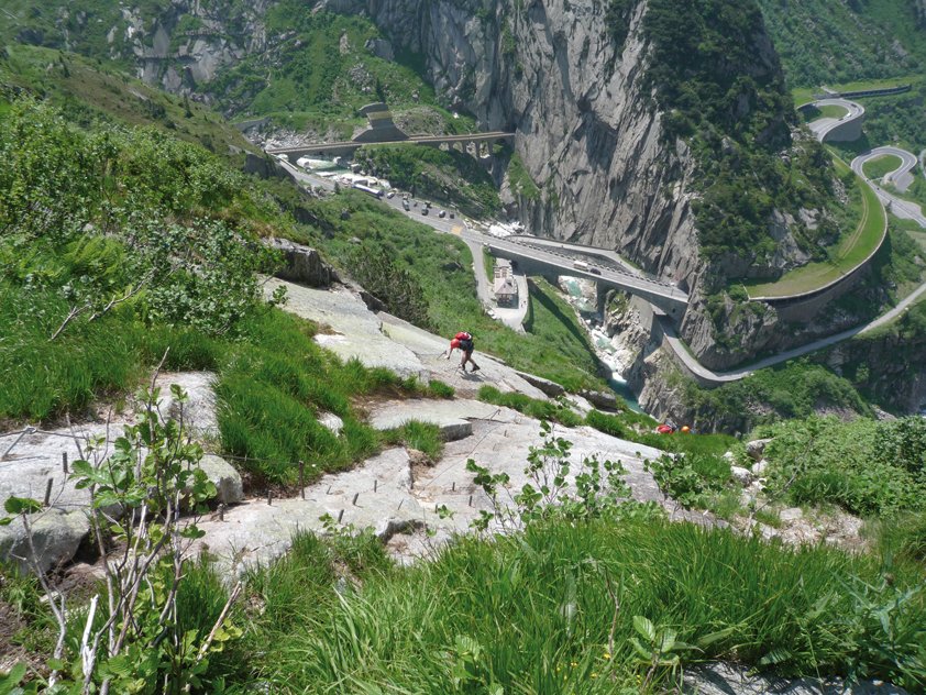 Ferrata Diavolo -beim Bau der Teufelsbrücke sollen die schlauen Urner den Teufel ausgetrickst haben. Das Kompetenzzentrum Gebirgsdienst der Schweizer Armee ließ sich beim Bau des Teufelssteiges jedoch auf keinerlei Mauscheleien ein und so fehlt am 700 m langen Steig oberhalb der Brücke rein gar nichts. Eine Dropout-Stelle zu Beginn wehrt Halbschuhtouristen ab, Sitzbänke sorgen für bequeme Rastmöglichkeiten und die nötige Erholung. An der Wand gibt es 350 Trittstifte, 700 m Stahlseil, 185 Verankerungen und zwei Leitern. Wer sich oben auf dem Steig am Zapfhahn das versprochene Bier zapfen möchte, braucht übermenschliche Hilfe. Der Steig zieht direkt beim Suworow-Denkmal, das an eine erbitterte Niederlage der Grande Nation erinnert, über einen glatten und etwas grasdurchsetzten Granitplattenpanzer hinauf zur Schweizer Fahne.