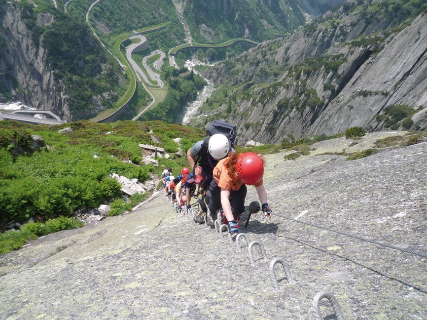 Klassischer Familienklettersteig, der nie besonders schwer ist. Auf dem Klettersteig gibt es aber keine Fluchtmöglichkeit, das sollte man berücksichtigen, wenn man mit Kindern unterwegs ist. Wegen der Nähe zur Straße ist der Steig immer sehr gut besucht. Bei Nässe sind die glatten Platten und Graspassagen gefährlich. Achtung: Man parkt den PKW besser in Andermatt - bei der Teufelsbrücke limitierte Parkzeit und auch der Parkraum ist dort begrenzt.