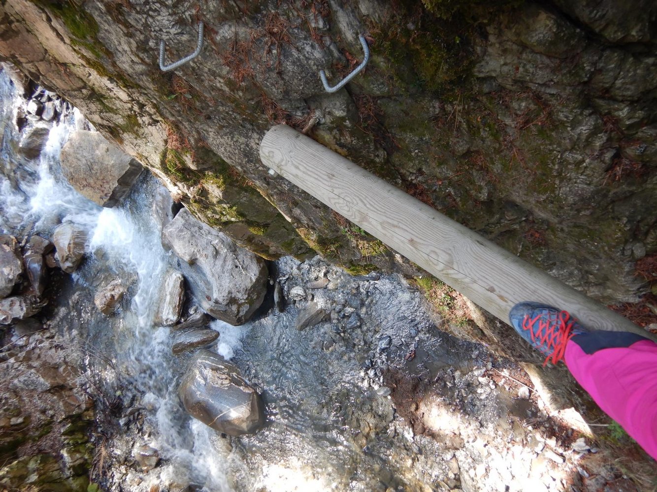 Vom KS-Parkplatz über eine kleine Holzbrücke, dann links abwärts auf einem Forstweg, davon zweigt dann links der Steig zum Einstieg ab.