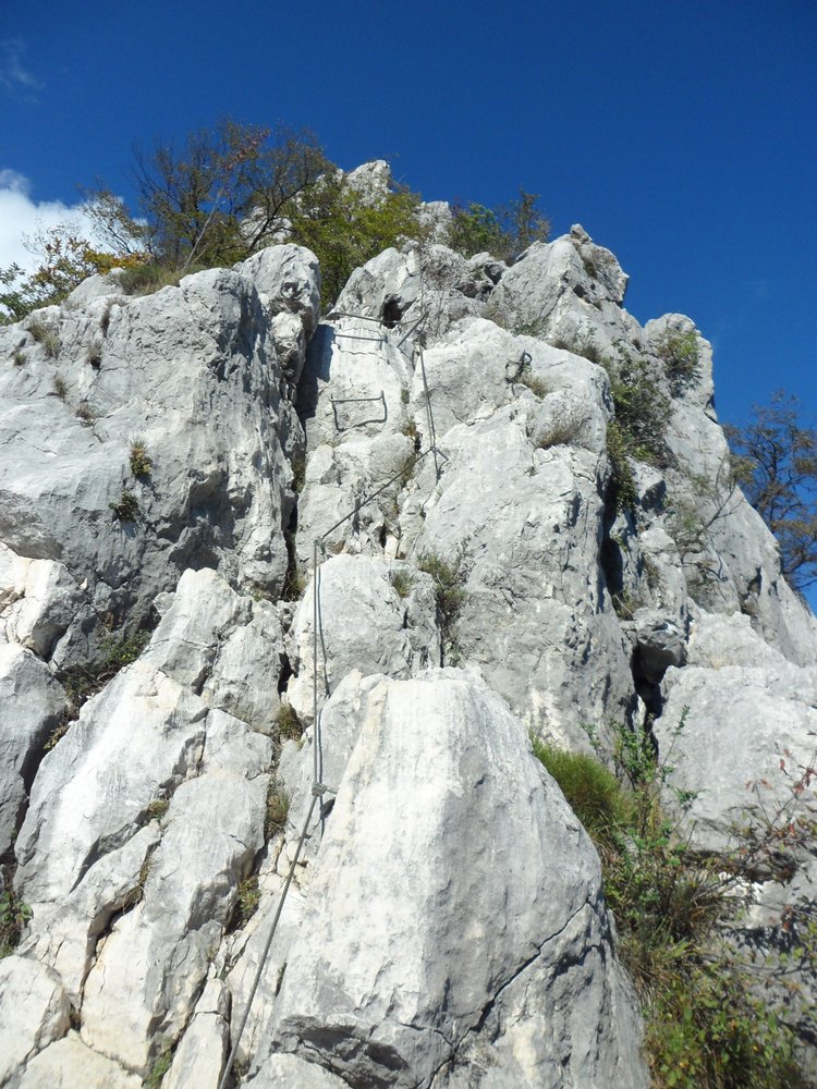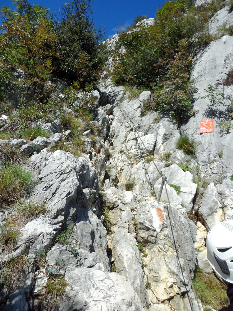 Die Ferrata ist durchwegs mit einem Stahlseil gesichert, es gibt aber auch einige kurze, ungesicherte Passagen.