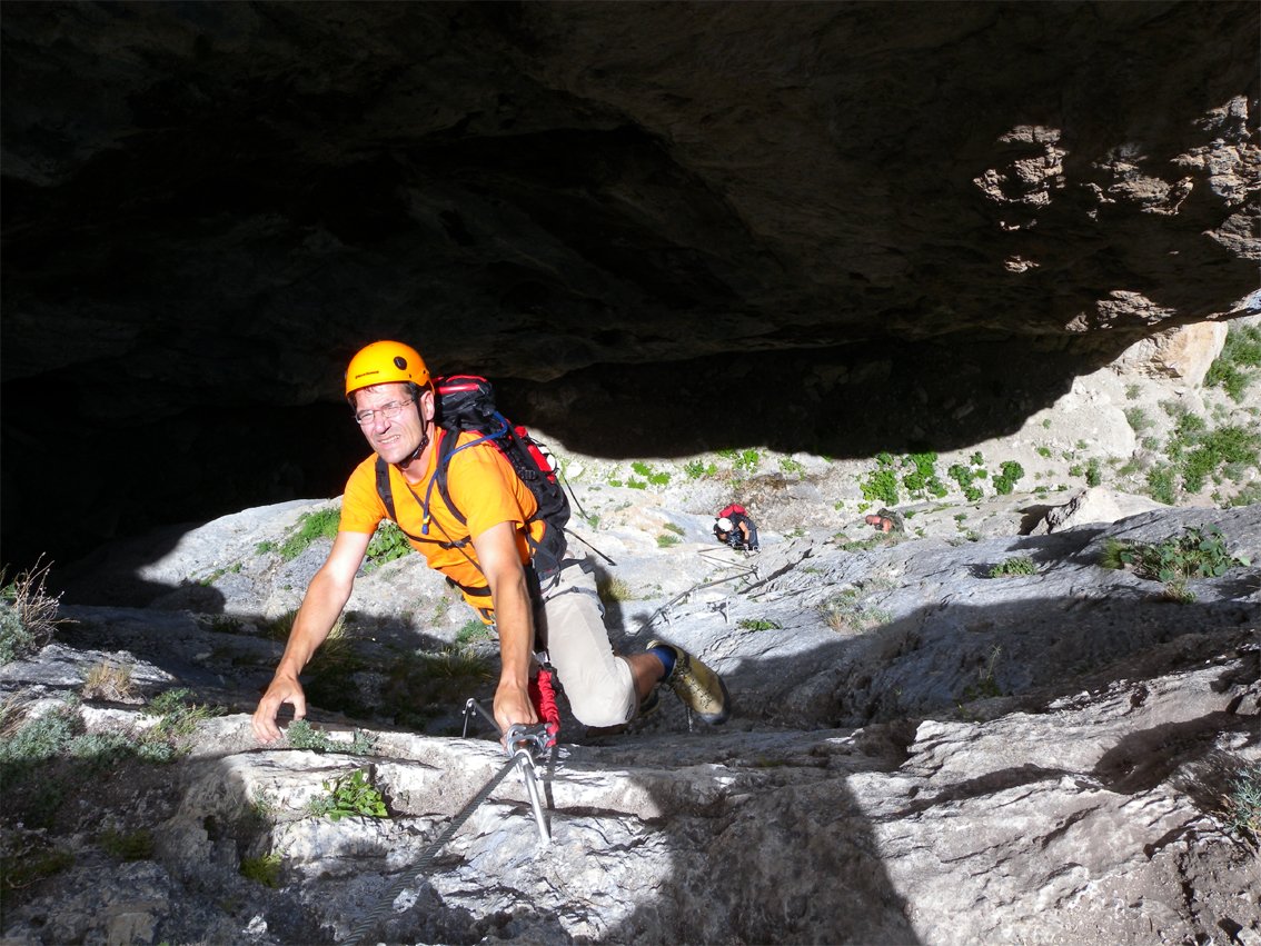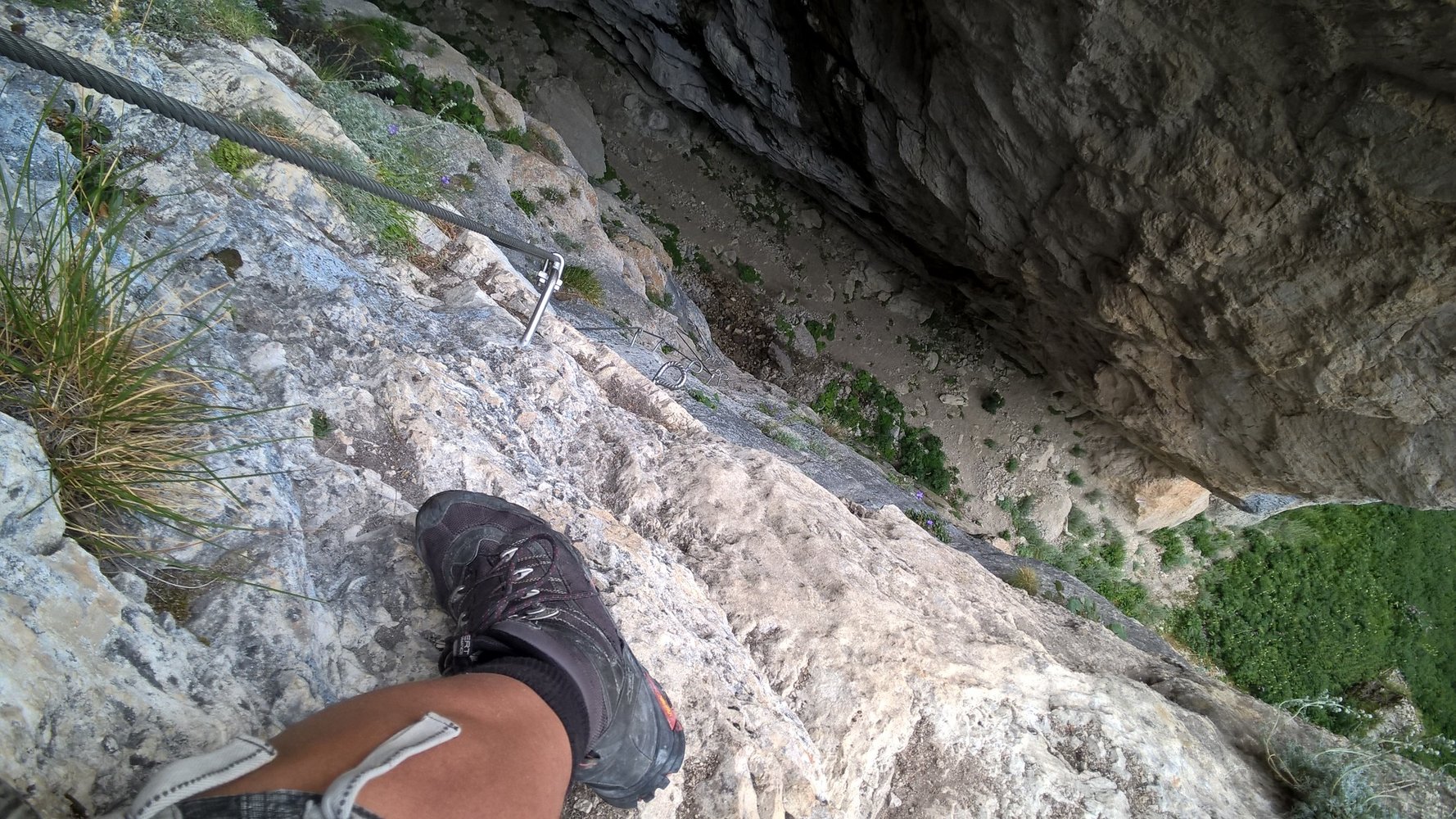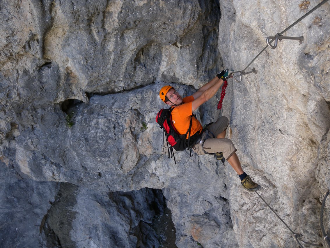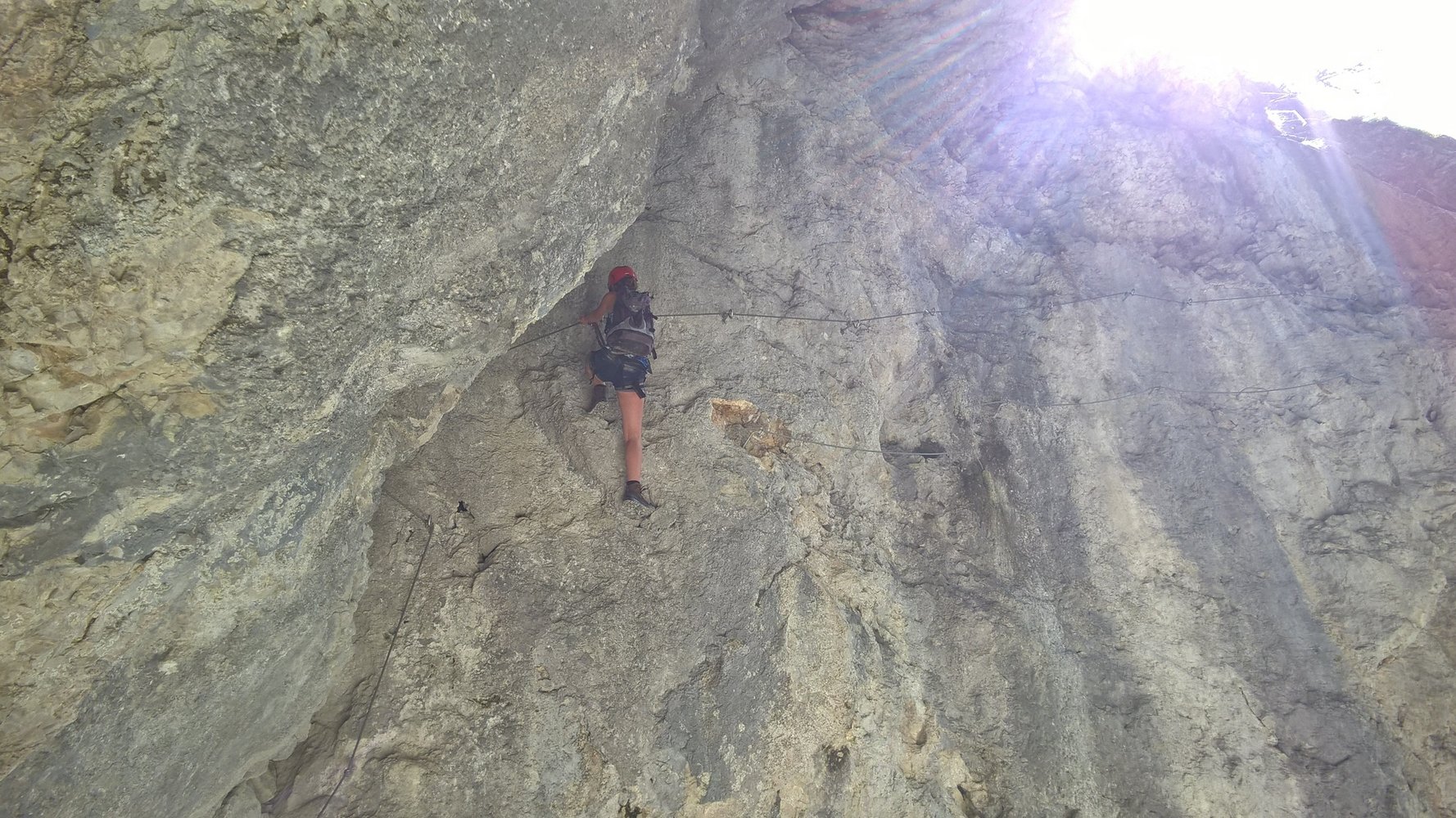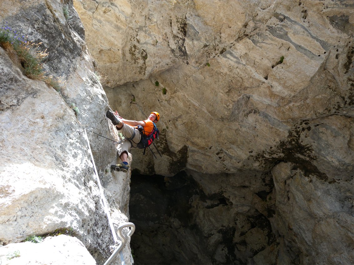 Gut mit Stahlseil gesichert - die kurzen Abstände bei den Verankerungen sind uns positiv aufgefallen! Die "Seil-Klammern" und "Trittschlingen" sind aber etwas gewöhnungsbedürftig.