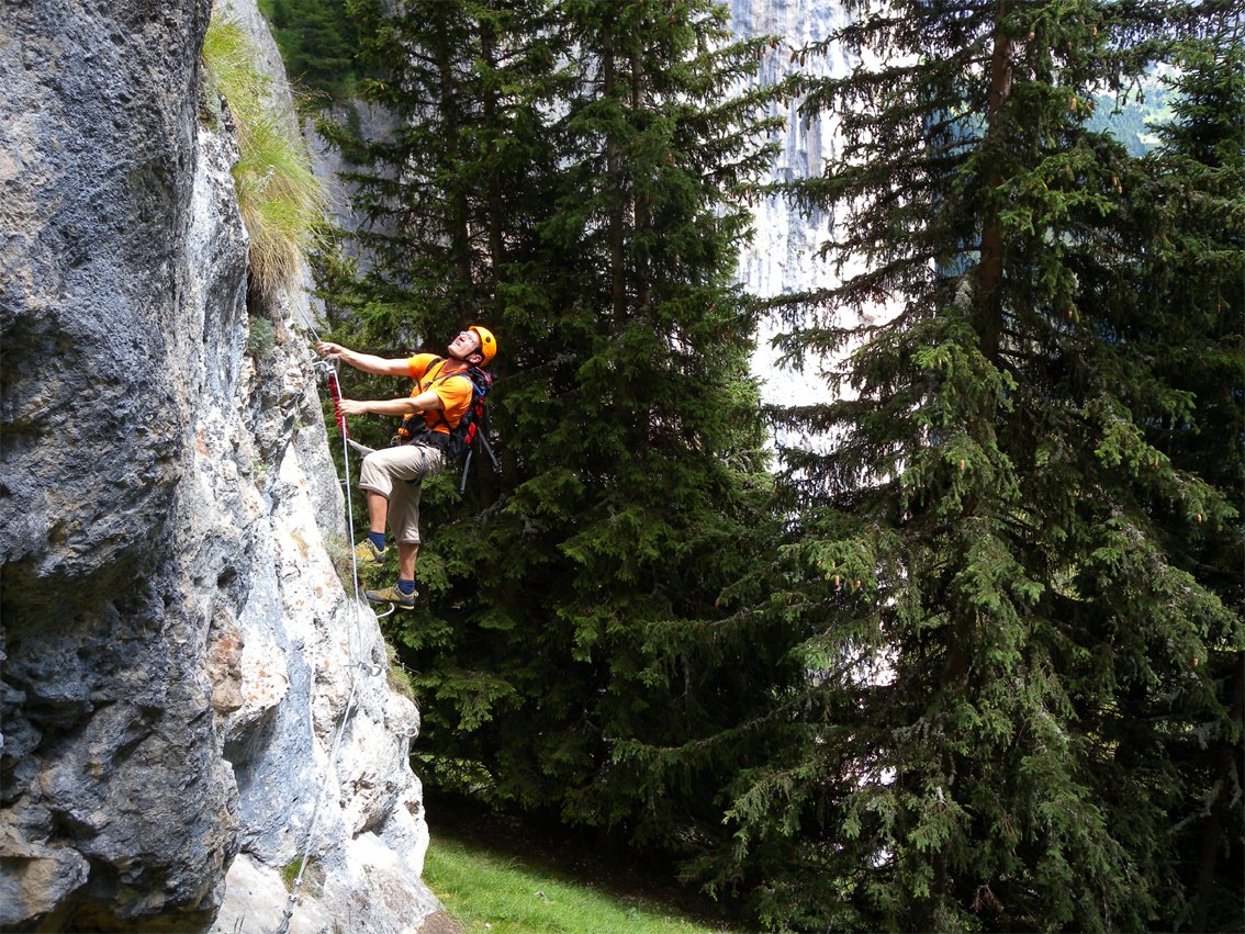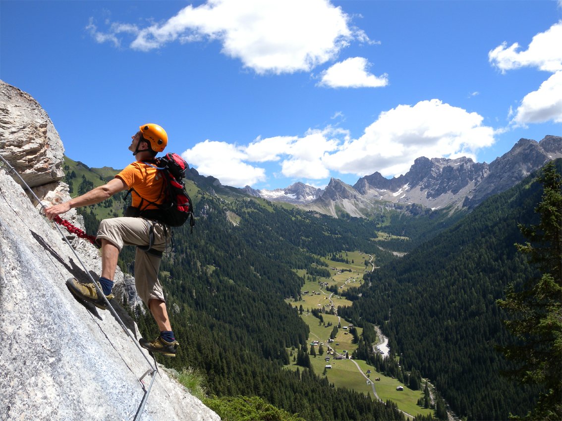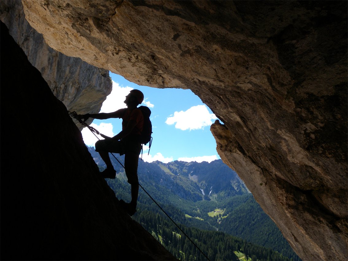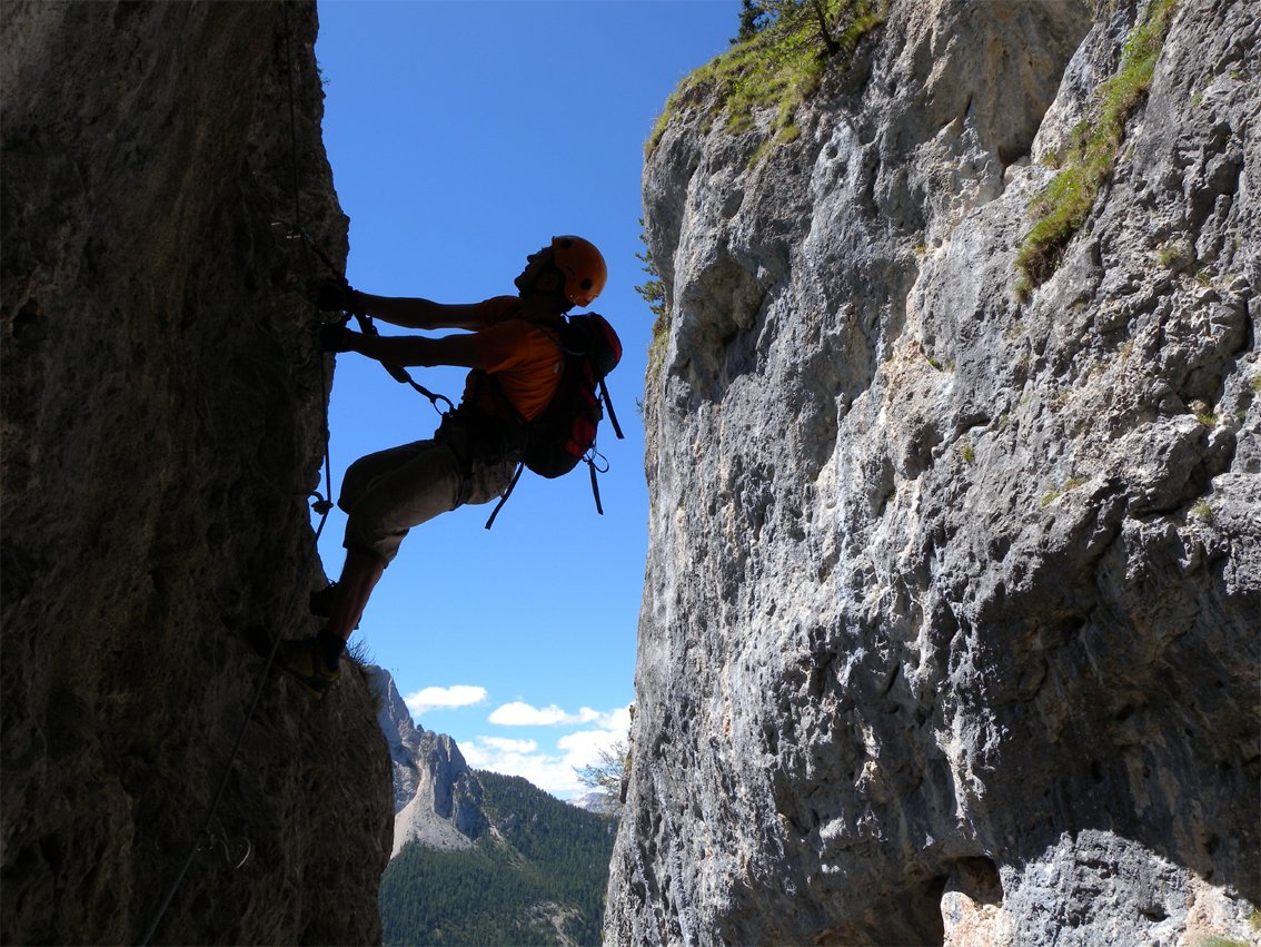 Diese kühne Ferrata im Val di San Nicolo ist vielleicht der schwerste Klettersteig der Dolomiten! Super Linienführung durch einen gigantischen Überhang und tolle landschaftliche Ausblicke machen diese Tour zum wahren Genuss für extreme Klettersteiggeher. Aber Achtung – unten im überhängenden „Dom“ wartet eine sehr knackige Schlüsselstelle. Wer die gemeistert hat, kann auf dem folgenden Band beim Verschnaufen den schönen Ausblick ins Val di San Nicolo genießen. Oben wird es dann nicht mehr so schwer. Beim Ausstieg steht man auf einer Art Aussichtsterrasse mit tollem Blick zu den benachbarten Gipfeln.