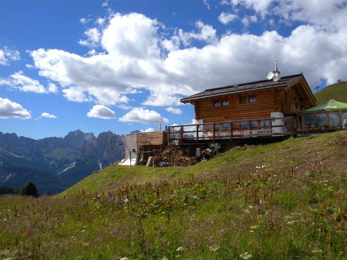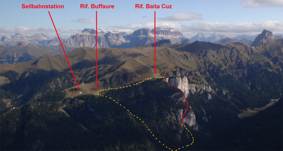 Vom Rif. Baita Cuz auf dem Schotterweg zum Rif. Buffaure (2044 m) und von dort entweder direkt zu Fuß hinunter ins Tal abstiegen oder mit der Seilbahn hinunter nach Pozza di Fassa. Alternativ zweigt vor dem Rif. Baita Cuz rechts (Punto Panoramico Maerins) der Panoramawanderweg ins Val di San Nicolo ab. Auf diesem hinunter bis zur Straße nach Sauch (Shuttlebusstation).