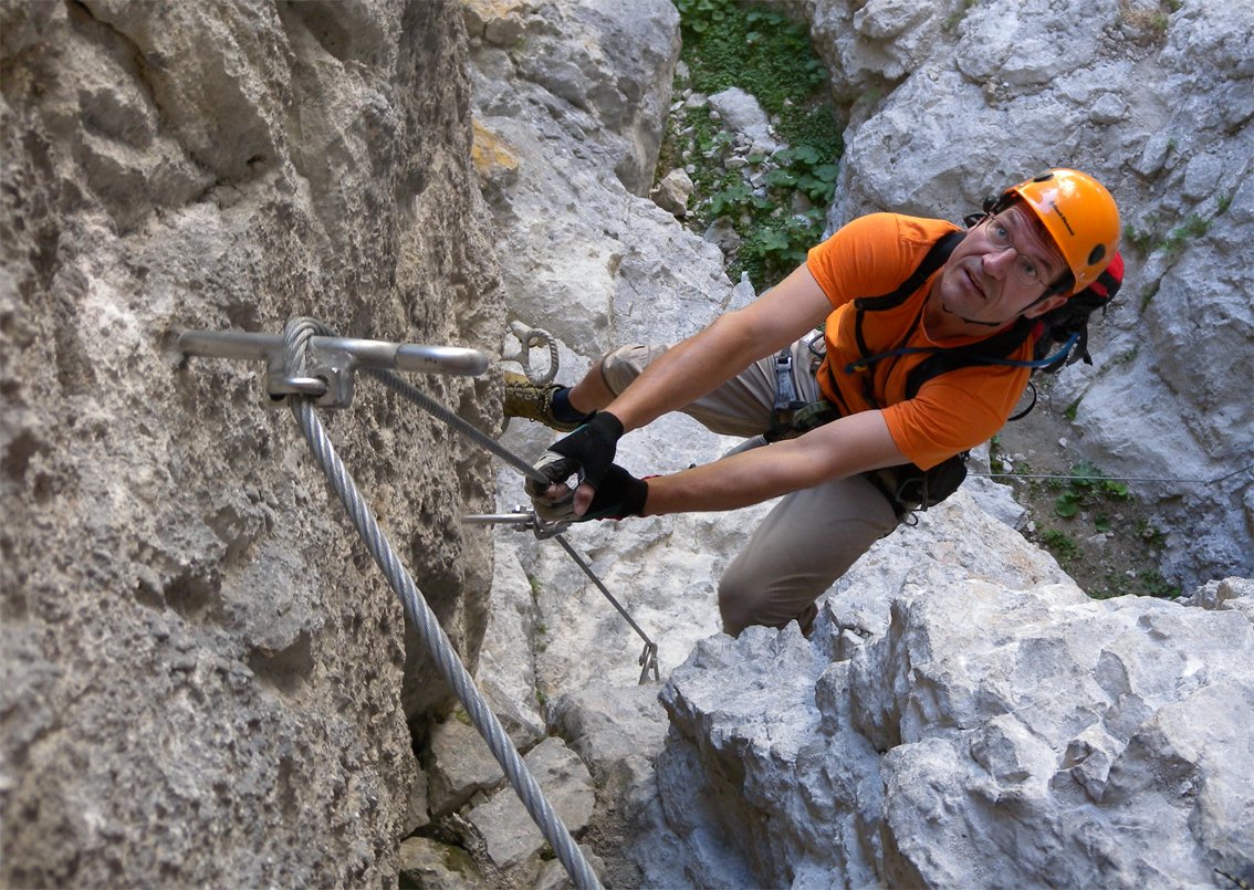 Komplette Klettersteigausrüstung und Helm, für schwächere Geher ein Sicherungsseil!