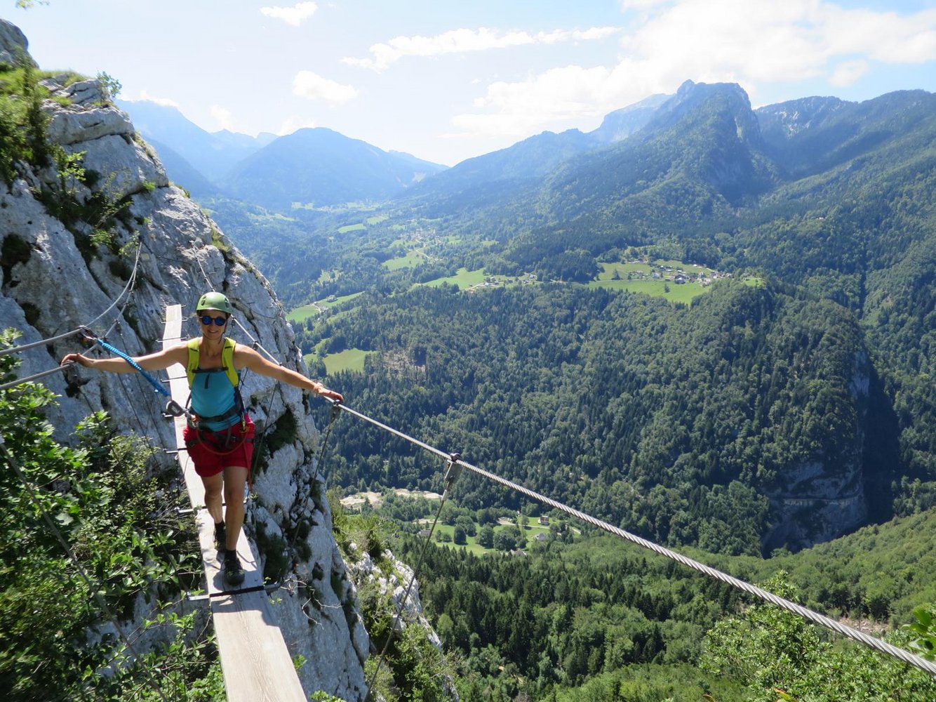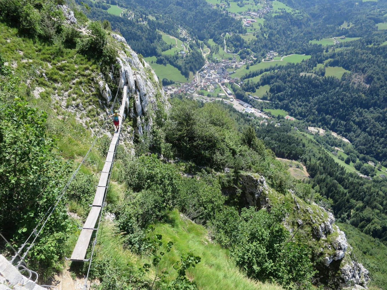 Im Chartreuse Massiv zwischen Chambéry und Grenoble sind die Franzosen unter sich und genießen die auf der Hochebene in bewaldete Täler eingebetteten Berge, malerischen Ortschaften und den Kräuterlikör. Ein besonders schöner Ort ist Saint Pierre-d'Entremont mit seinen malerischen Häusern. Direkt über dem Ort ragt der Rocher Veyrand in den Himmel und durch seine Südwand führt der gleichnamige Klettersteig, der aus zwei Teilen besteht. Teil eins schlängelt sich gemäßigt (B/C) einen Grat entlang und endet bei der Hängebrücke. Teil 2 quert entlang kleiner Höhlen unter die Gipfelwand und sucht sich dort den steilsten Weg nach oben.