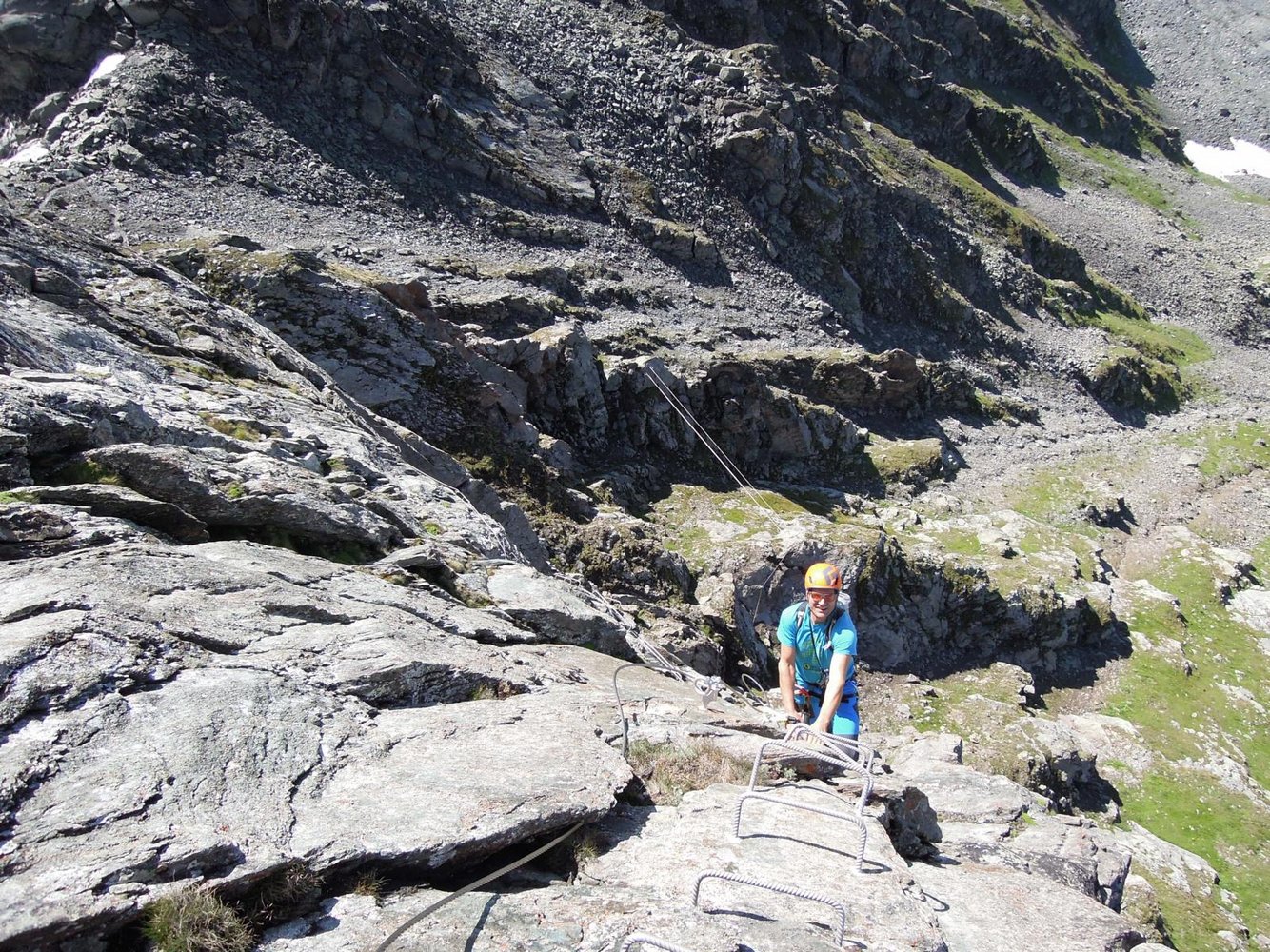 Vom Gipfel den Seilen steil (B) in eine Scharte absteigen und zwischen den Gipfeln über den Abstiegs-Klettersteig (B) abklettern und dann über den Zustiegsweg zur Bergstation retour. Siehe Topo und Übild!