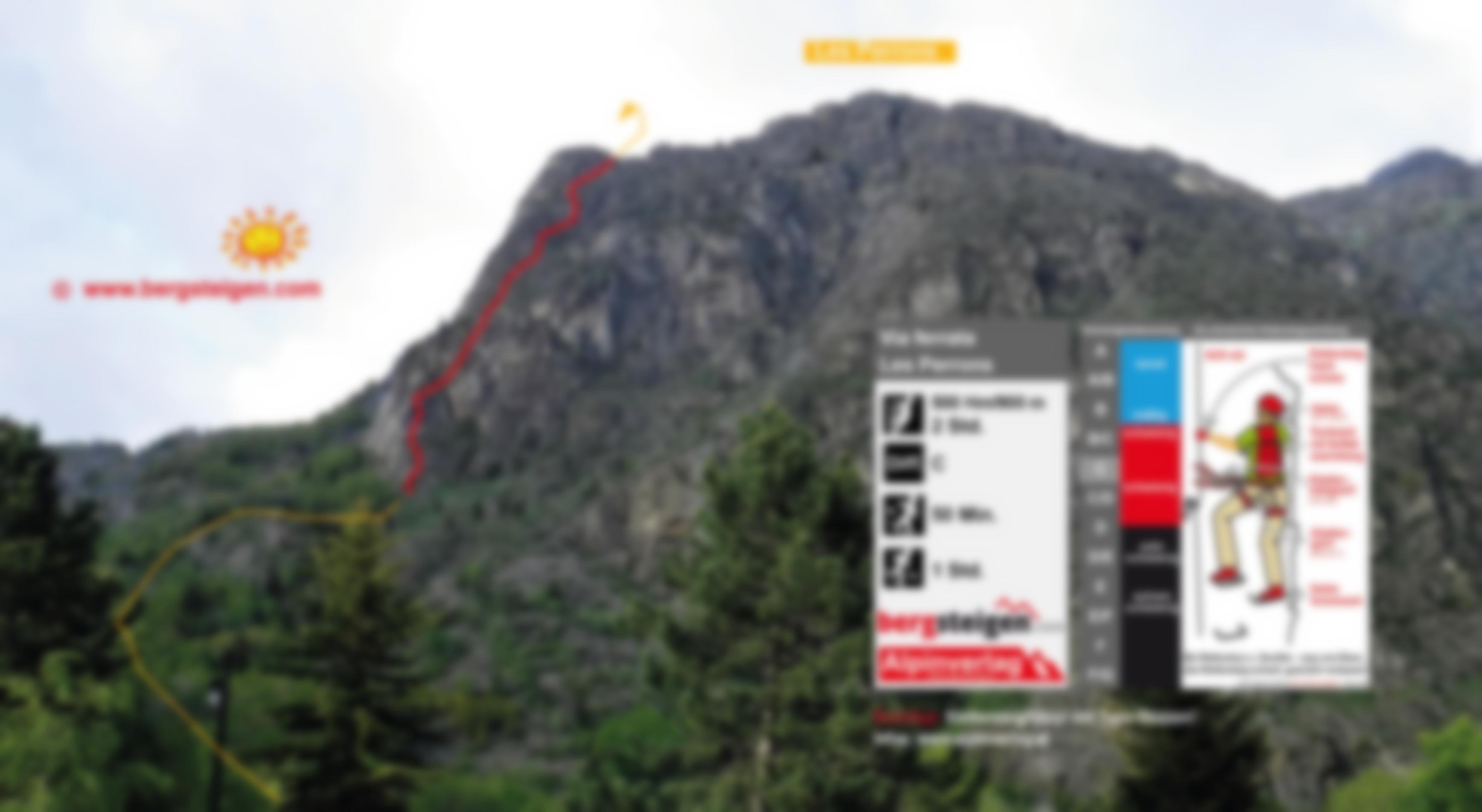 Der Beginn erfolgt schräg links auf Eisenbügeln links vom Seil eine erdreiche, flache Felsrinne hinauf zu einem begrünten Felsvorsprung. Weiter hinauf führt das Seil links von einer Verschneidung zu einem Felsdach (Schildchen:N 1390). Rechtsdavon wird eine Felsstufe senkrecht hoch überwunden zum Felsabsatz (L 1435). Danach wendet man sich nach links hinauf zu einer großen Felsschuppe, an der man rechts vorbei klettert (K 1470). Nächste Felsstufe führt zur Höhe Y 1515. Dann folgt eine luftige senkrechte Wand mit einer kleinen überhängenden Felsschuppe (H 1545). Anschließend wird nach rechts hinauf gequert (G 1564). Letztes Stück ist dann noch einmal steil hoch (F 1605). Dann erreicht man Gehgelände auf einer breiten Grasterrasse (E 1640). Ab hier sieht man links hinüber zum Wintersport-Retorten-Dorf Lex Deux-Alpes. Man geht nun den oberen Felskopf des Berges an (C 1675). Auf Eisenbügeln gelangt man zur Schlüsselstelle, einem Überhang (B 1700), den man aber mittels eiserner Griff- u. Tritthilfen überwindet zum Ausstieg (A 1750). Dort gelangt man auf breiten Grasbuckel, der das westliche untere Ende des Bergrückens vom Les Perrons darstellt vor dem Felsabbruch (1¾ Std.). Auf dem Grasplateau steht eine Stange mit Luftsack für die Gleitschirmflieger.