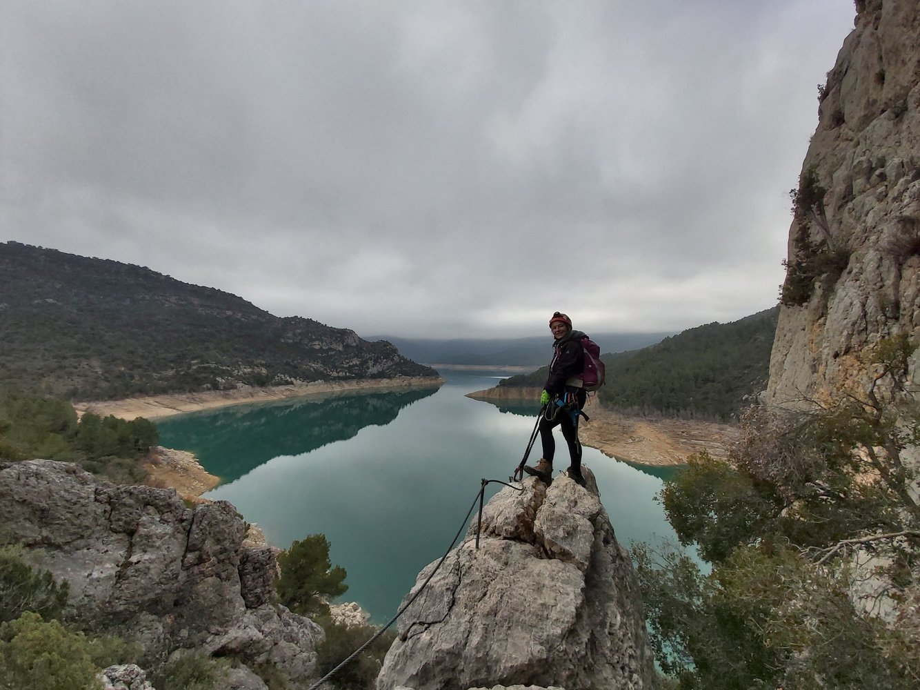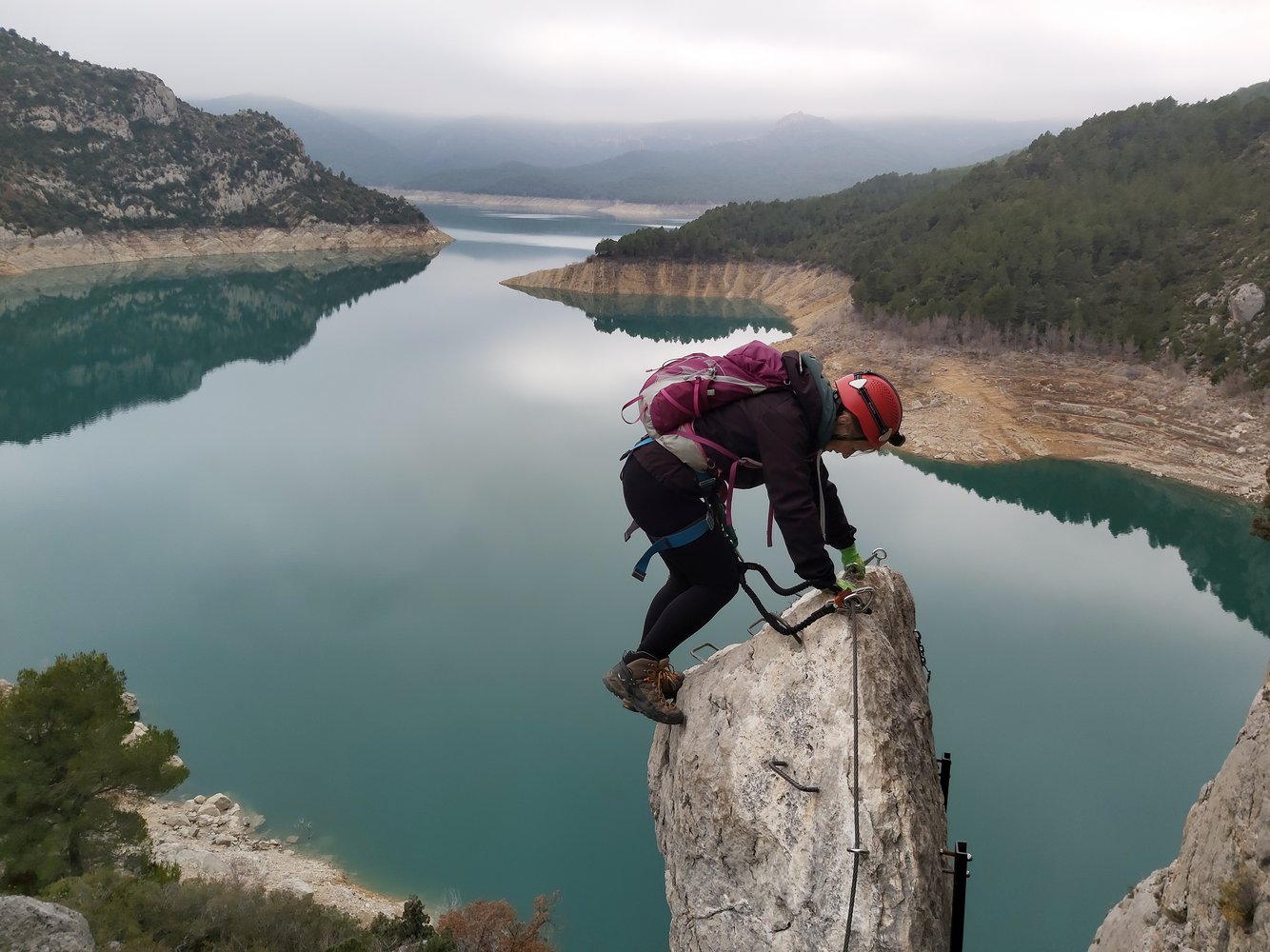 Vom Parkplatz folgen wir dem breiten Weg nach Norden, um am Schild zur Mare de Déu de la Pertusa nach links abzubiegen. Wir halten uns von Anfang an südseitig des Grates und folgen dem Trampelpfad hinunter zum See. Nach einem gekennzeichneten Felsdurchschlupf stehen wir auch schon am Einstieg zu Via Ferrata los Teletubbies.