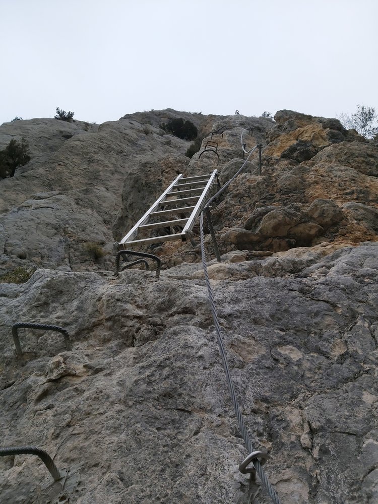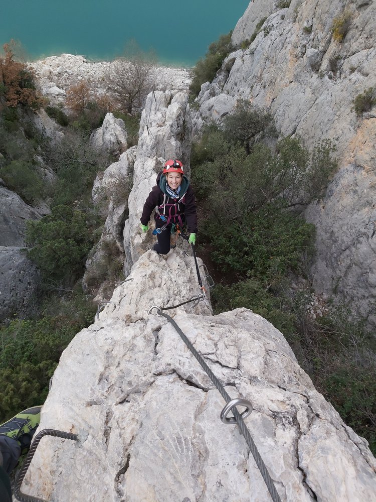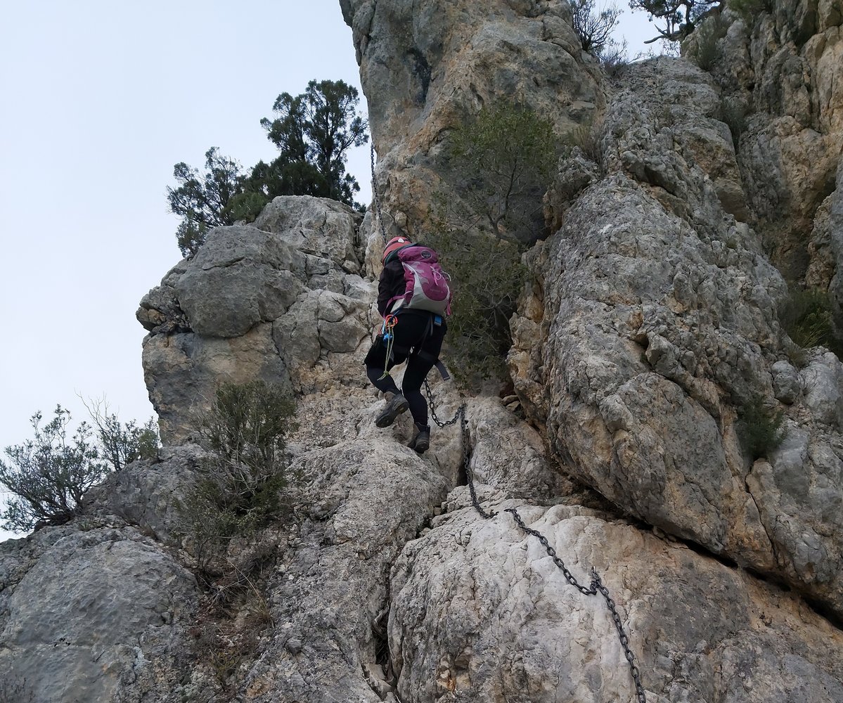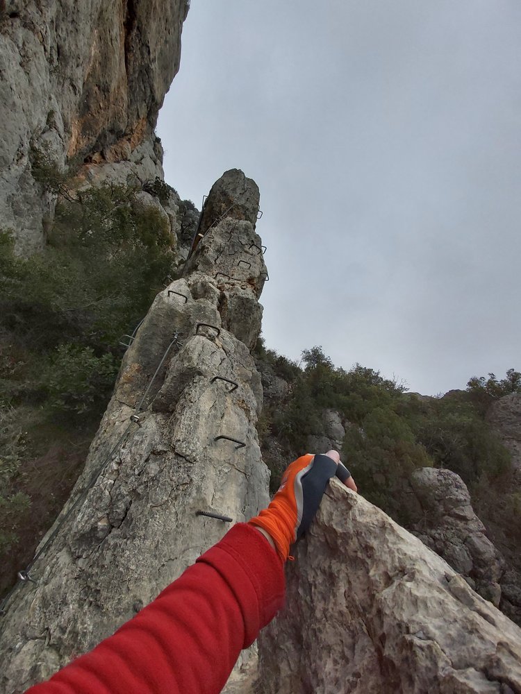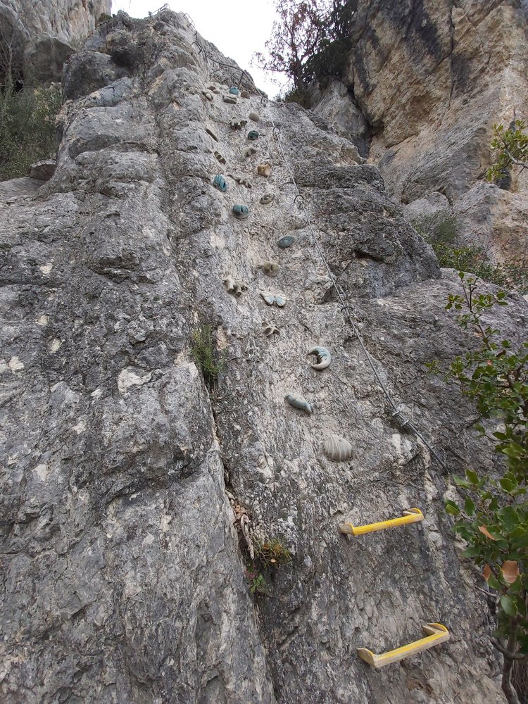Künstliche bunte Klettergriffe zieren den Einstiegsbereich. Viele Klammern, Ketten und eine Leiter führen uns in einfachem Gelände zu immer schmaler werdendem Fels bis wir uns schließlich nur noch auf dem Grat bewegen. Es folgt leichtes Gelände und wir treffen auf den Einstieg zu VF Olmo-Soler. Um die Aussicht in vollem Umfang genießen zu können, entscheiden wir uns dem VF Olmo-Soler nach links zu folgen.