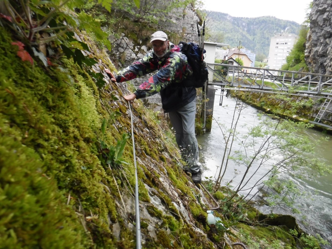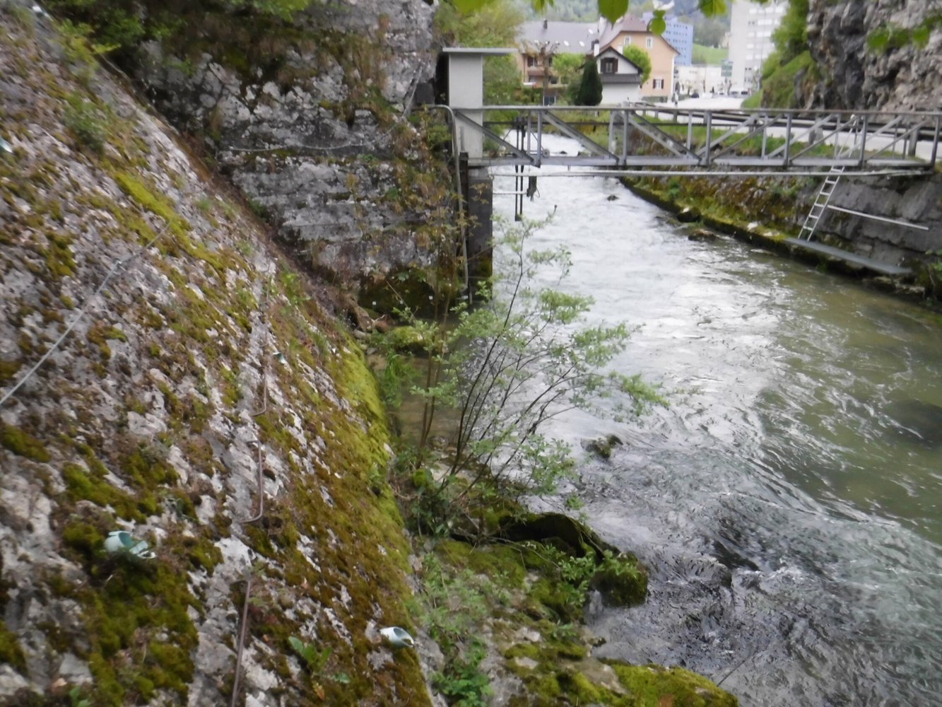 Am Kasten steigt man links über die Brüstung zur Leiter und auf dieser hinab bis knapp über den Fluß. Dann um die Felsecke auf löffelförmigen Trittblechen rechtsherum auf zum gemauerten, ca. 50° schrägen Bahndamm. Diesem folgt man in nördliche Richtung auf langen U-förmigen Eisenbügeln über dem Wasser. Als „Handlauf“ dient das an Fels und Bahndamm fixierte Sicherungsseil. Auf aus Bandstahl gebogenen Trittbügeln steigt man hinab auf einen schmalen Weg am rechten Flußufer. Auf diesem zu einer beginnenden Bandstahl-Bügelreihe nach oben zum Maschendrahtzaun auf Gleishöhe. Dabei schreitet man über einen aus 3 Eisenstangen bestehenden Metallsteg über eine schmale, wasserführende Blechrinne. 3 Holzbretter bilden den nächsten Steg an einer abschüssigen erdigen Stelle. Ein weiterer zu einer Felskante. Diese wird luftig direkt über dem Wasser hinab umrundet. Anschließend führt das Sicherungsseil unterhalb des abgezäunten Bahngleises hinab zu den nächsten Trittbügeln an zweiter Felsnase über dem Wasser. Auch diese wird luftig umrundet zu einem kurzen Sandwegstück. Das Seil endet am 2. Eisenbahntunnel, der nur 10,7 m lang ist. Hier endet auch der kurze Klettersteig (15 min.). Und hier beginnt die erste Seillänge (4 b) durch einen treppenförmigen Kamin im Kalksteinfels, in der 3 Bohrhaken stecken. Hat man ein 60 m Seil dabei, erreicht man nach 5 Seillängen den Ausstieg der populären Kletterroute vom Arête Spéciale über einen Felsgrat nach 140 Hm (2 Std.). Entlang des Maschendrahtzaunes kommt man bis zur Lücke vor dem 3. kurzen Eisenbahntunnel. Auf gegenüberliegender Seite sieht man ein Elektrokabel und ein 10 mm Stahlseil in einem bewaldeten Kanal hochführen zu einer gemauerten Stützbrücke. Unterhalb eines Steinfallgitters endet das Seil. Dieses dient lediglich den Inspektionsaufgaben.