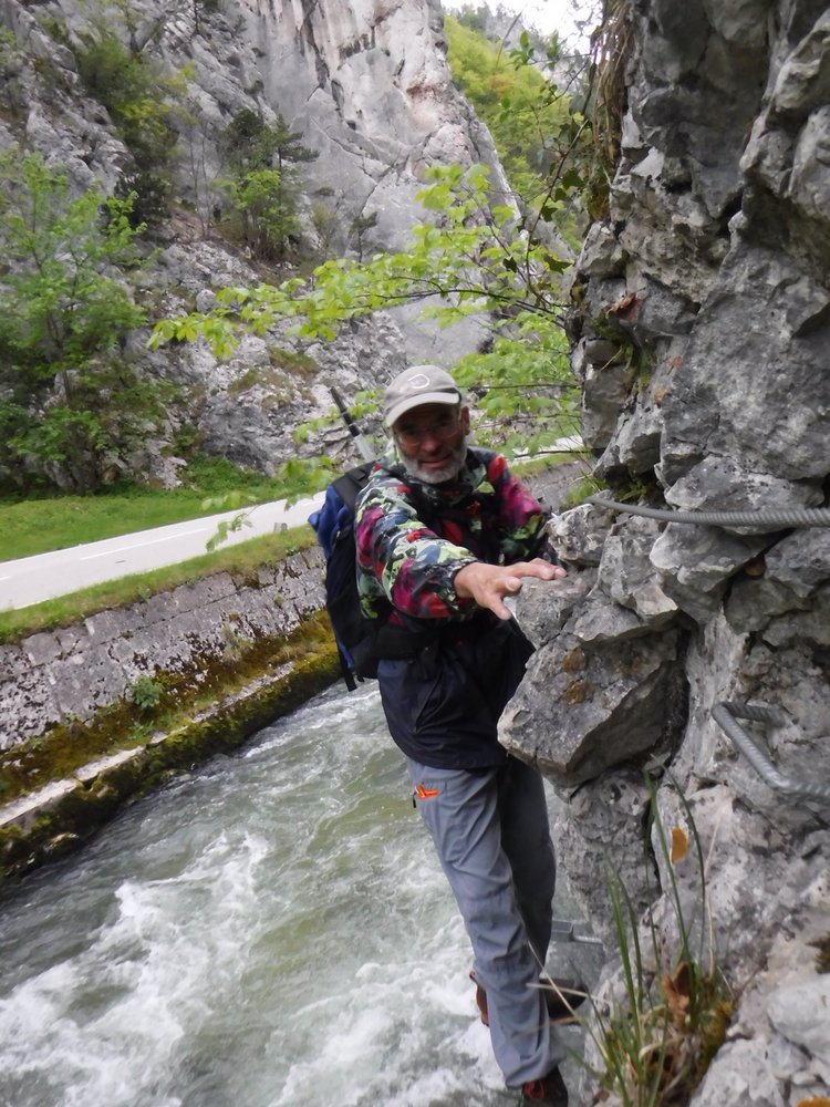 Kurzer, poppiger Klettersteig, der nur als Zustieg dient für die MSL-Route ( 5c+) zur Arête Spéciale. Unten rauscht der Fluß und über einem rauschen die Züge eindrucksvoll vorbei.