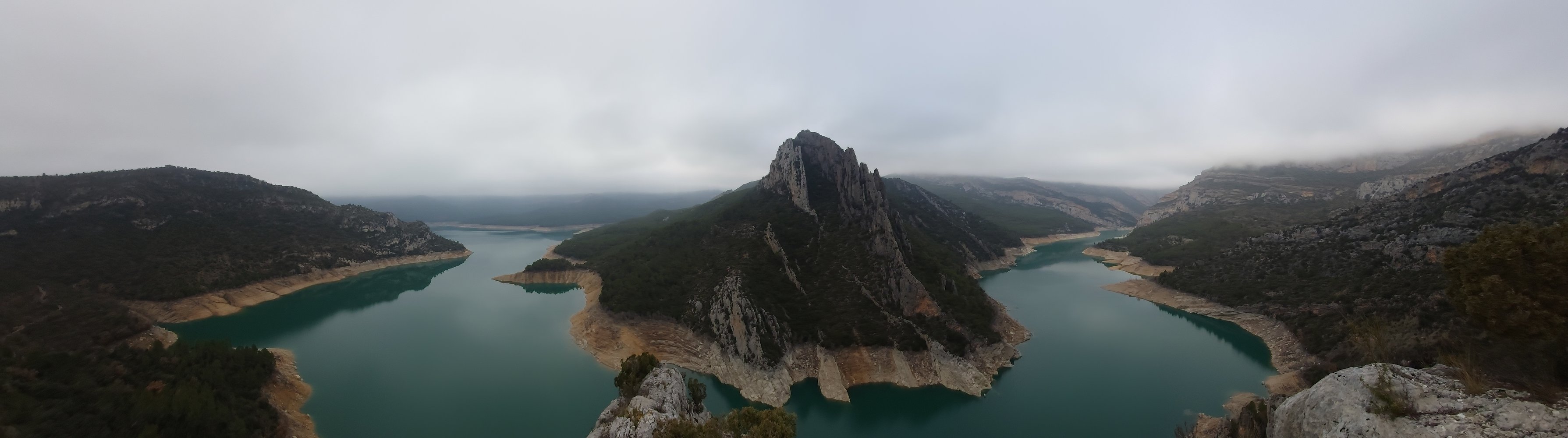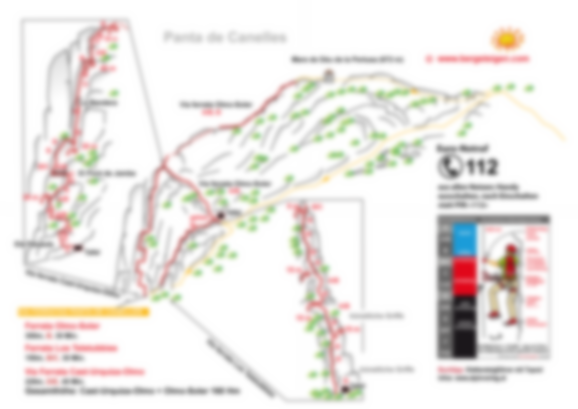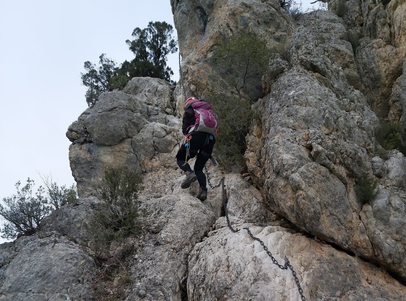 Vom Parkplatz folgen wir dem breiten Weg nach Norden, um am Schild zur Mare de Déu de la Pertusa nach links abzubiegen. Wir halten uns von Anfang an südseitig des Grates und folgen dem Trampelpfad hinunter Richtung See. Wir müssen aufmerksam sein, um den Zustieg nach rechts nicht zu verpassen. An einem gekennzeichneten Felsdurchschlupf sind wir bereits zu weit gelaufen und können kurz später alternativ über den Via Ferrata Los Teletubbies in den VF Olmo Soler einsteigen (Empfehlung).