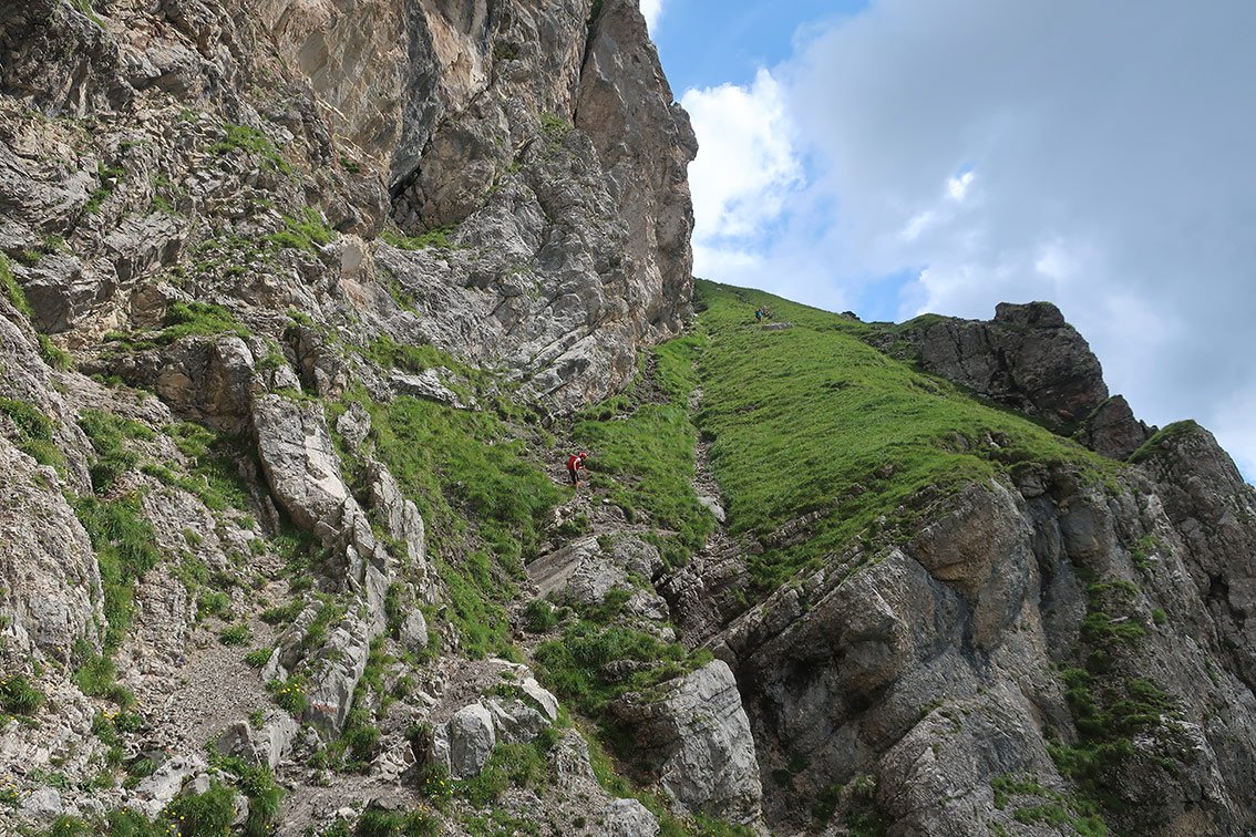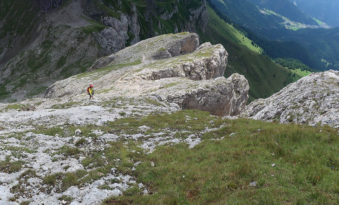 a) Dort südlich auf dem Sentiero attrezzato Attilio Bortoli - einer grasigen Miniferrata (A/B), die durch eine steile rampenartige Rinne führt - absteigen, bis man die steilen Grashänge erreicht. Auf dem Steig, unter den Felsen wieder retour zum Aufstiegsweg queren - auf diesem absteigen.