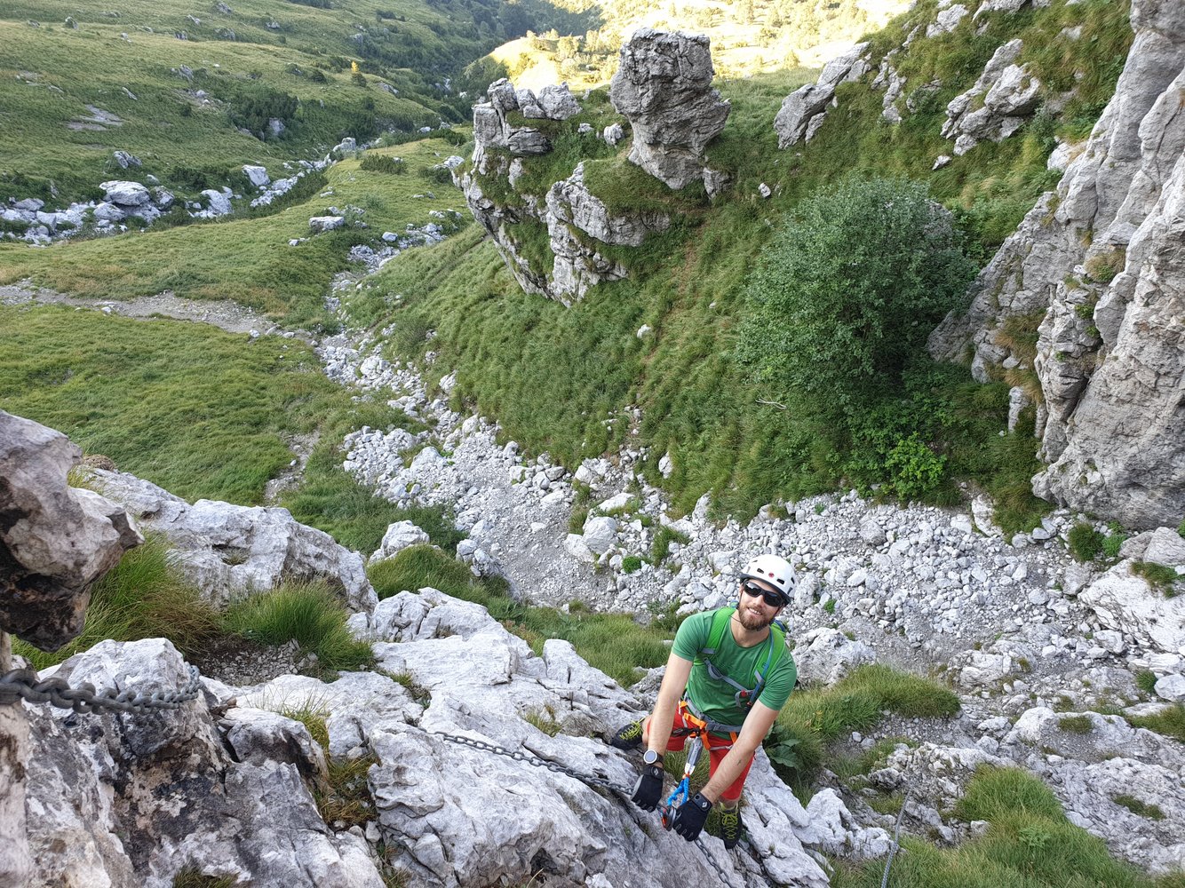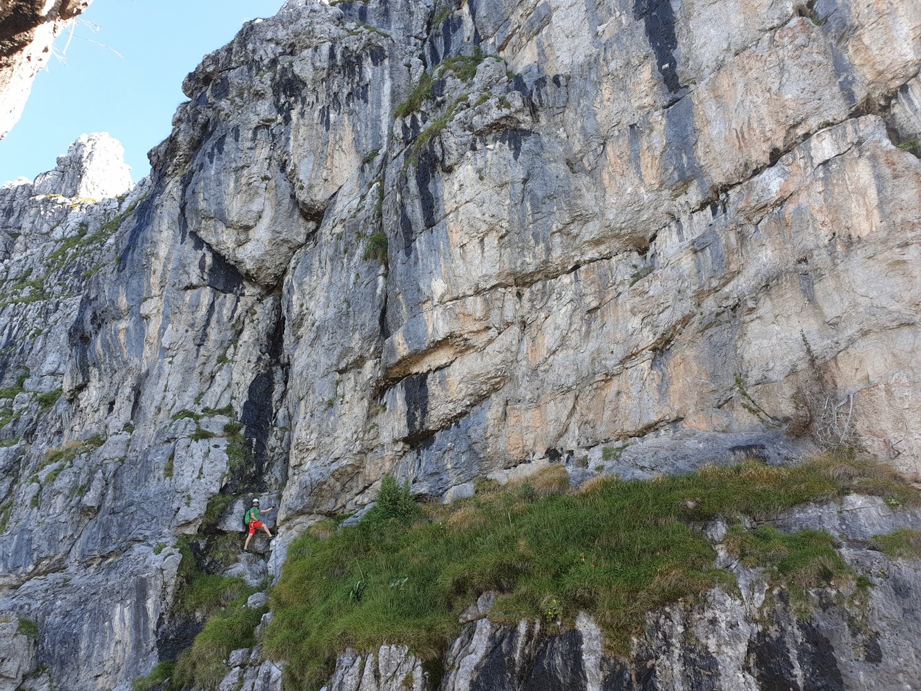 Gleich Anfangs geht es steil über die Einstiegswand die in weiterer Folge um eine Ecke in eine Scharte führt.Hier wartet die erste schwerere Verschneidung auf den Begeher. Weiter über eine Wand mit Bügeln. Über einen grasigen Rücken steht man nun vor der Auswahl ob man links die Variante "difficile" oder rechts die leichtere Variante "facile" wählt.