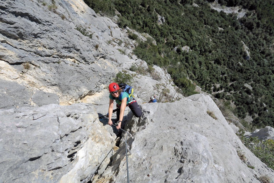 Kompl. Klettersteigausrüstung, Lederhandschuhe und Helm. Kletterschuhe sind auch von Vorteil. Für schwächere Geher ein kurzes Sicherungsseil.