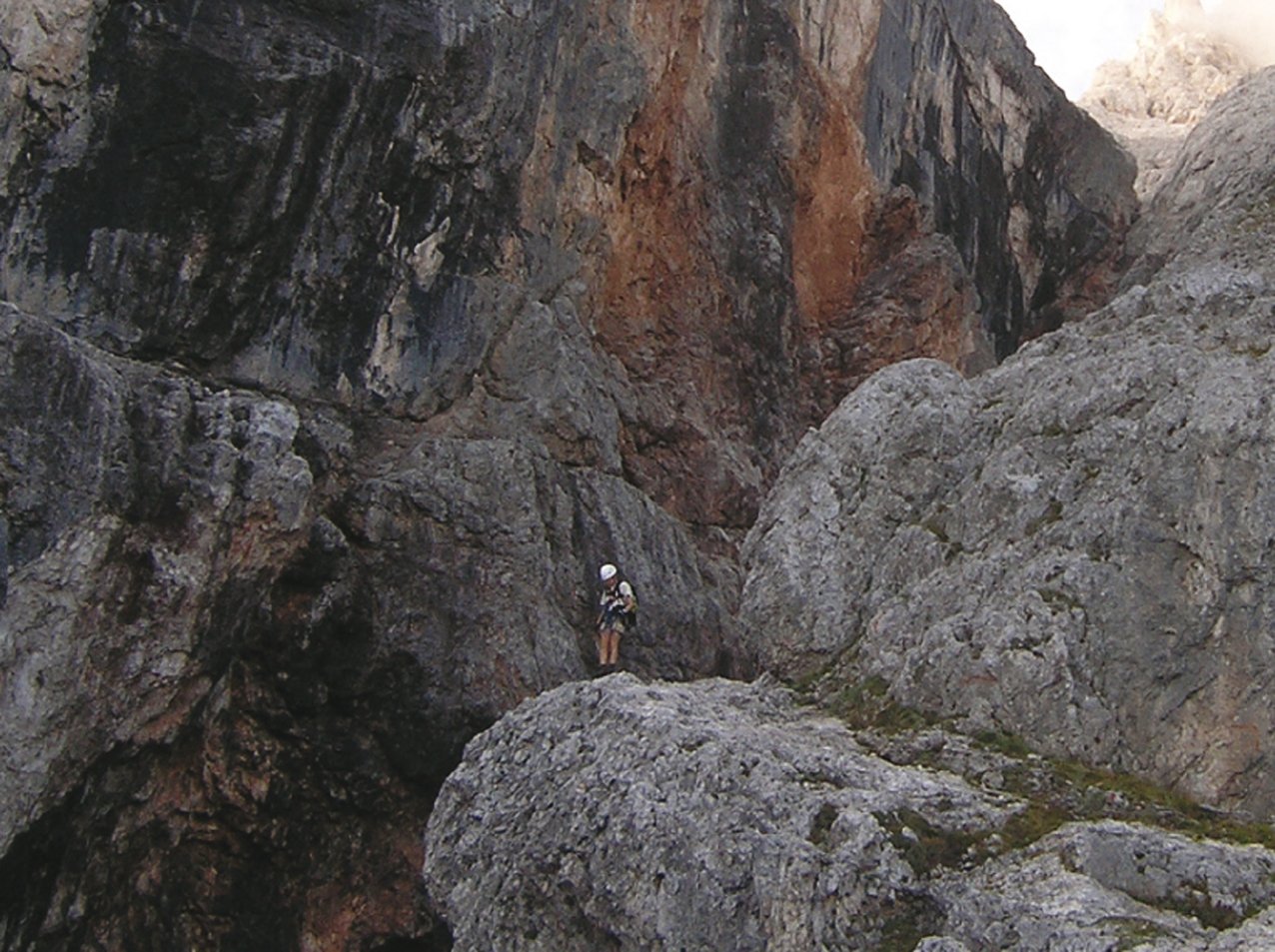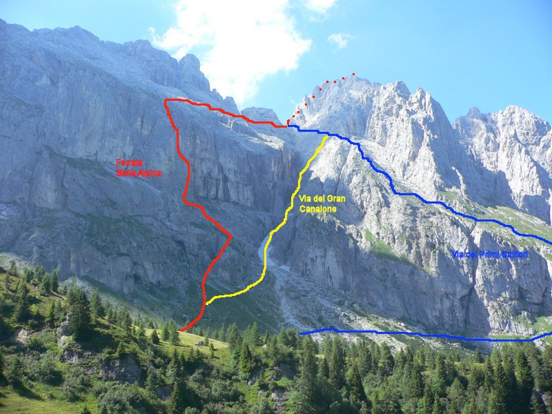 Vom Gipfel wie beim Aufstieg zurück zur Forc. Pizon (Biwak) und südöstlich absteigen bis man zu einer auffälligen Markierung kommt. Dort entweder gerade hinunter über den Sentiero del Canalone (Südschlucht, versichert, Stellen B, bei vielen Bergsteigern Steinschlaggefahr) oder leicht linkshaltend dem „Weg der Erstbesteiger“ folgen (nicht versichert, aber sehr gut markiert; kurze Kletterstellen bis 1+). Am Ende trifft man je nach gewählter Abstiegsvariante früher oder später wieder auf den Aufstiegsweg über den man dann ins Tal absteigt.