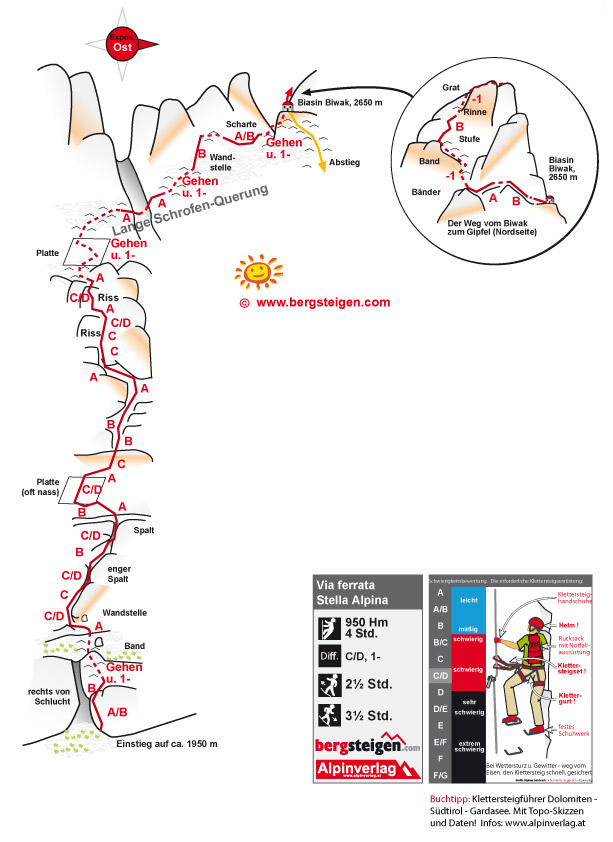 Wegen der vielen nicht versicherten Passagen ist die Via ferrata Stella Alpina ein eindrucksvolles, aber auch sehr alpines Klettersteigabenteuer und gehört mit Abstand zu den anspruchsvollsten Eisenwegen in der Palagruppe. Nach einem luftigen Vertikal-Stück mit einigen knackigen Steigpassagen zu Beginn quert man sehr lange über die sog. Edelweißwiese - die auch mit etlichen leichten Kletterstellen gespickt ist - hinüber zur Forc. Pizon und zum Biasin Biwak. Vom Biwak in nördliche Richtung zum fast 3000-Meter hohen Gipfel des Monte Agnér, auf dem man einen imposanten Rundblick genießen kann. Auch der lange Abstieg hat es in sich - man kann zwischen der riesigen Südschlucht (erhöhte Steinschlaggefahr) oder dem besseren, aber etwas längeren „Weg der Erstbesteiger“ wählen.