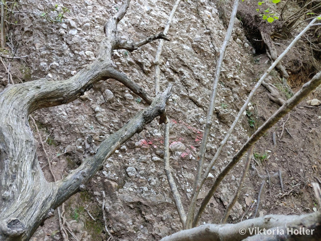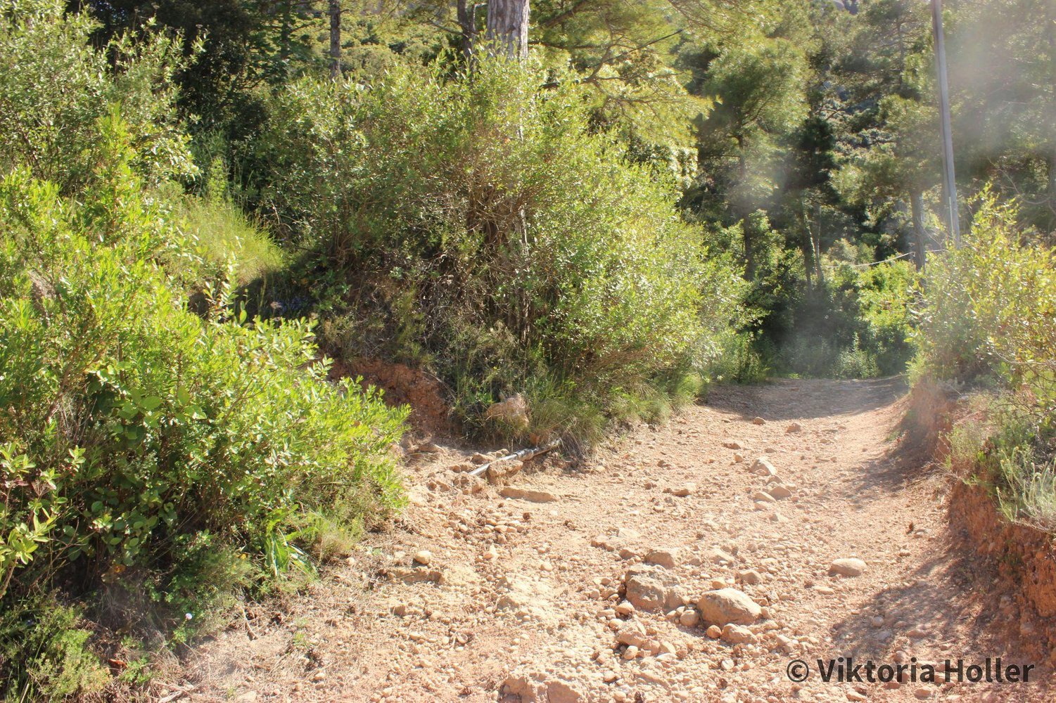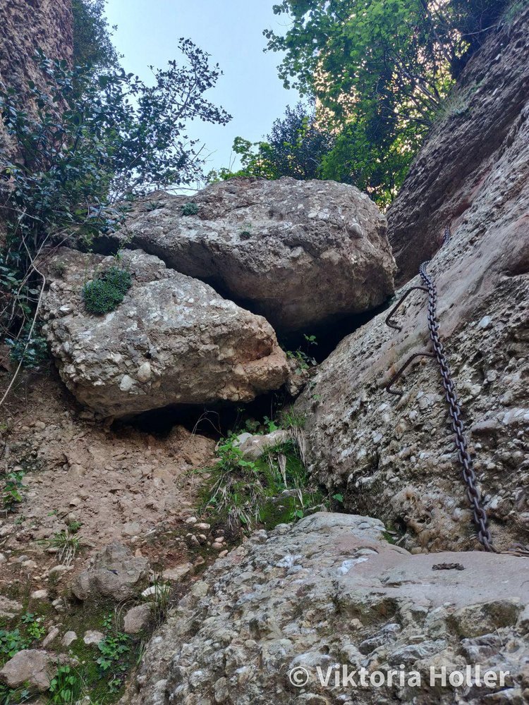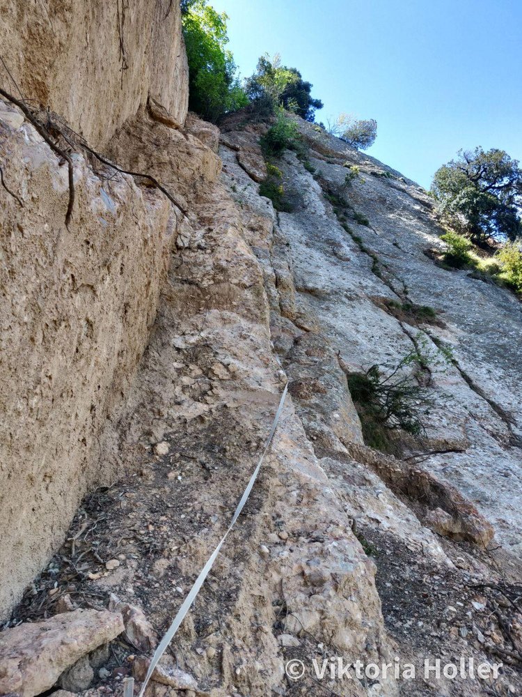 2. Teil: Vom Gipfel Santa Cecilia steigt man wieder denselben Weg ab, folgt aber dem Seil nach links unten. Hier klettert man einige Meter ab, anfangs mithilfe von Trittbügeln (B/C), weiter unten unterstützen Ketten beim Abklettern (C). Ein bisschen Armkraft und Tritttechnik helfen an dieser Stelle. Nun wandert man links entlang des Wandfußes weiter. Dabei achtet man auf ein Drahtseil, das nach einigen Metern links den Wandsteig hinaufführt (A/B). In diesem Klettersteigabschnitt war zum Zeitpunkt unserer Begehung eine Versicherung mit einem Band verbunden und zwei weitere Stahlseile waren etwas abgenützt. An dieser, nicht schwierigen, aber etwas abschüssigen, Stelle (B/C) sollte man die Versicherung so wenig wie möglich belasten. Ist der Teil überwunden, geht es über ein an einem Baum angebrachtes Knotenseil wieder auf Gehgelände weiter. Man gelangt zu einer Gabelung, die nicht besonders gut zu erkennen ist. Bei dieser Gabelung führt unser Weg rechts entlang, wenn man genau schaut, erkennt man auch eine Pfeilmarkierung am Fels. Bald folgt noch ein kurzer drahtseilversicherter Aufschwung (B) auf einen felsigen Hügel in Erdfarben. Nach diesem Aufschwung wieder eine Gehpassage im Unterholz, bis die finale Schlucht zu sehen ist. Ein paar Meter geht es in die enger werdende Schlucht hinein, dann mithilfe von Trittbügeln etwa 20m empor (C/D). Vor dem Ausstieg kommt man noch bei einem kleinen Bäumchen vorbei. Danach erreicht man über wenige felsige Meter (A/B) das eingezäunte Gipfelplateau des Sant Jeroni auf 1236 m.