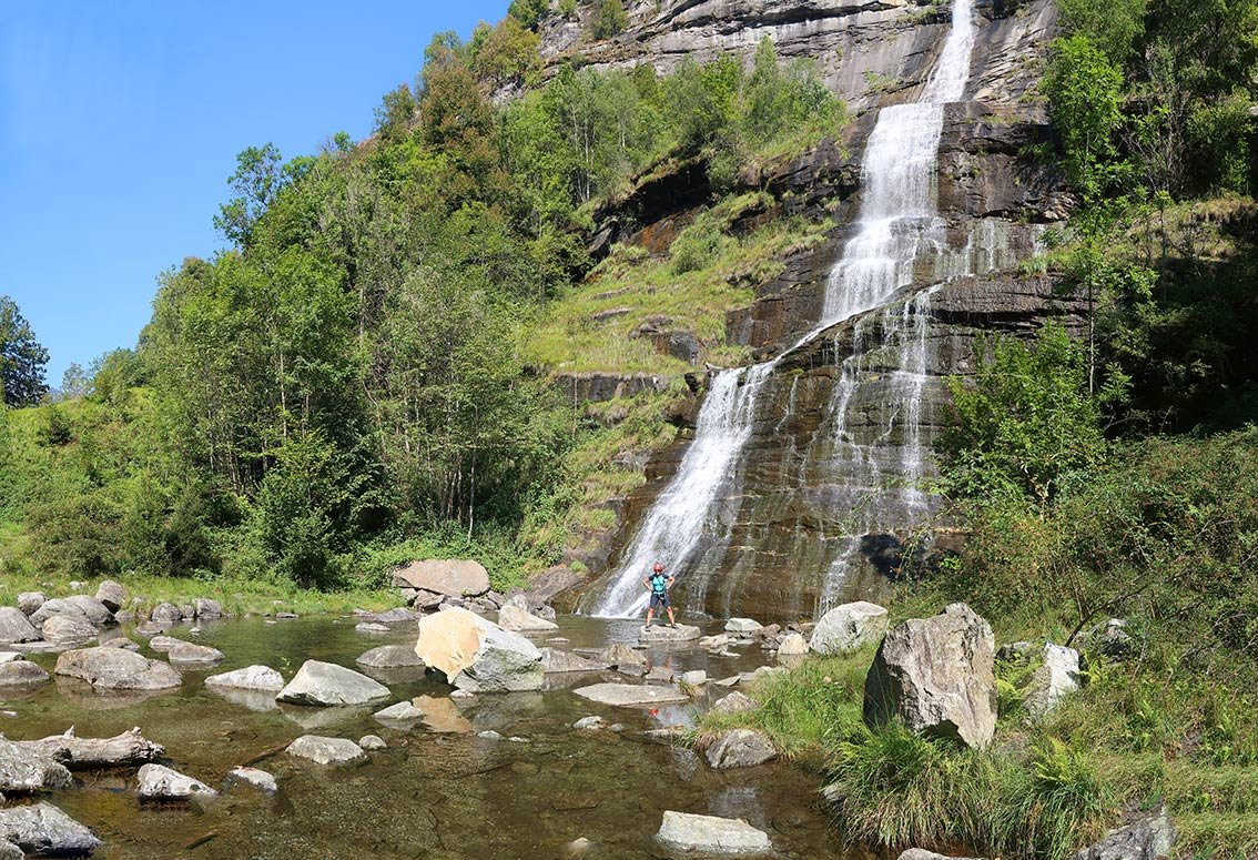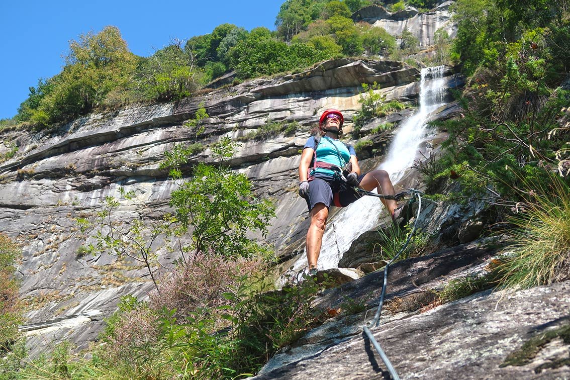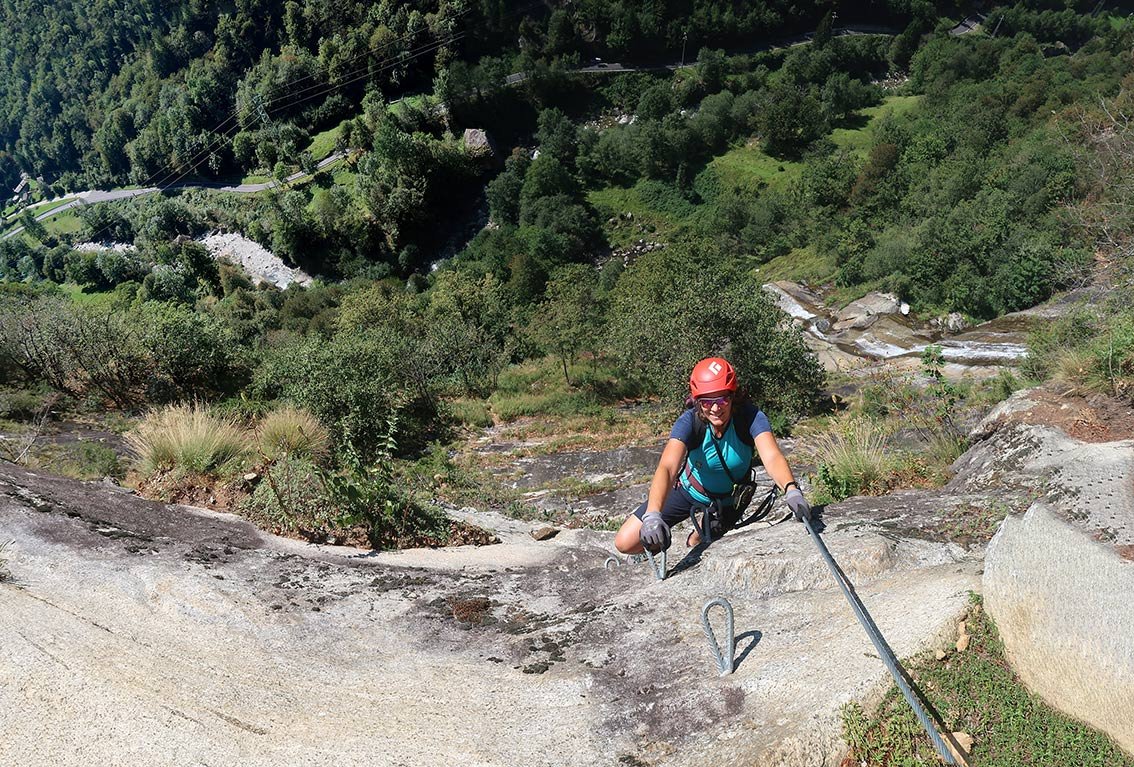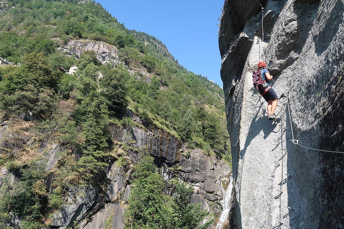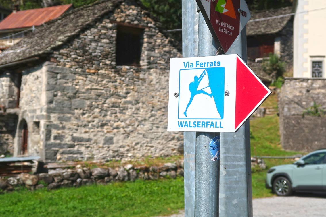 Vom Parkplatz in Osso über die Brücke zur Häusergruppe Ponte und auf der anderen (östlichen) Bachseite der Straße, später auf einem Weg, am Ende einem Pfad dem Bach entlang zum Wasserfall folgen. Dort steht eine Infotafel, vom Wasserbecken steigt man im Zickzack durch lichten Wald zum Einstieg auf. Man kann auch direkt vom Ortskern von Croveo starten - der Zustieg zum Klettersteig ist beschildert (kleine, viereckige Schildchen "Via Ferrata Walserfall").
