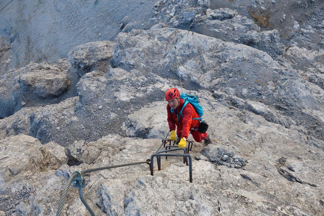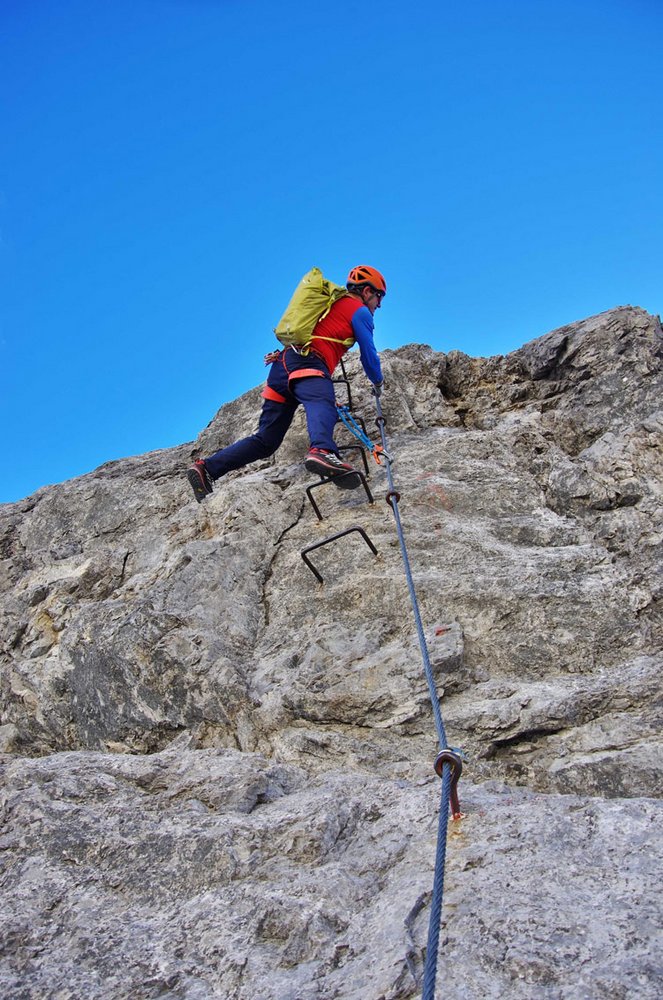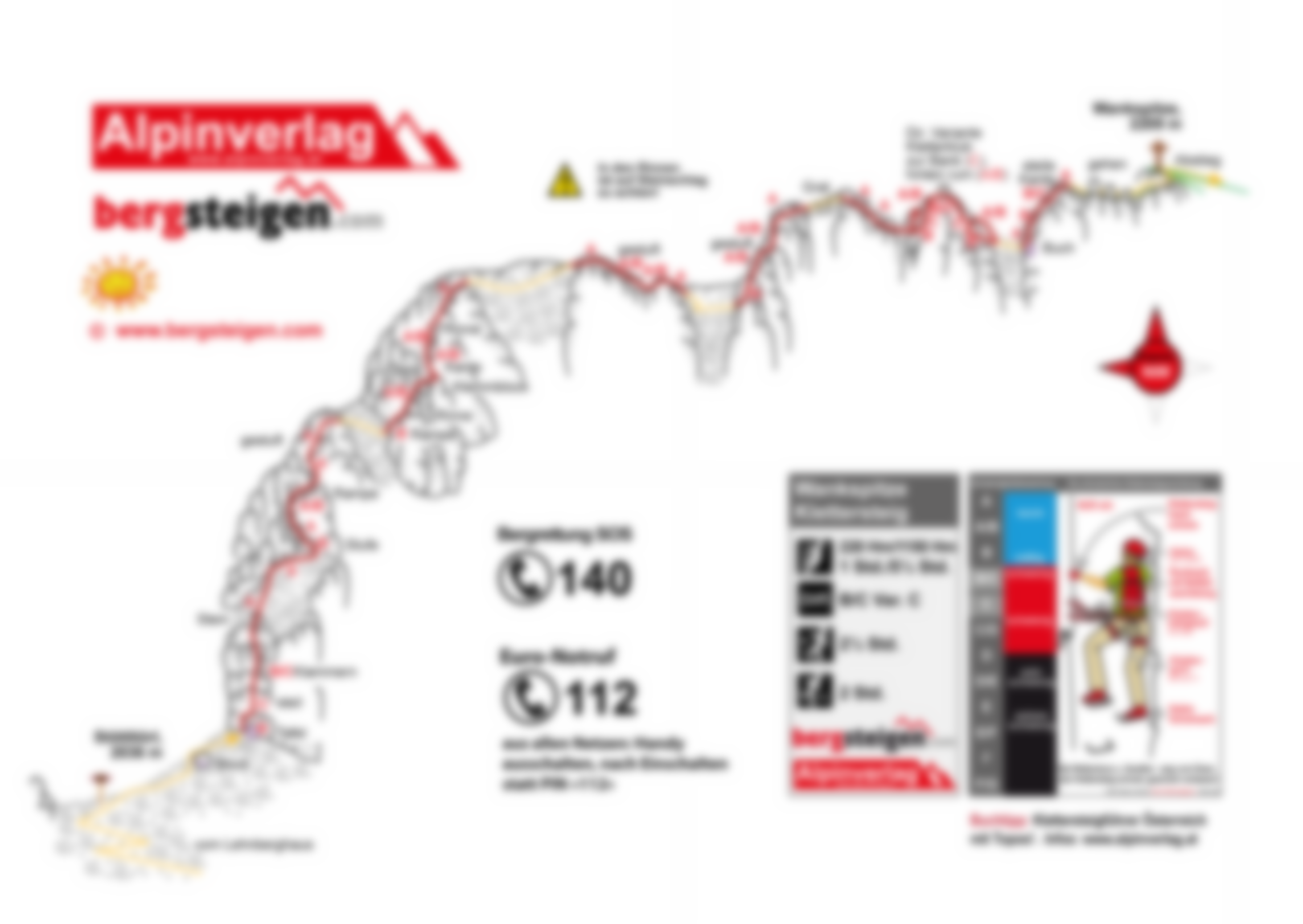 Siehe Topo. Die Schwierigkeiten liegen im Bereich der glatten Platte (C) zu Beginn und der steilen Kante (B/C) am Ende des Klettersteiges. Dazwischen meist leicht (A bzw. A/B). Im oberen Teil gibt es die kurze Kletterklub-Variante (C) auf einen Pfeiler mit Bankerl - diese muss aber nicht zwingend gemacht werden.