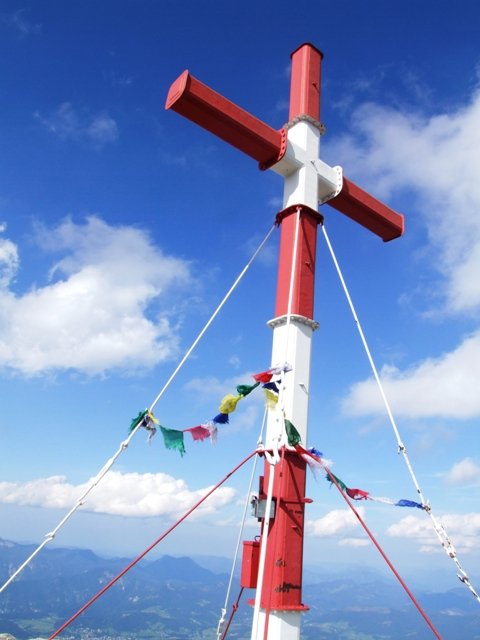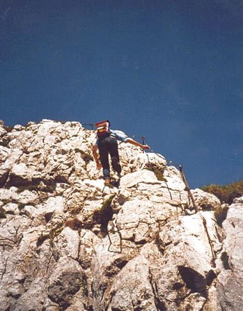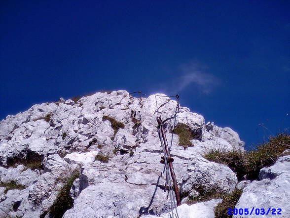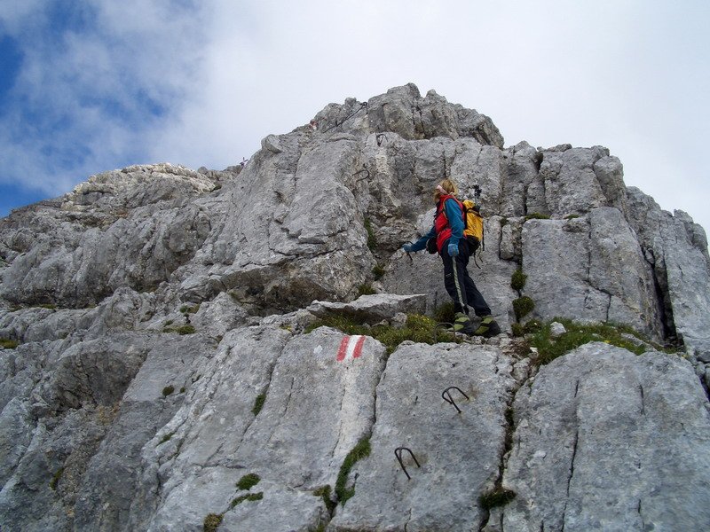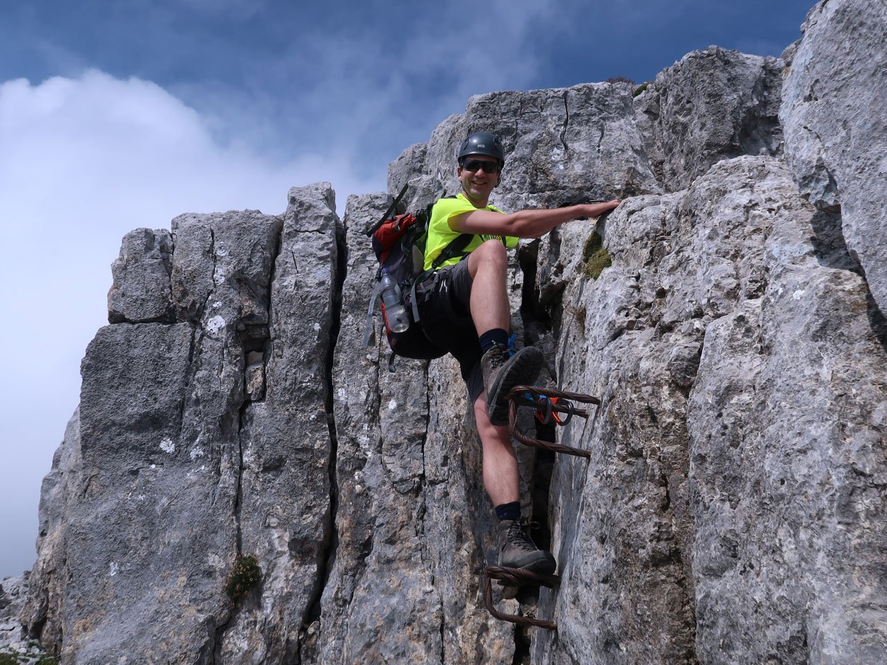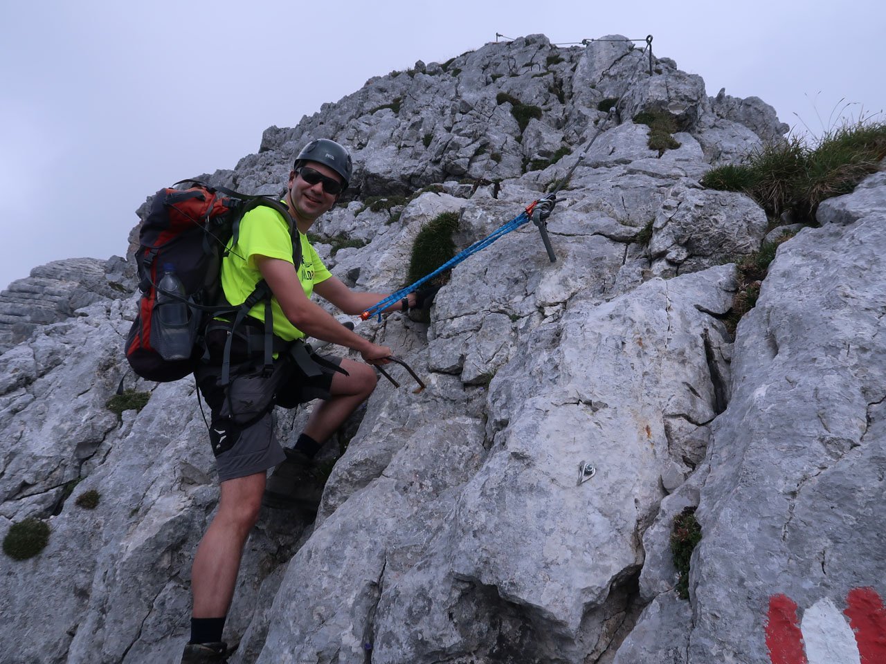 Die eher sparsam, aber ausreichend angebrachten Drahtseile, Trittstifte und Klammern führen mal direkt auf dem Grat, mal links davon hinauf zum rot-weiß-roten Gipfelkreuz.