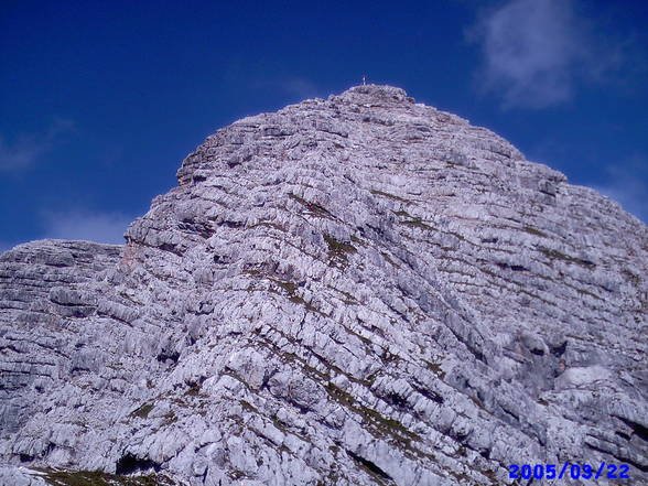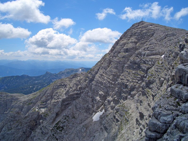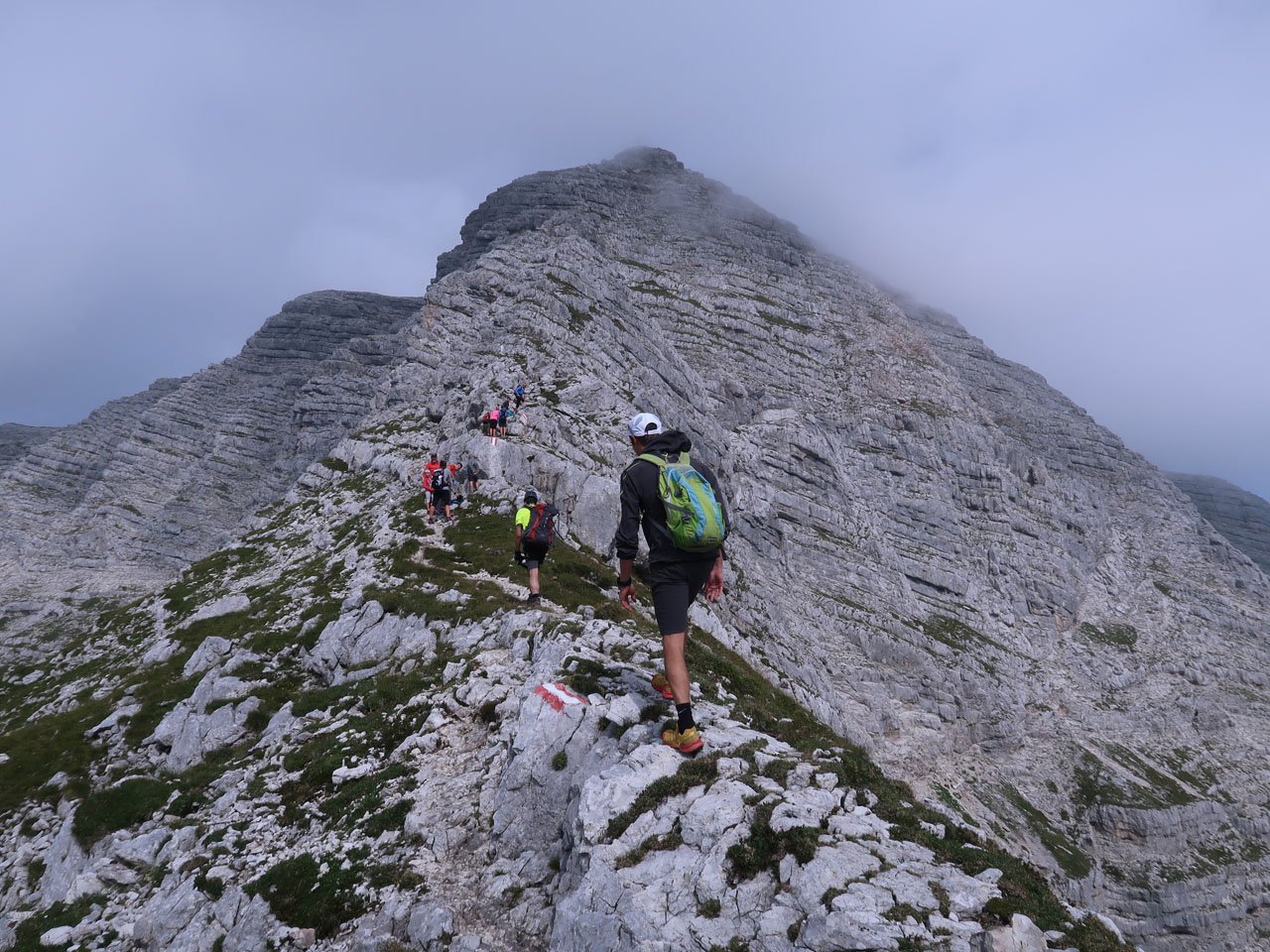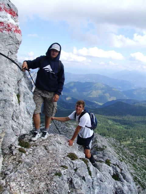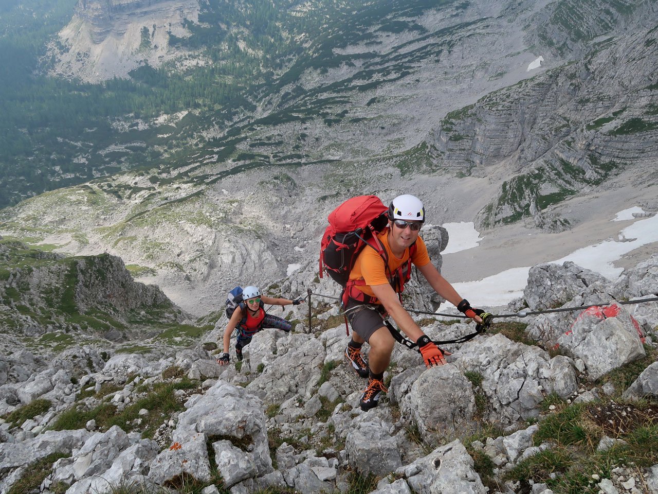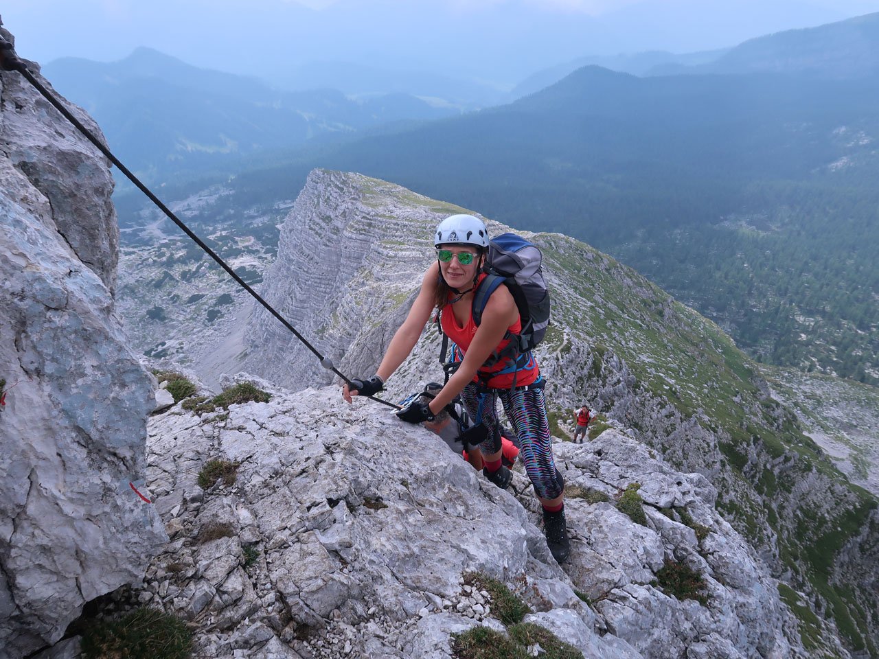 Die eher sparsam, aber ausreichend angebrachten Drahtseile, Trittstifte und Klammern führen mal direkt auf dem Grat, mal links davon hinauf zum rot-weiß-roten Gipfelkreuz.