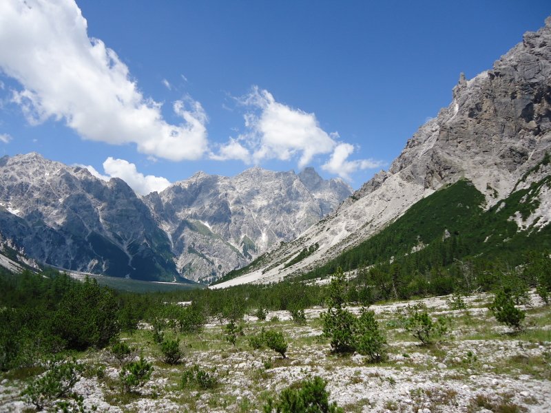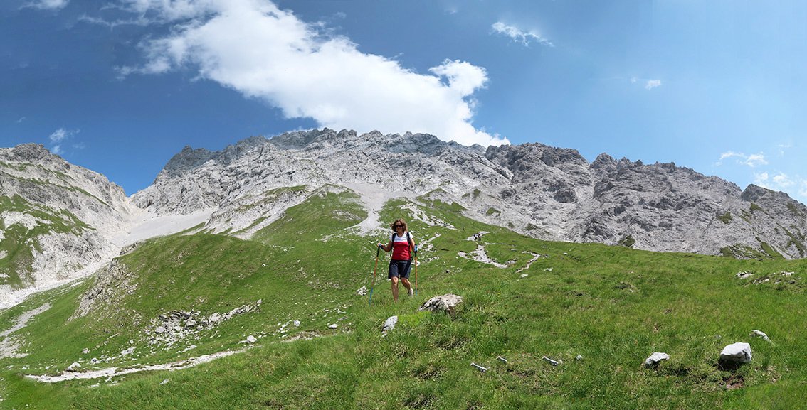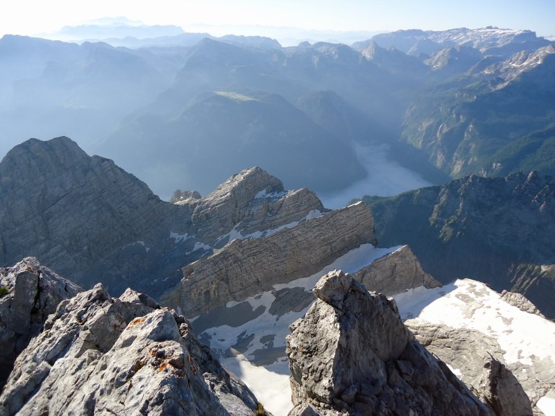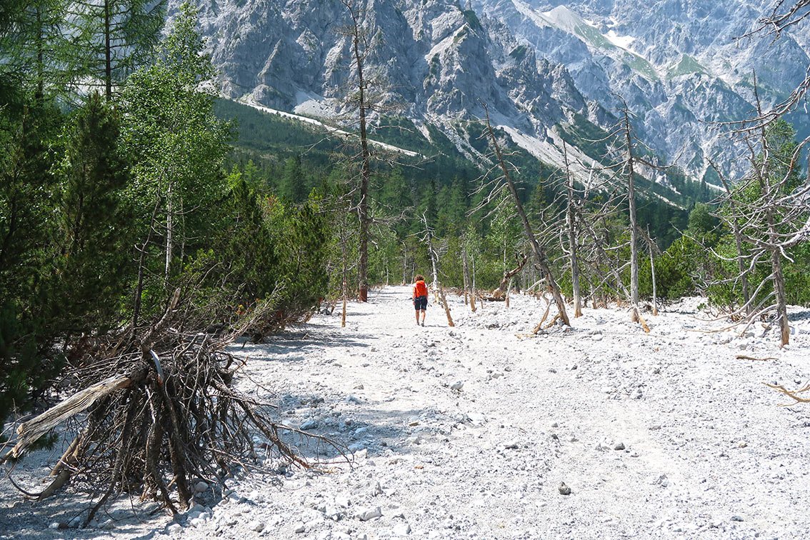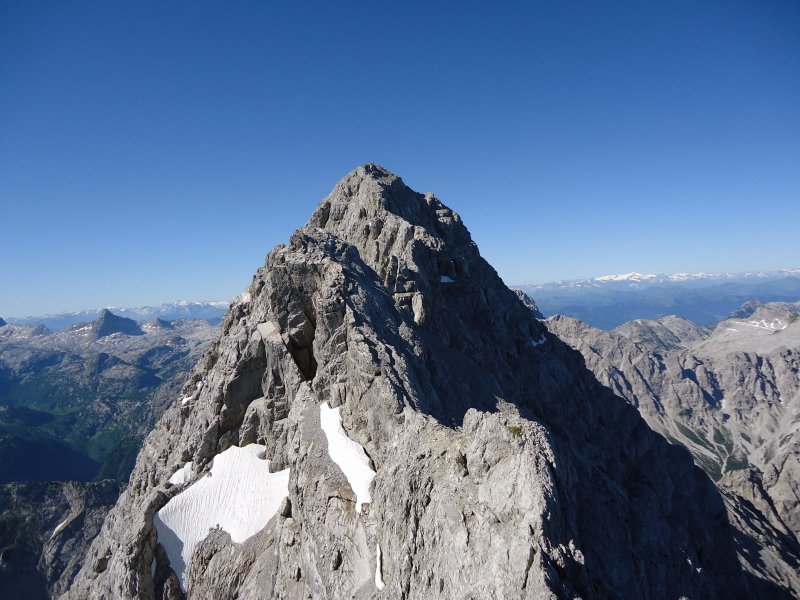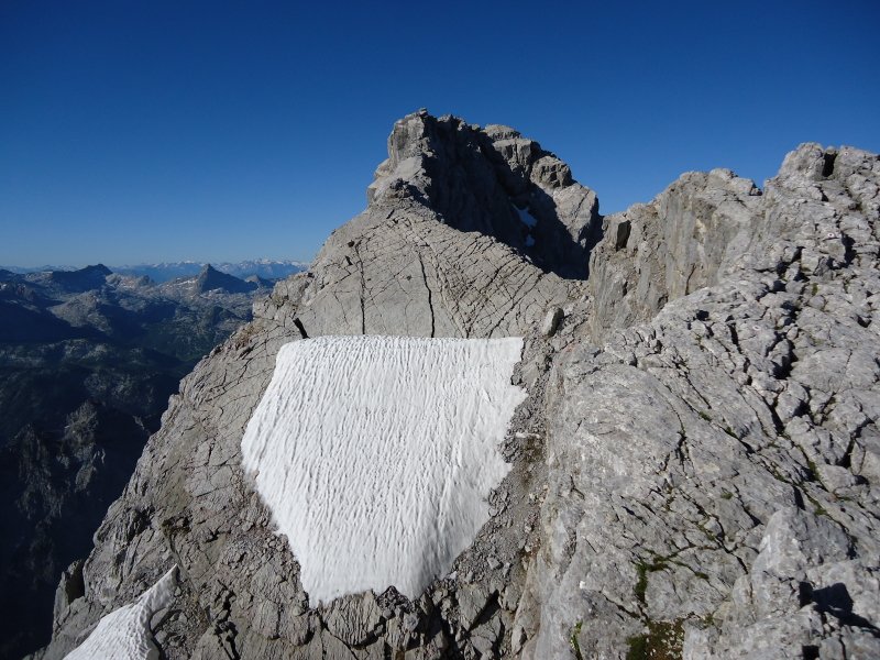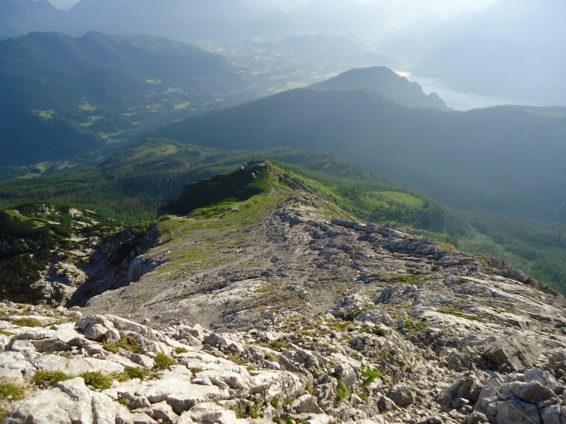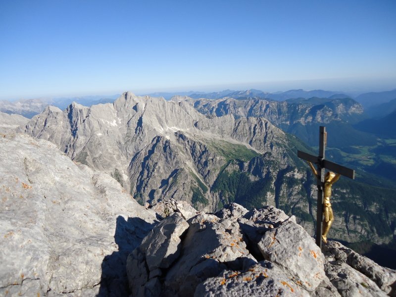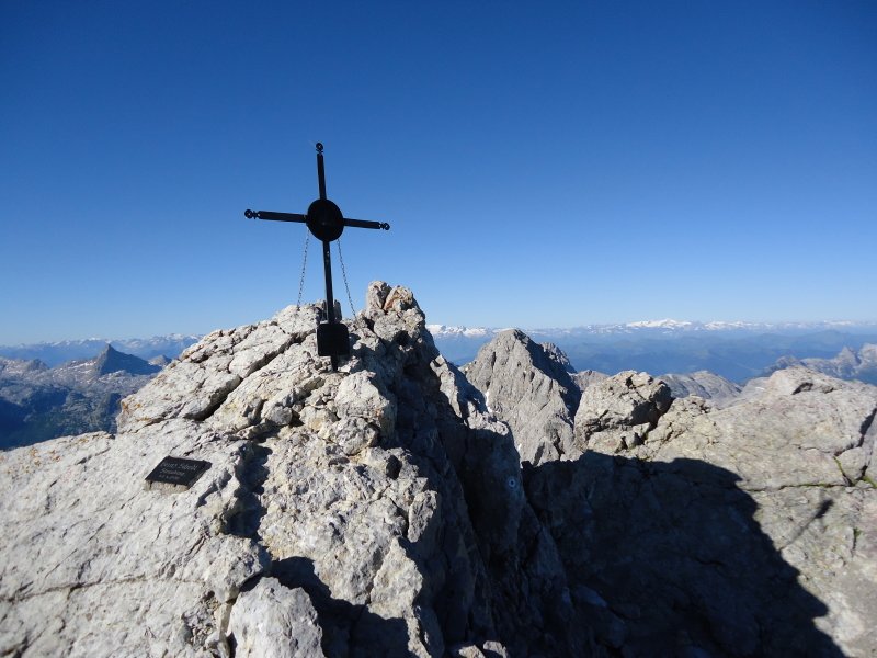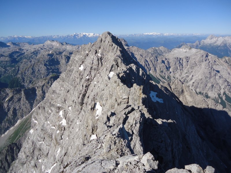 Abstieg (markiert, ganz leichte Kletterstellen bzw. tlw. versichert A kurz A/B): Von der Südspitze zuerst auf dem Grat in eine Scharte, dann durch eine Art Schlucht auf ein Schuttfeld. Danach weiter über eine neuerliche Steilstufe auf ein Wiesenstück, nach diesem folgt eine ungute Sandrinne. Vor der letzten Steilstufe gibt es eine längere Querung, kurz auch ansteigend, danach erneut eine Rinne (Kette) in einem Latschenfeld. Querend und absteigend erreicht man schlussendlich das große Schuttfeld (Ende der Schwierigkeiten). Dort beginnt der sehr lange Rückweg durch das Wimbachtal. Vorbei an der Wimbachgrieshütte (1326 m) und dem Wimbachschloß (937 m) erreicht man schlussendlich den Ausgangspunkt bei der Wimbachbrücke (634 m).