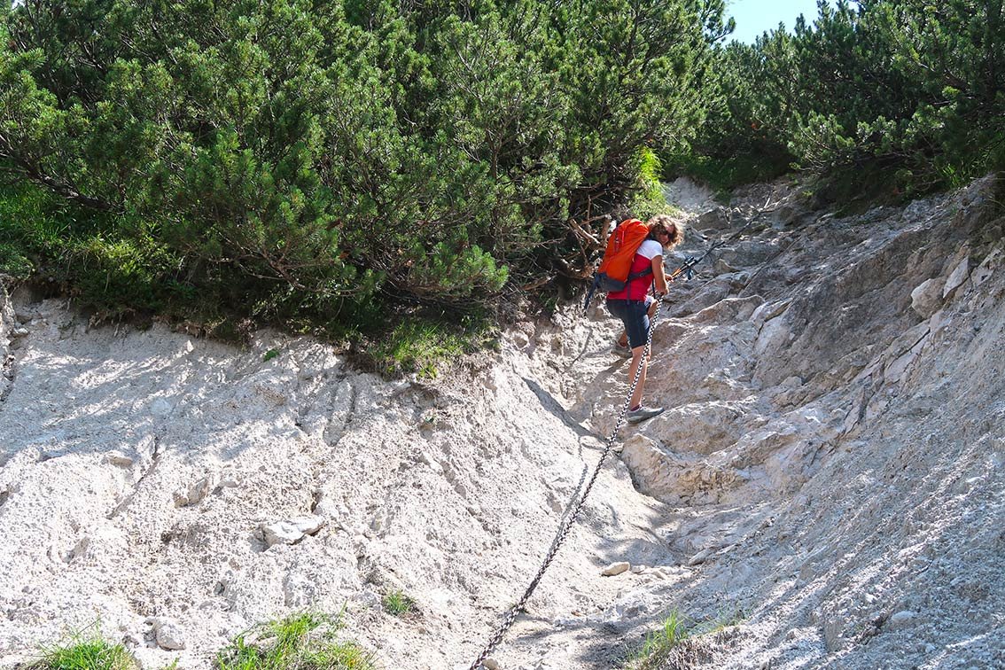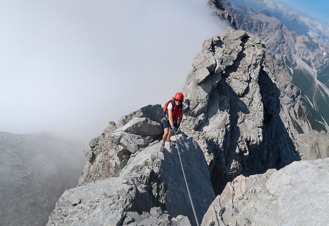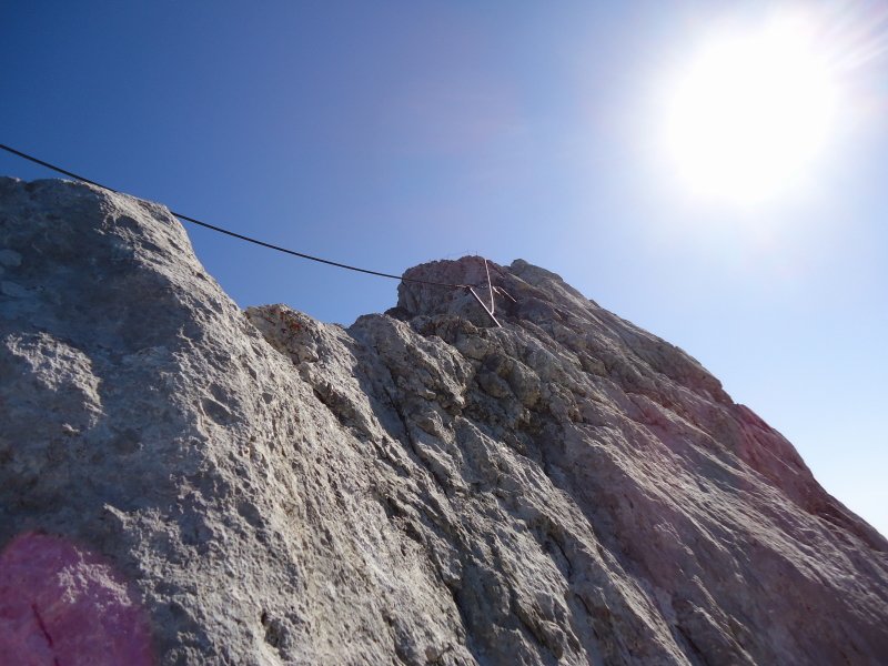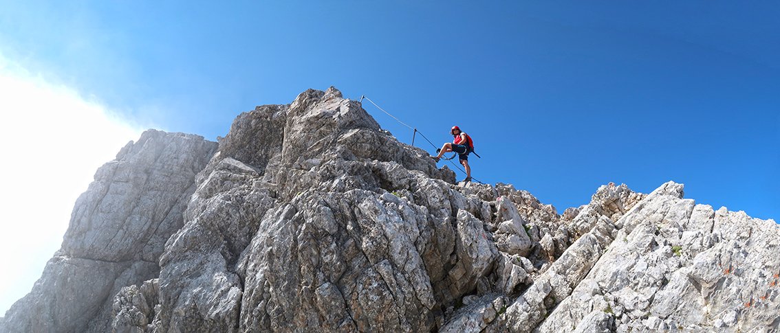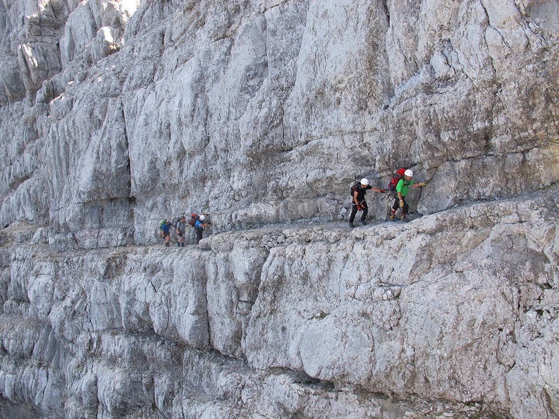 Nur bei bestem Wetter und schnee-/eisfreiem Fels unternehmen! Trittsicherheit, Schwindelfreiheit und etwas Klettergewandtheit sind notwendig. Längere Strecken Schwierigkeitsgrad l-, ansonsten Sicherungen.