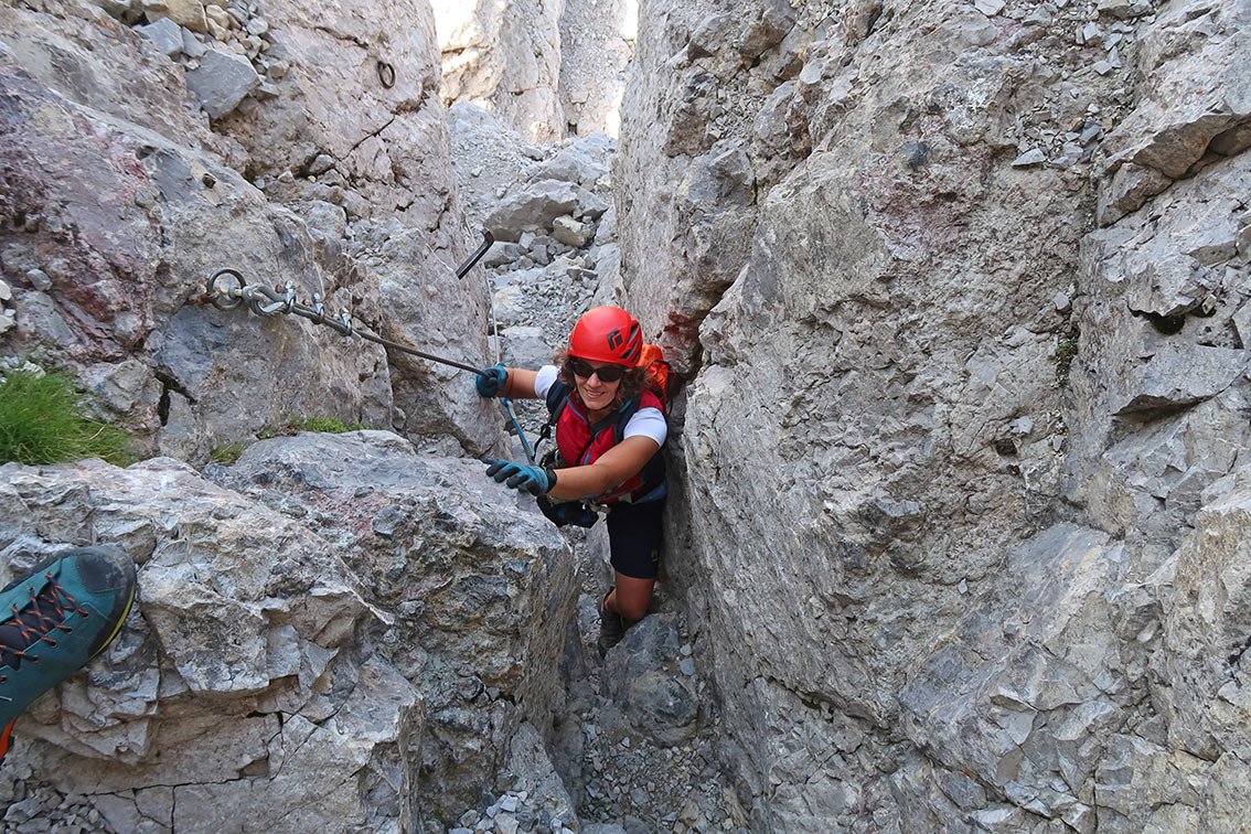 Komplette Klettersteigausrüstung und evtl. ein Sicherungsseil für die Kletterstellen (tlw. Bohrhaken vorhanden).