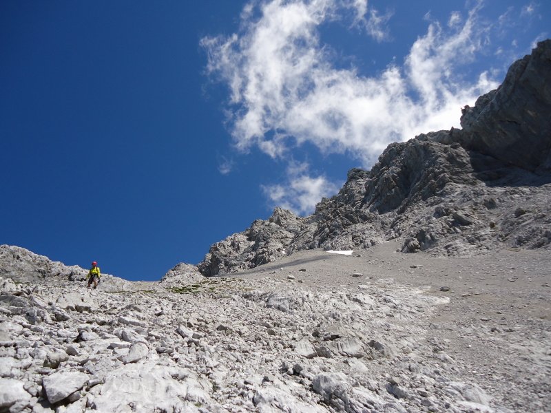 Bemerkung zum langen, heiklen Abstieg: Bei Nebel im Geröll des Oberen Schönfeldes schwierige Orientierung - bei Schnee heikel (Steigeisen, Leichtpickel). Einige kurze Passagen im Schwierigkeitsgrad 1- und gesicherte Stellen (A bis A/B). Teilweise erhebliche Steinschlaggefahr durch höher oben steigende Kletterer (besser den Helm bis ganz unten auflassen)!