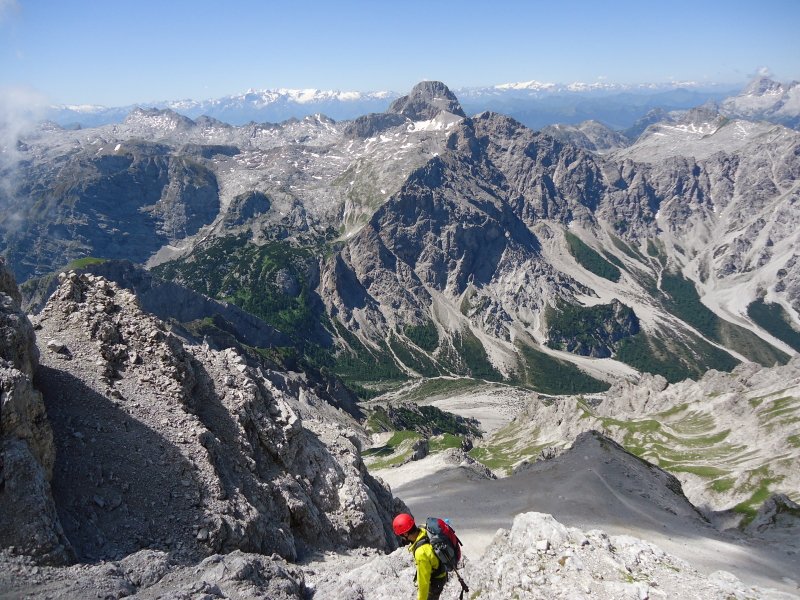 Mittelspitze (2713 m) - Südspitze (2712 m): Vom Gipfel der Mittelspitze zuerst kurz westlich, dann gleich wieder südöstlich am luftigen Grat abklettern (A und kurz sehr ausgesetzt ! ohne Sicherungsseil), bis man westlich nach Rinnne (A, enge Rinne B) wieder flacheres Gelände erreicht. Meist im Bereich des Grates oder westlich davon weiter, bis man erneut im Zickzak (A und ein ausgesetztes ungesichertes Band) absteigt. Danach weiter hinunter (A und Schrofenklettern 1-) bis man in eine Scharte vor einem zackigen, gelben Aufschwung gelangt. Die gelben Gratzacken werden westlich umgangen und man erreicht auf Bändern aufsteigend erneut den Grat (zuletzt A/B). Nach dem Band bei einem Block (A) weiter auf dem Grat (kurz A), dann wieder absteigen (A/B) und länger ungesichert (Steigspuren, westl. vom Hauptgrat) abwärts. Der Felsturm mit dem Sender wird im Schutt westlich zu Fuß umgangen. Auf einer Rampe hinauf zum Grat (ganz oben A). Im Bereich des Grates (A) bzw. östlich davon zum Gipfelblock (A). Der Gipfelblock wird westseitig (kurz A/B) erstiegen und man steht auf der Südspitze (2712 m).
