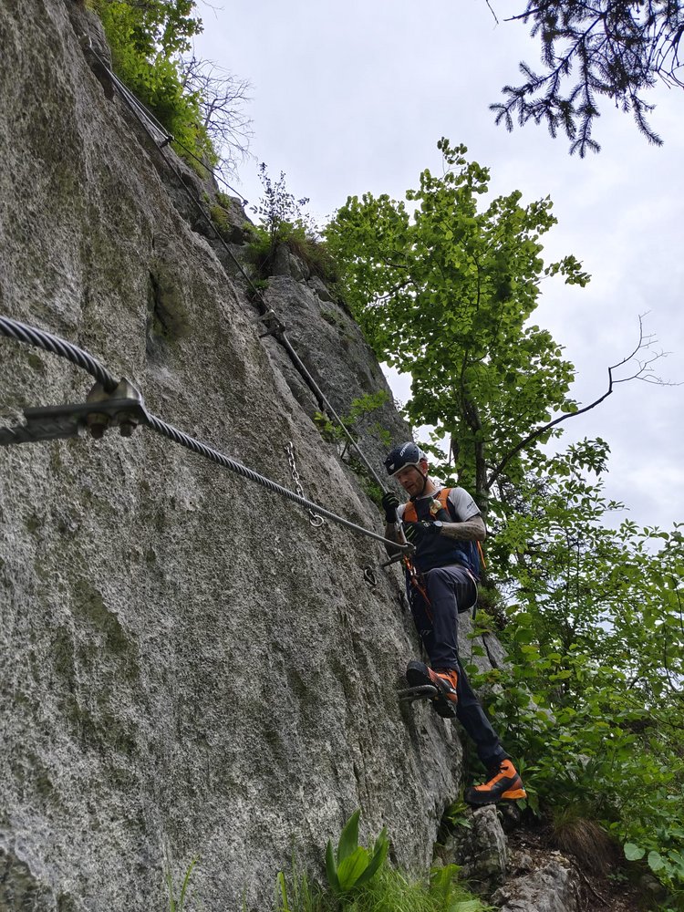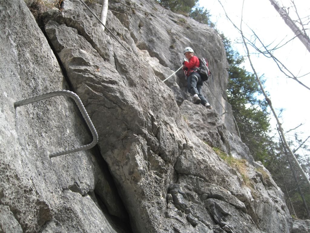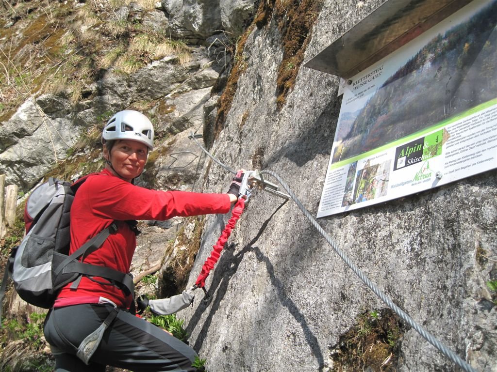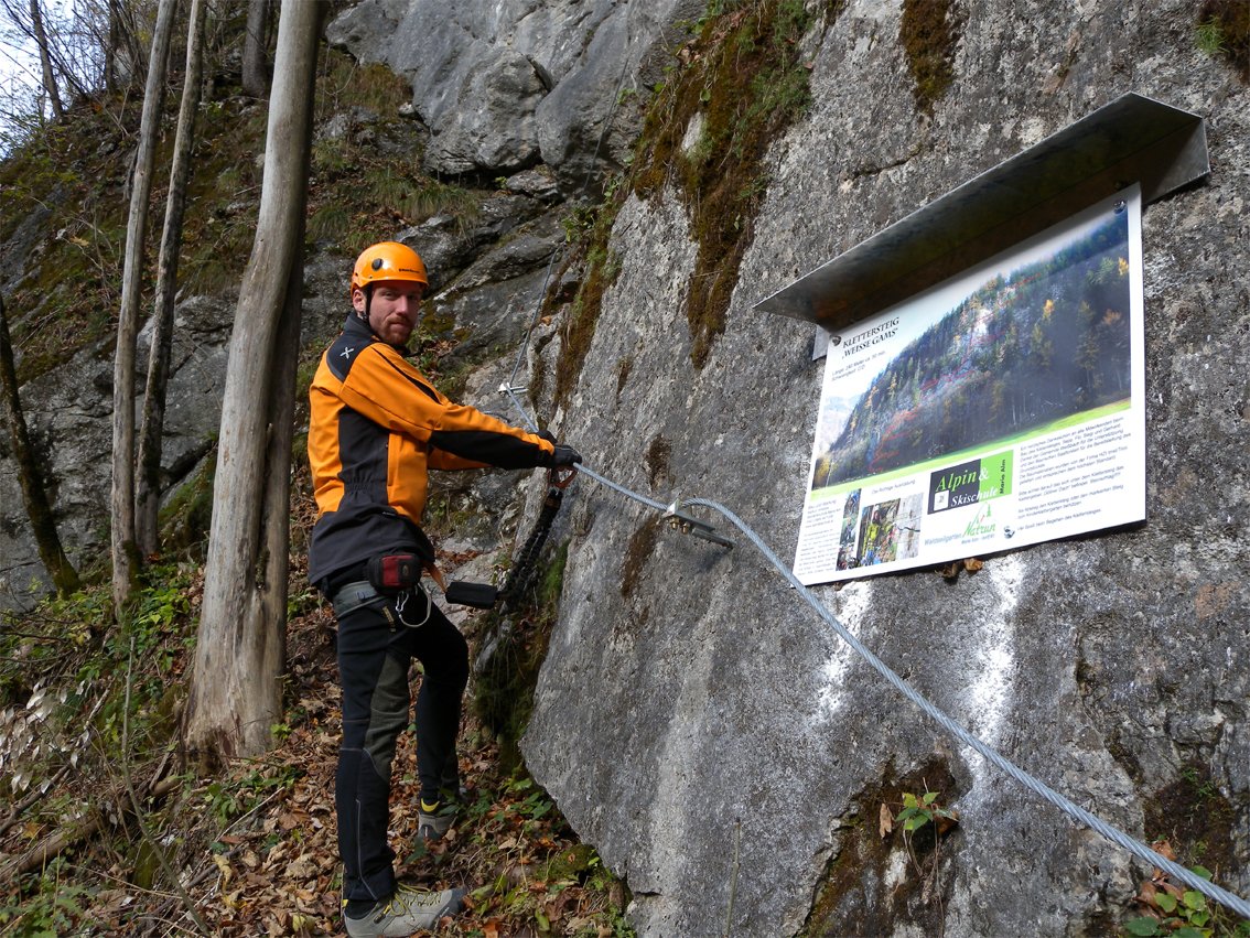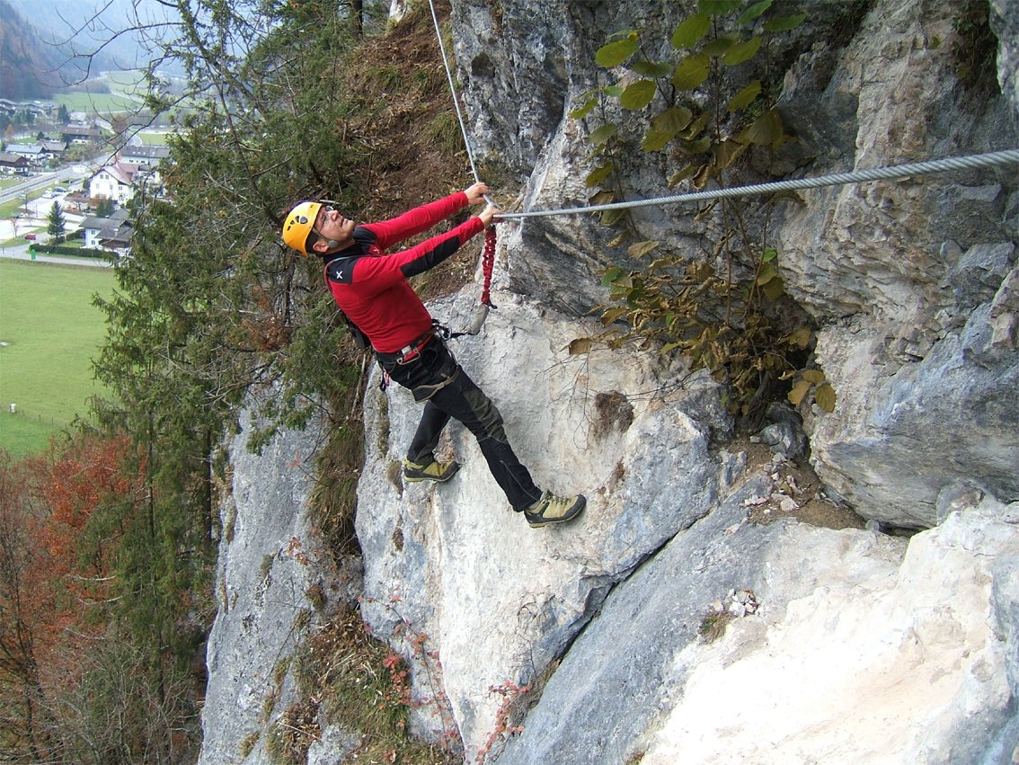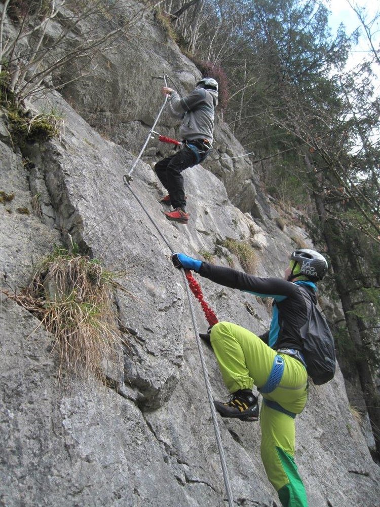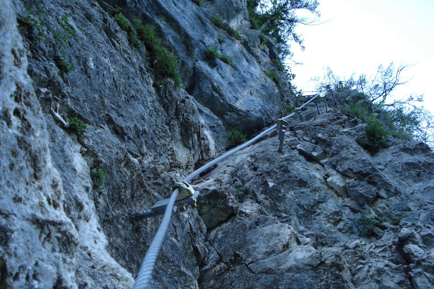 Kompl. Klettersteigausrüstung; für Schwächere ein Sicherungsseil.