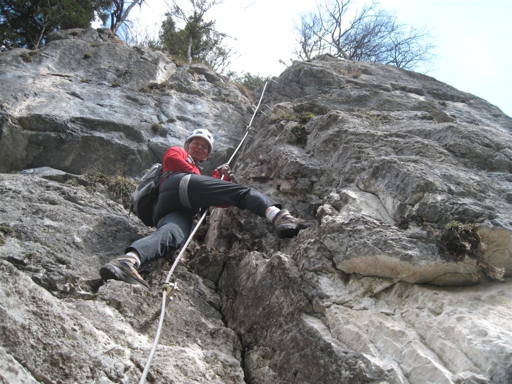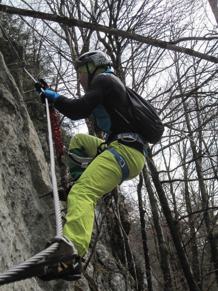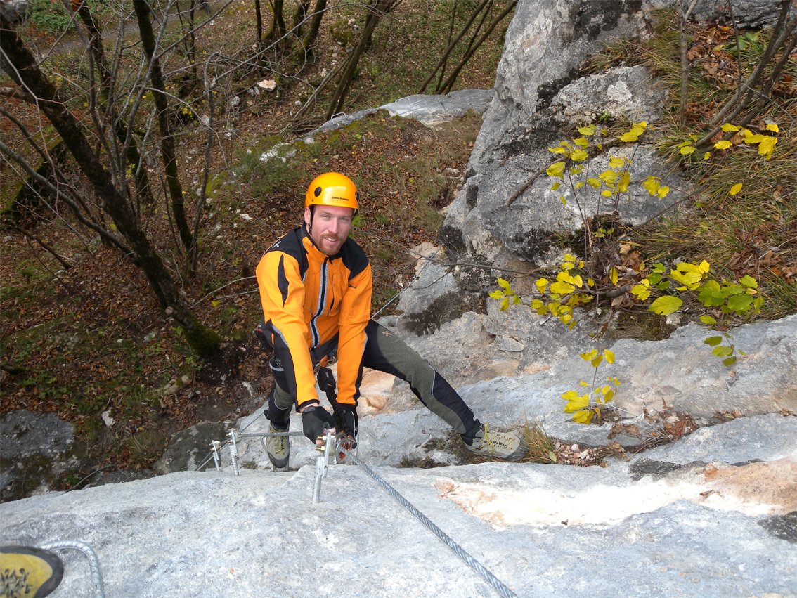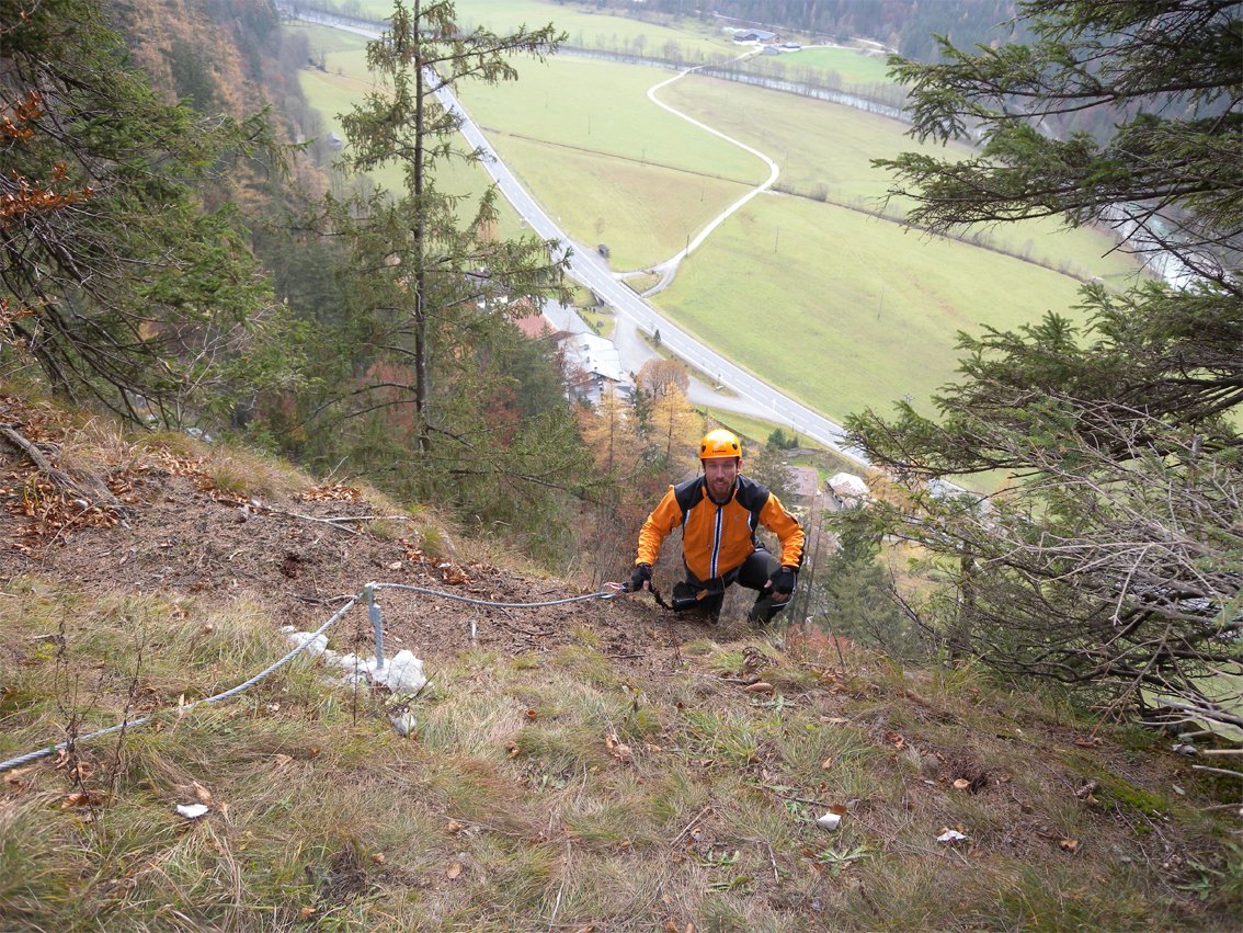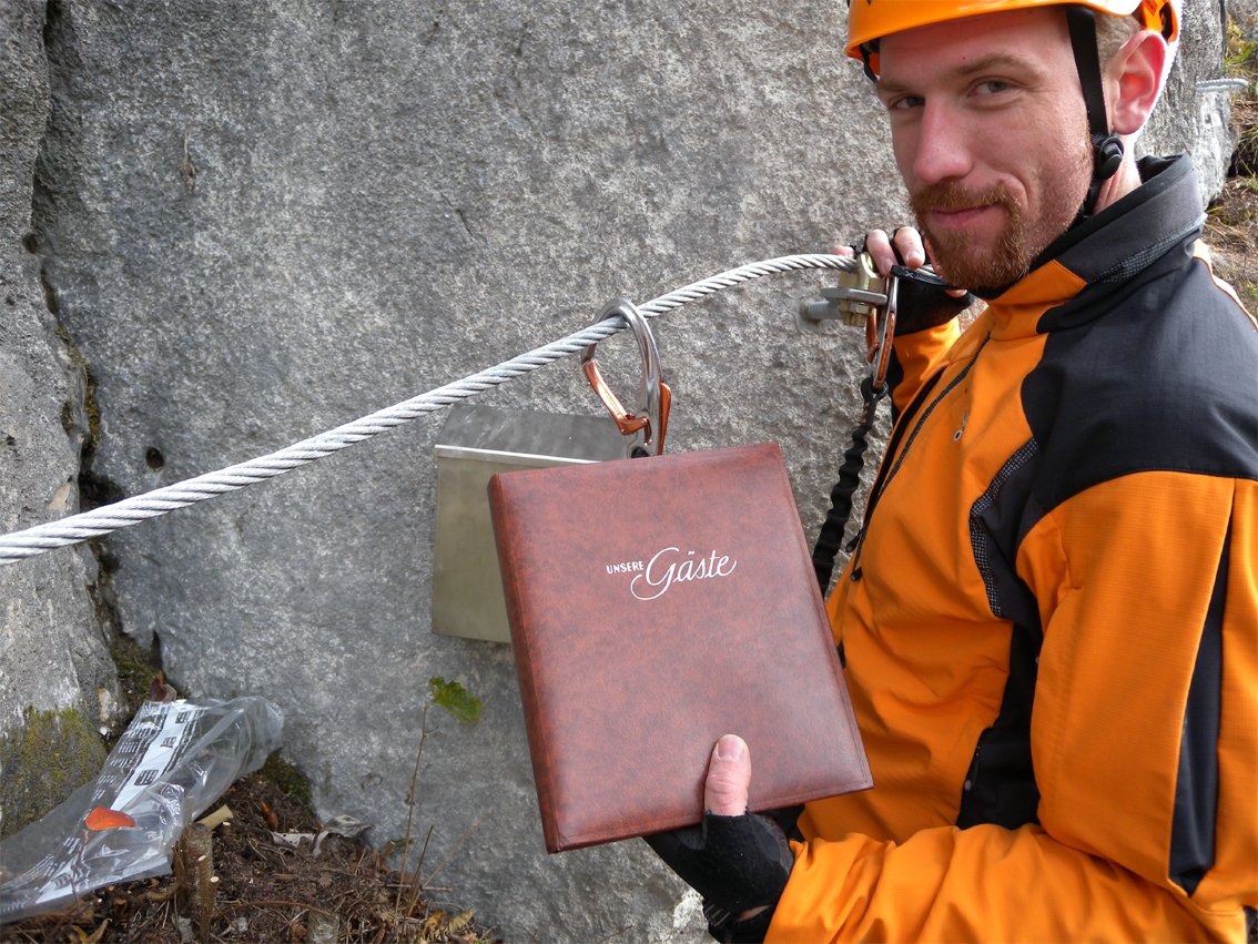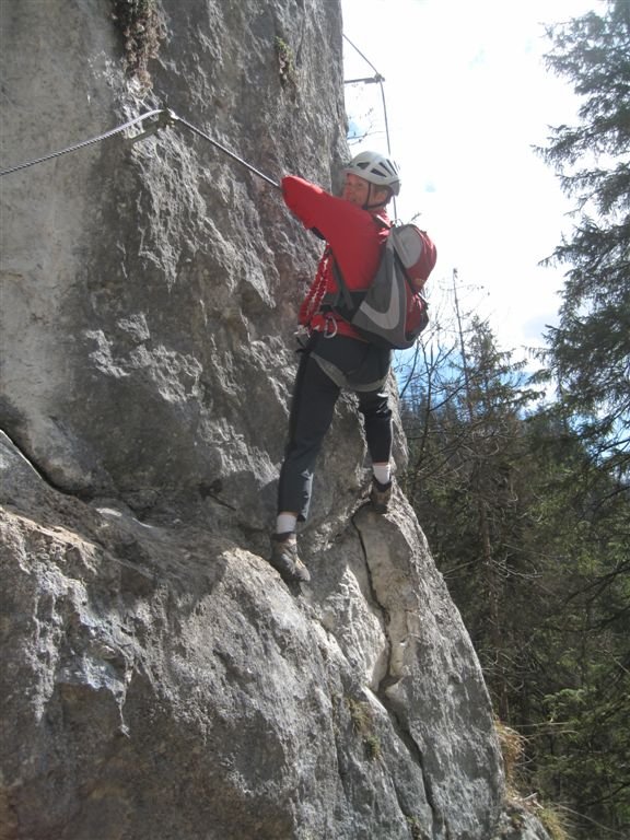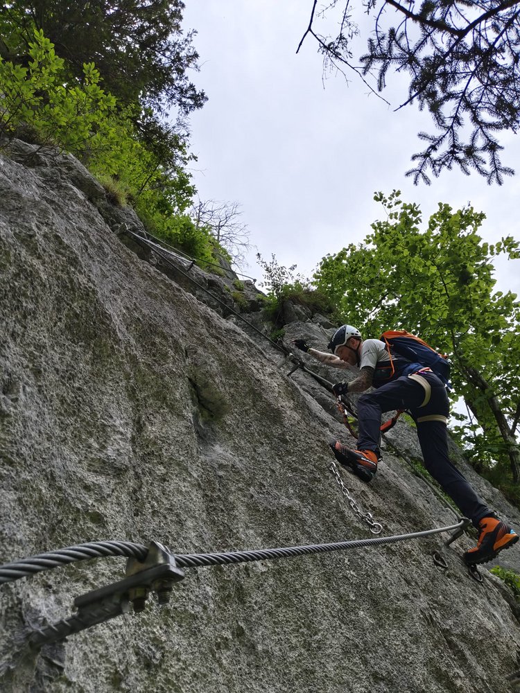 Kompl. Klettersteigausrüstung; für Schwächere ein Sicherungsseil.