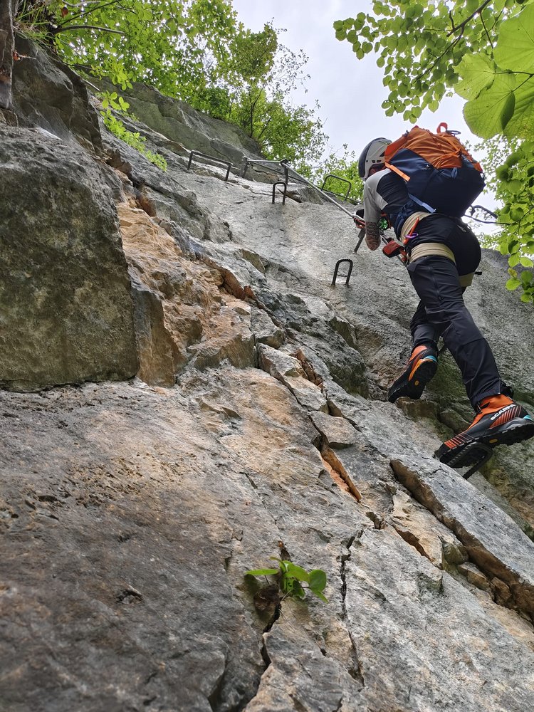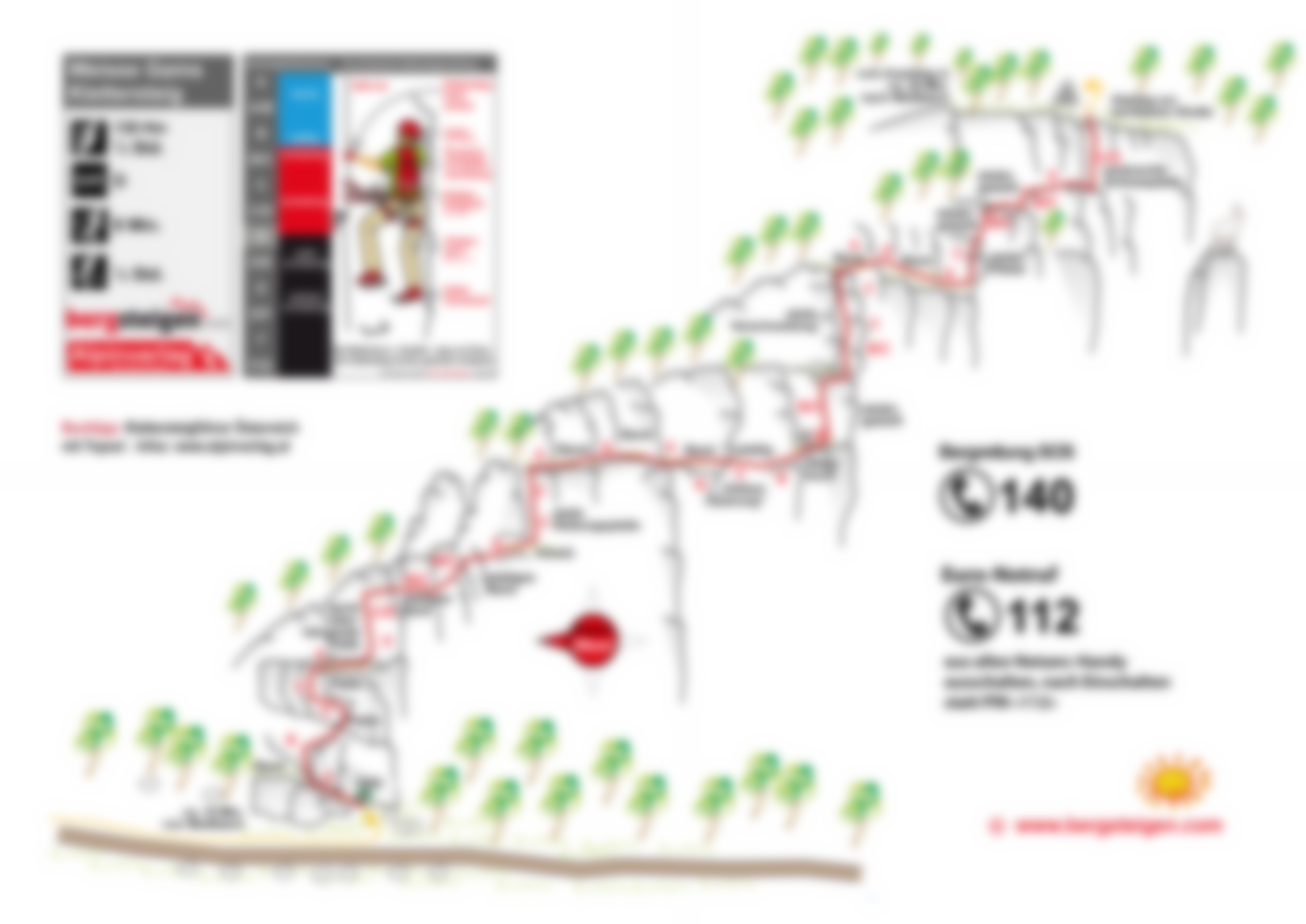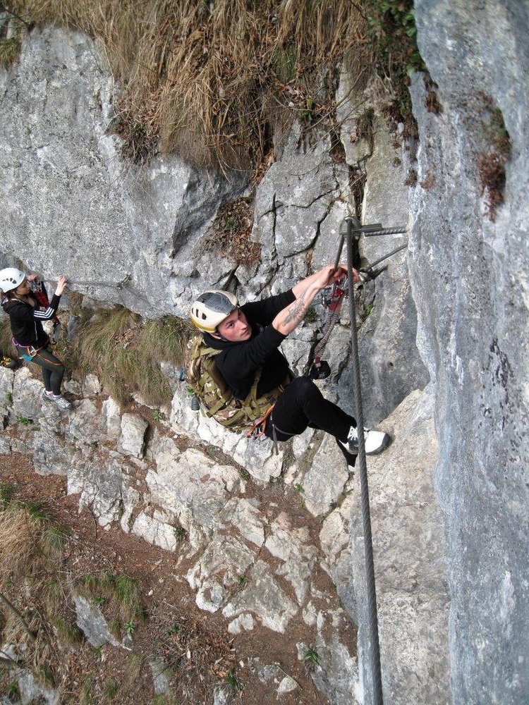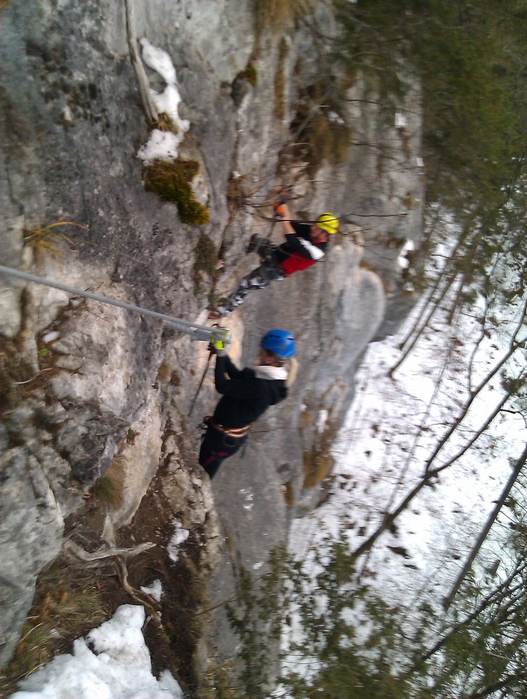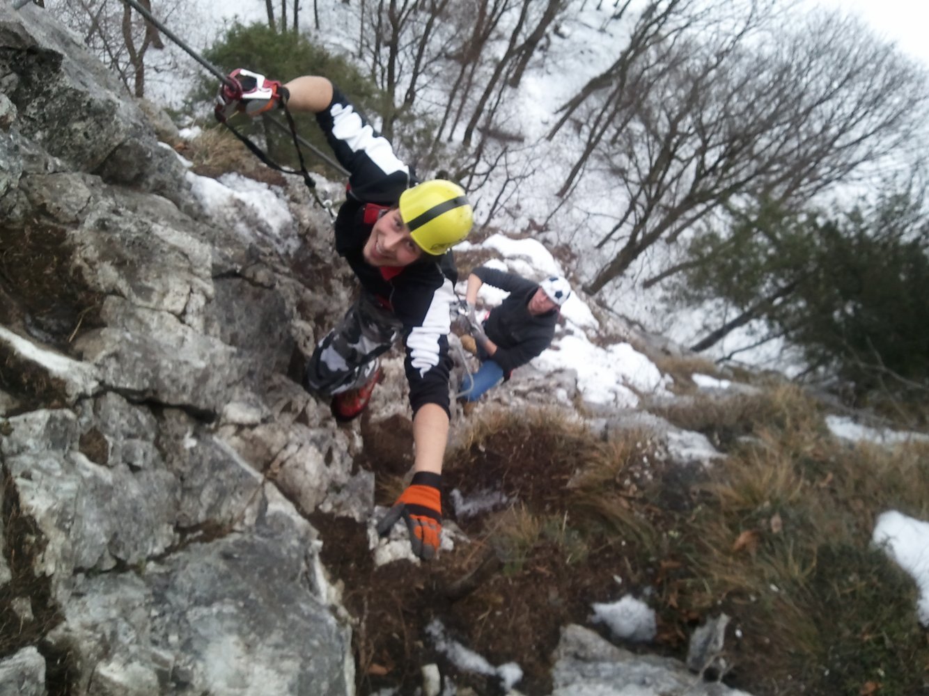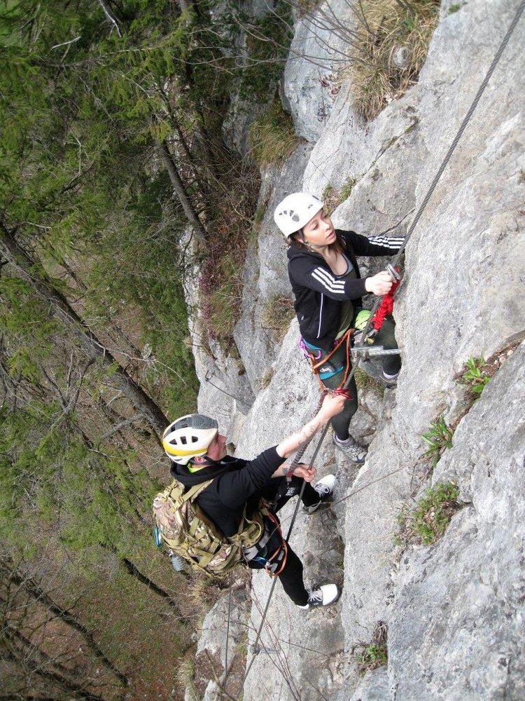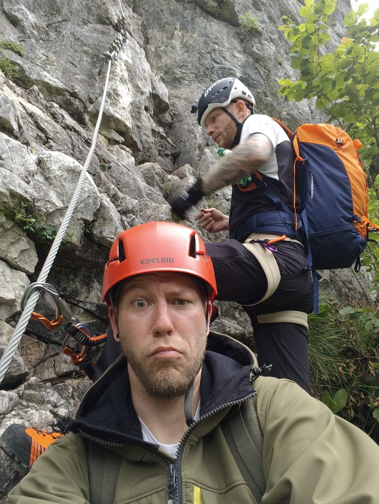 Kompl. Klettersteigausrüstung; für Schwächere ein Sicherungsseil.