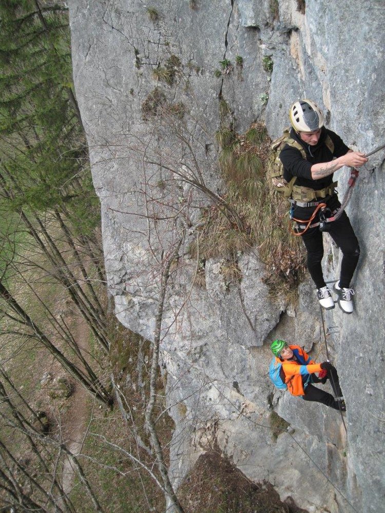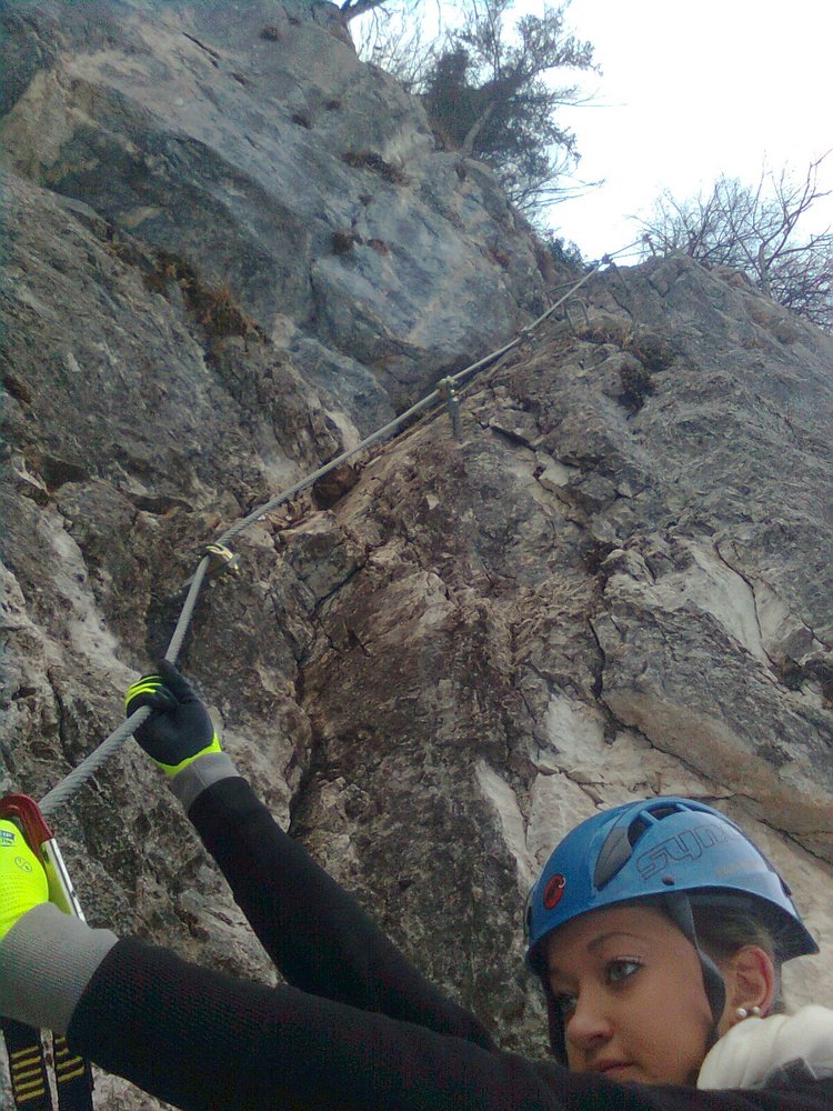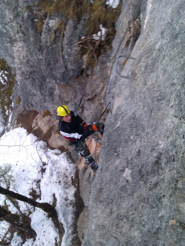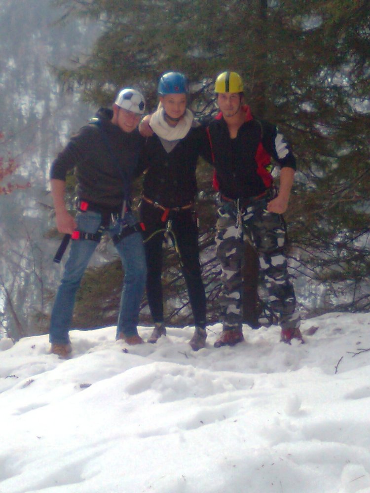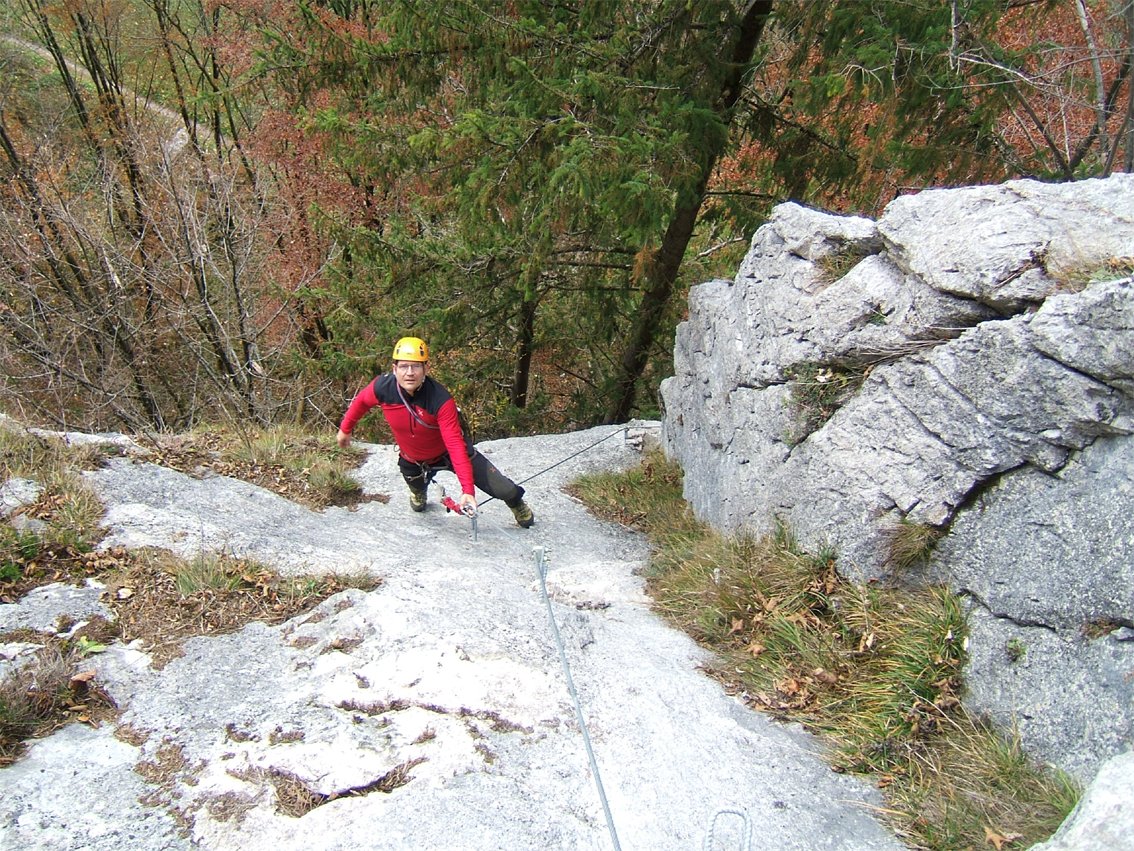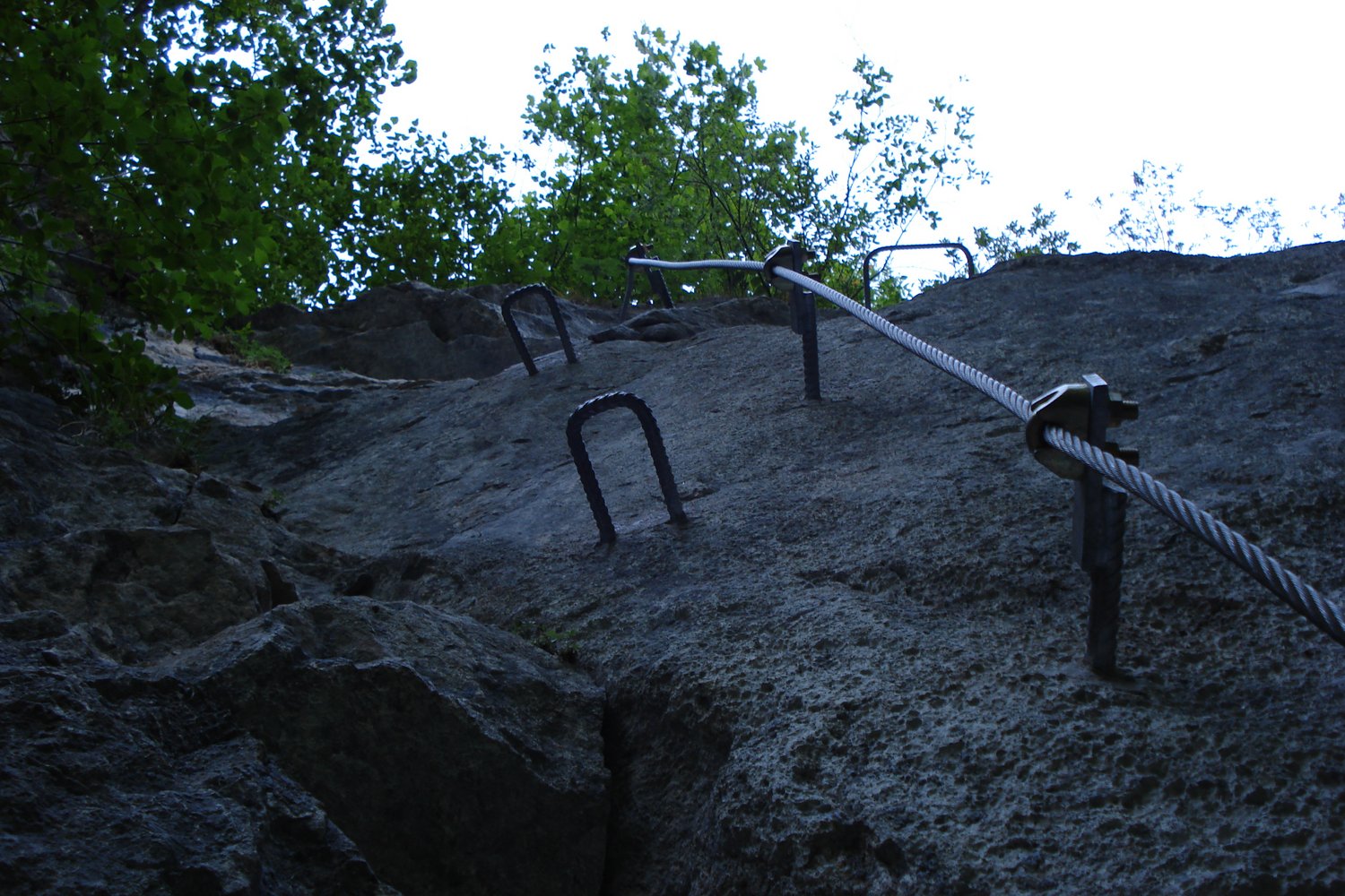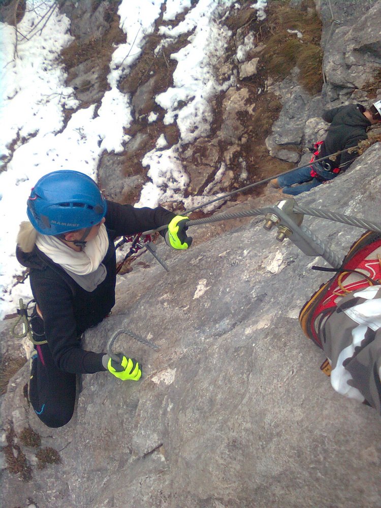 Kompl. Klettersteigausrüstung; für Schwächere ein Sicherungsseil.