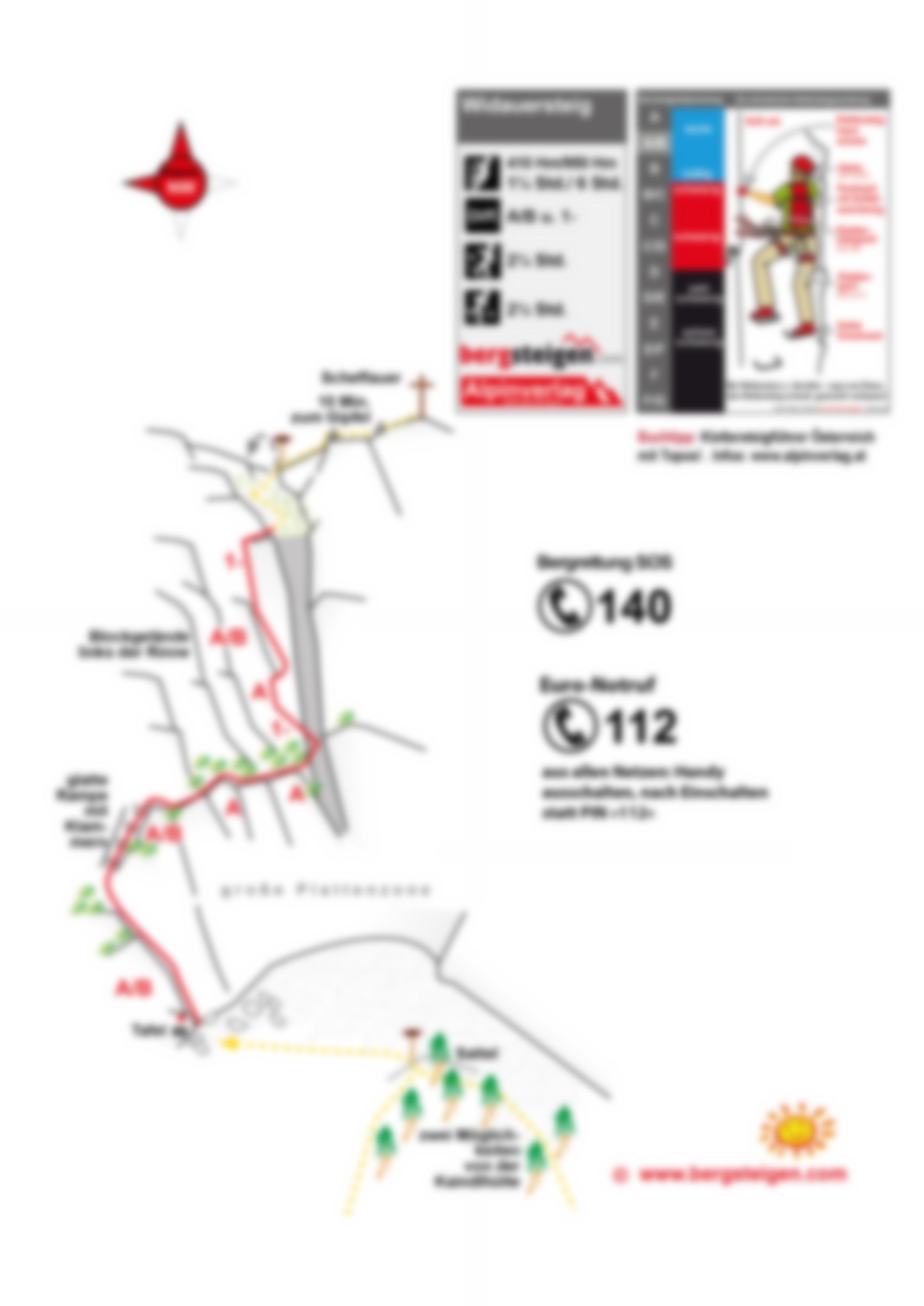 Der Steig verläuft links von einer Plattenwand (A/B), quert diese dann auf einem Bandsystem (A). Dann steigt man im Bereich einer markante Rinne (A und 1-) höher. Von deren Ende (Schild) gelangt man leicht auf den Gipfel.