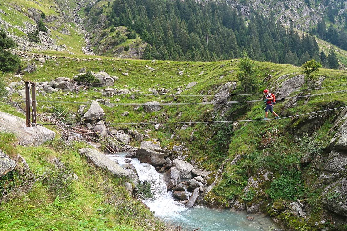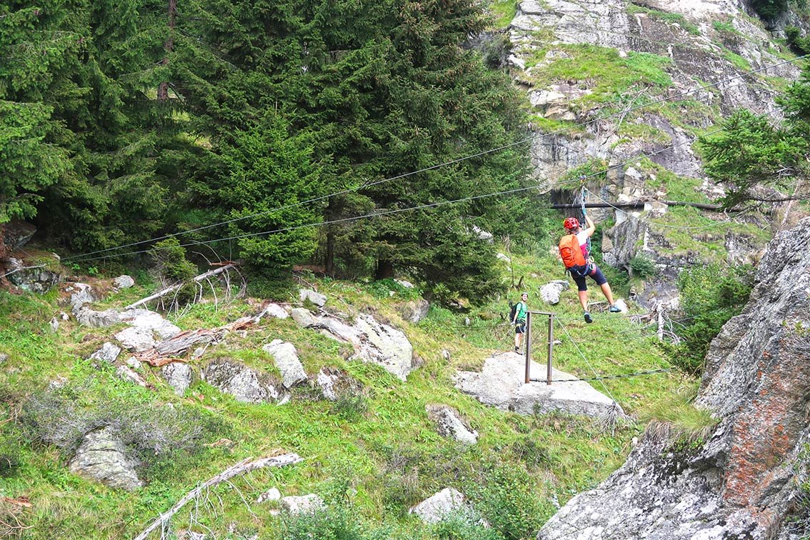 Achtung Flying Fox: Bei der Bachquerung gibt es die Möglichkeit, neben der Seilbrücke diesen mit einer Seilrutsche (Flying Fox) zu überqueren. Alle Utensilien sind vorhanden. Man hängt den Karabiner des Flying Fox (den vorhandenen Karabiner unten an der Kette) in den Anseilring des Klettergurtes ein. Die Hände NICHT hinauf an das Stahlseil (bei Bedarf nur an der Kette, etwas oberhalb des fixen Karabiners, festhalten)!