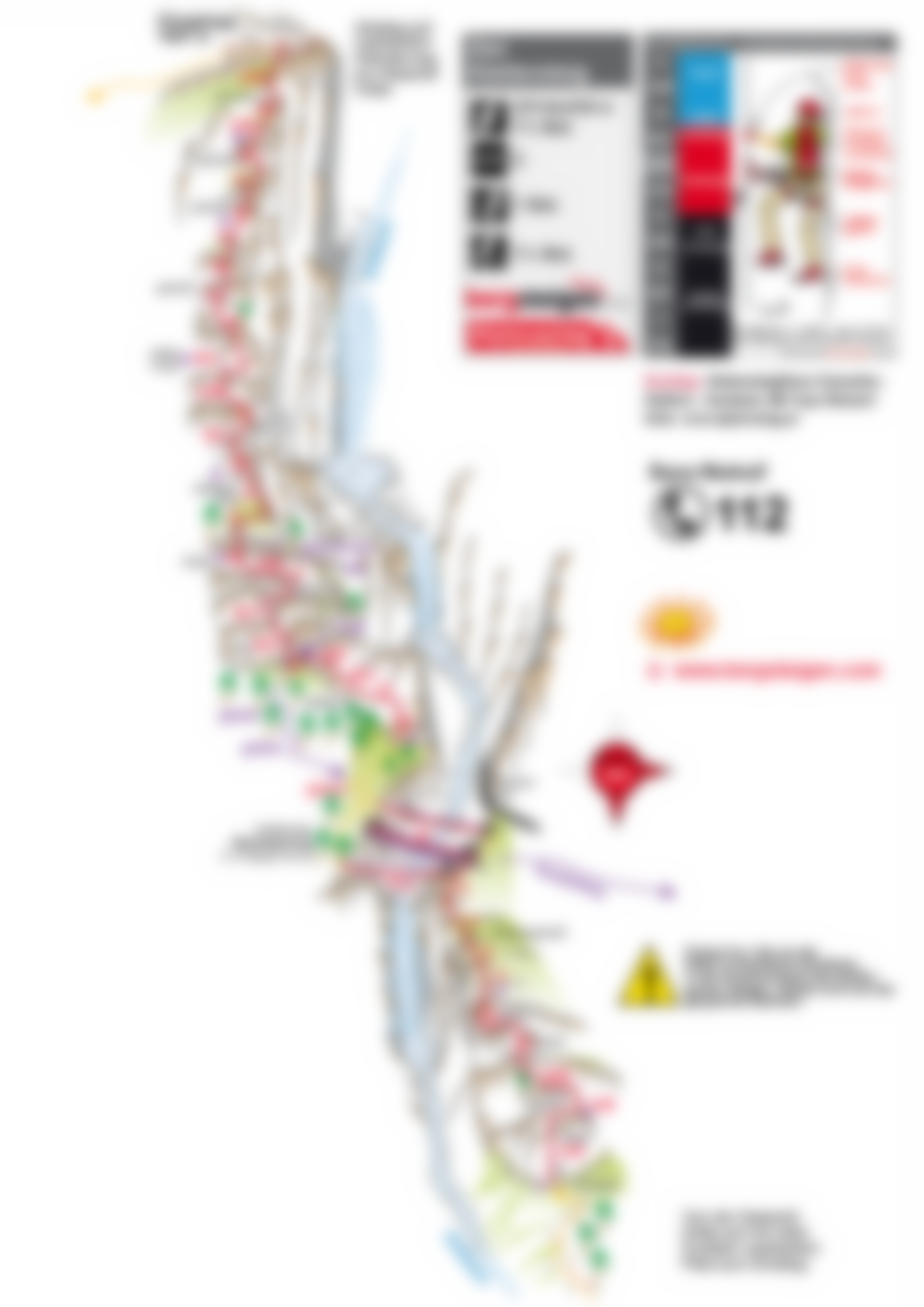 Siehe Topo: Die Schwierigkeiten des ca. 530 Klettermeter langen Klettersteiges liegen im mittleren Bereich der Ferrata – einige Passagen B/C, zwei Stellen C. Im Mittelteil gibt es einen Notabstieg (A/B).