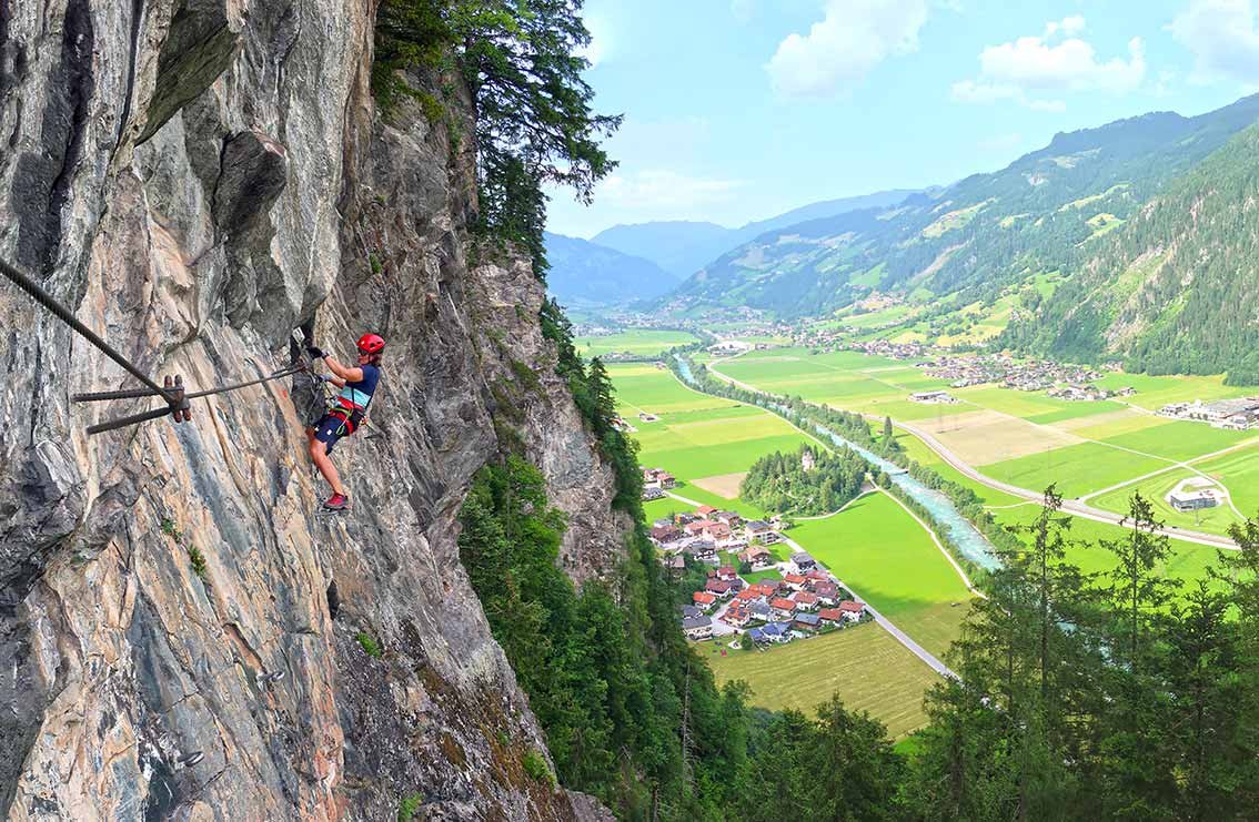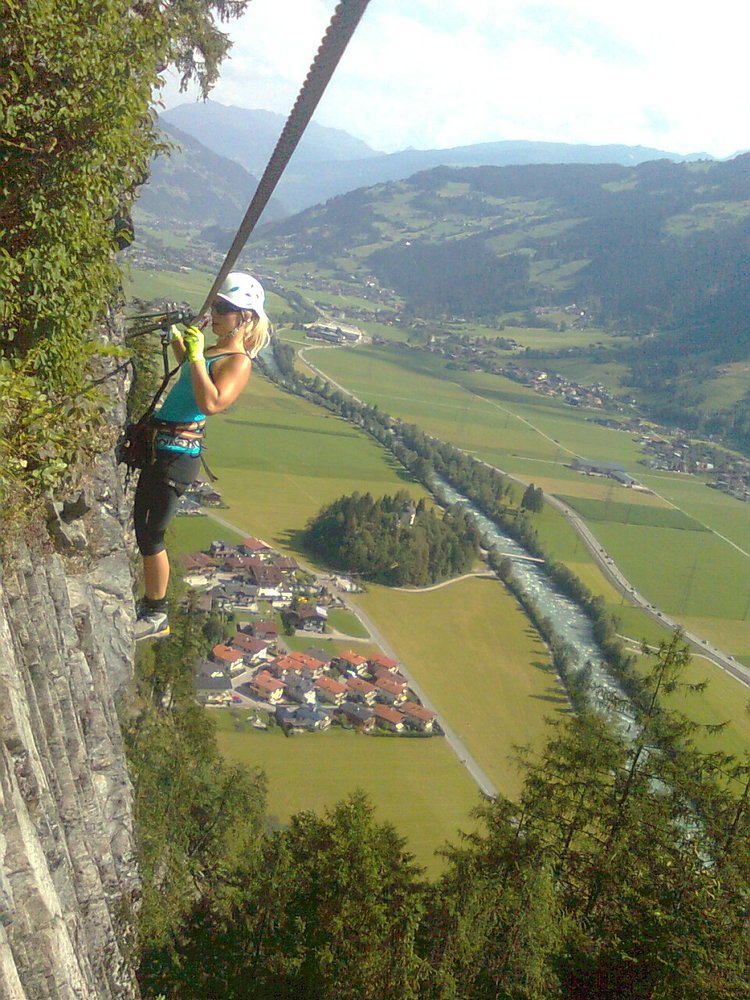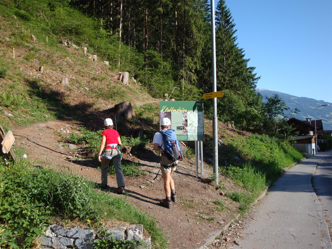 Wenige Schritte nördlich des Gasthofs Zillertal befindet sich eine ausführliche Infotafel. Dem Weg - vorbei am Huterlaner-Klettersteig - zum Einstieg folgen. Einstiegskoordinaten: N 47°10'28,4", O 11°51'38,0"