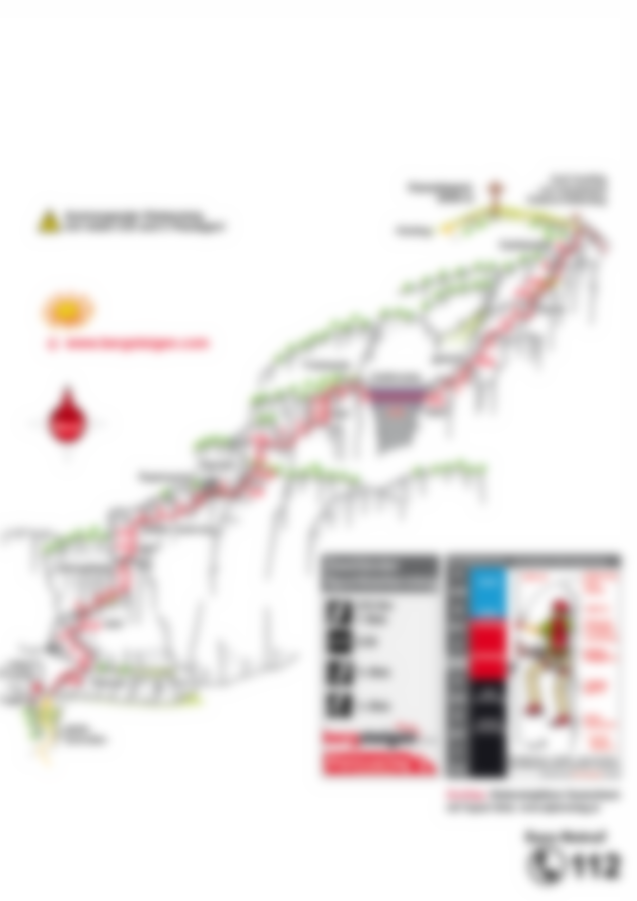 Von der Einstiegsrampe (A/B) zu einer Platte (C) und dann weiter an ein ausgesetztes Eck (C/D). Nach einem Band (A) steil (C) auf einen Absatz und eine senkrechte Wand (C/D) empor. In einer längeren, anstrengenden Querung (lange C) ansteigend zu einem Rastplatz (A). Über die Rampe (A/B) zur Schlüsselstelle des Klettersteiges in Form einer trittarmen senkrechten Wand (C/D). Nach einer kurzen Querung (C) wird die Seilbrücke (A/B) erreicht. Kraftraubend (C/D) weiter zu zwei Pfeilern (C) und einem überhängenden Felsblock (C). Nach einer Kante (C) gestuft (A/B) zur Gipfelplatte (B), danach wird der Ausstieg erreicht.