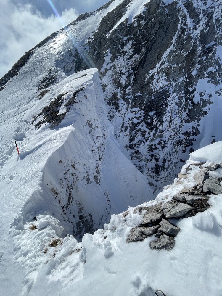 Von dort aus dem Grat folgend bis zum Einstieg in die Rinne kurz vor der 2. Handschuhspitze (auch hier sind die Hänge durchgehend >35° steil, es ist dementsprechend Vorsicht geboten, im Hochwinter oft Triebschnee, im Frühjahr oft Nassschnee).