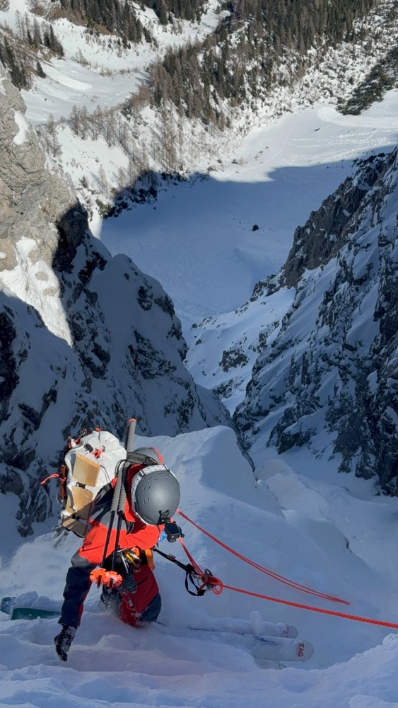 Beim Einstieg haben wir bei unserer Befahrung zwei Schlaghaken hinterlassen, die Einfahrt (ca. 55°) wurde gesichert eingefahren bzw. abgeseilt (hier Schneeverhältnisse sicher entscheidend, bei mehr Schnee ist eine direkte Einfahrt denkbar, dann aber sicher noch steiler). Am Einstieg unbedingt die rechte Hälfte der Rinne befahren!