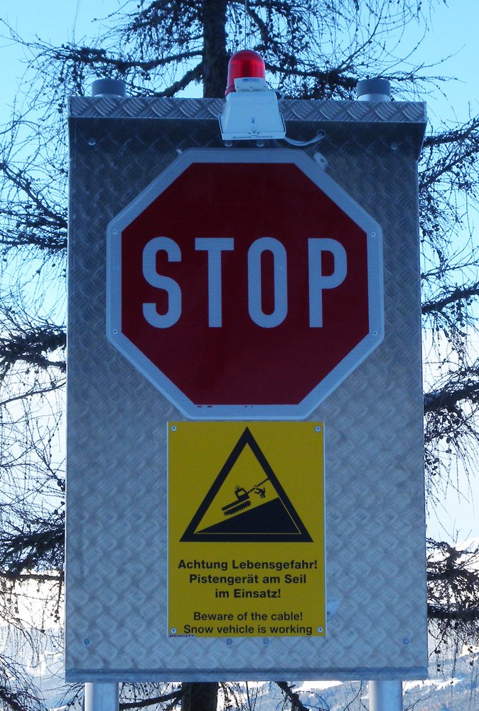 Am Rand der Skipiste gehen und nicht zu Pistenpräparierungszeiten (Warntafel mit Blinklicht bei Seilwindenpräparierung) aufsteigen.