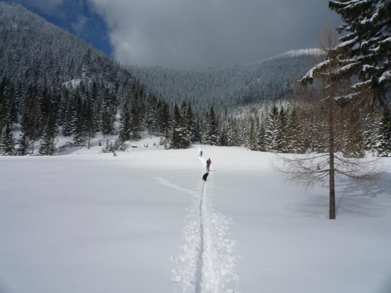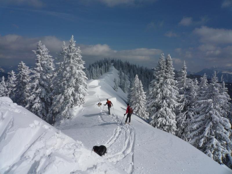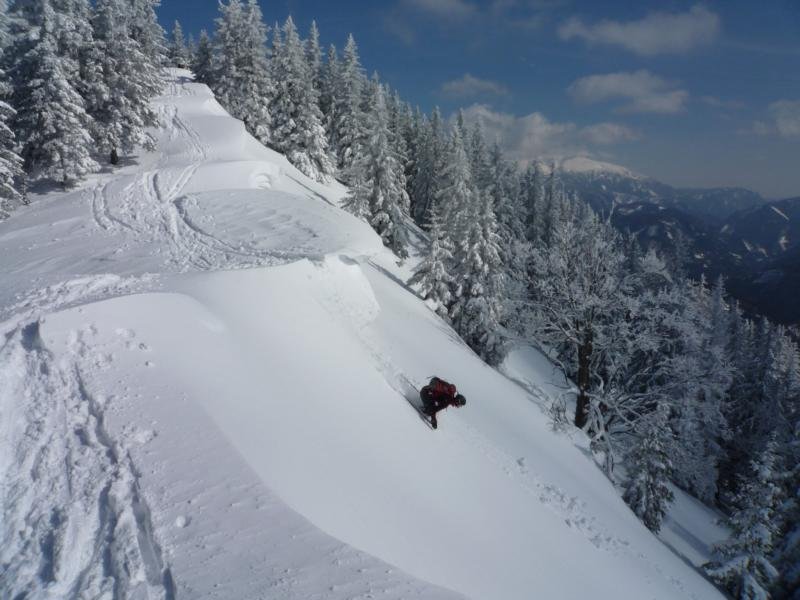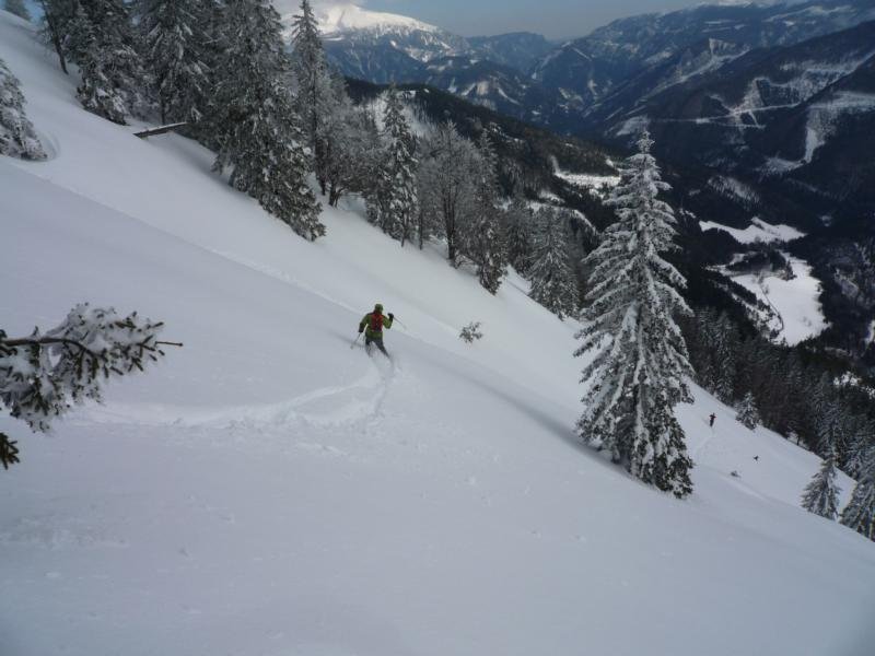 Vom Bärenköpfl führen zwei flache freie Rinnen bis zum Schlagerbauer und bieten eine schöne Alternative zu den gutbesuchten Nachbarbergen Perschkogel und Lahnberg.