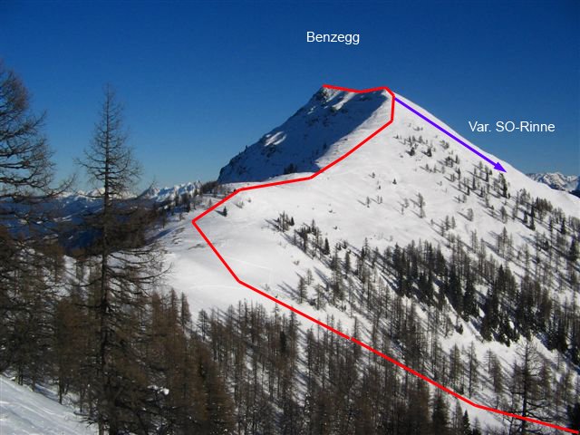 Abfahrt: Wie Aufstieg. Vom Benzegg kann bei sicheren Verhältnissen direkt durch die nach Südosten ausgerichtete, baumfreie und steile Flanke zur Ranstlalm abgefahren werden. Vom Schilchegg zuerst nordostwärts über freies Gelände, dann durch lichten Wald bis man auf einer Lichtung wieder auf die Aufstiegsroute trifft, dann weiter wie Aufstiegsweg.