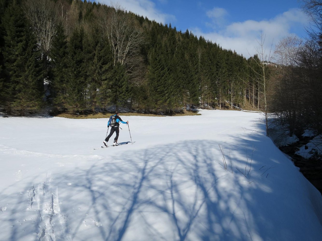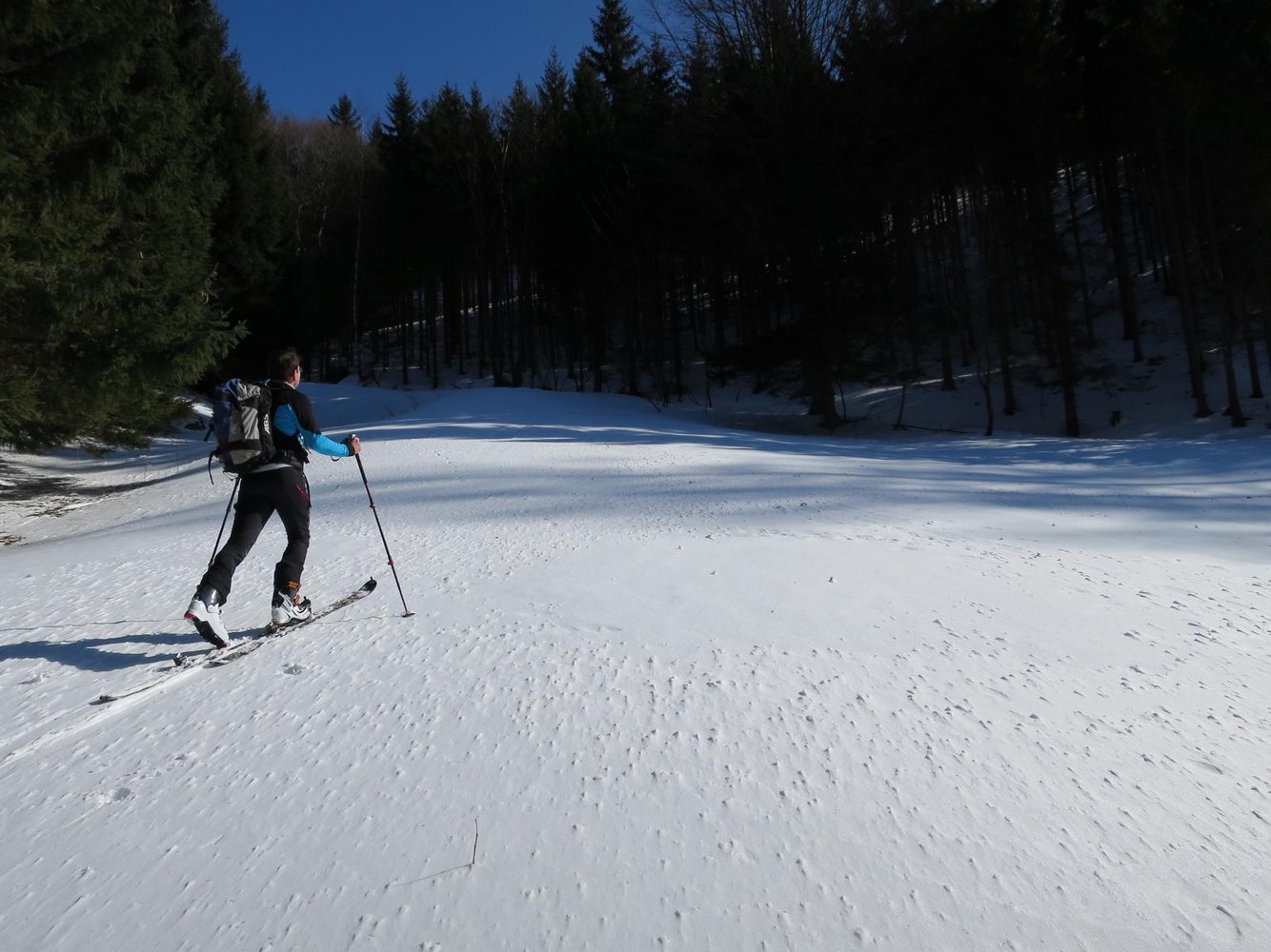 Abfahrt: Wie Aufstieg, am Ende des schönen Schlages im Steinbachgraben nicht zu tief in den Grabengrund sondern über der letzten Forststraße bereits die Rechtsquerung zur Jagdhütte beginnen.